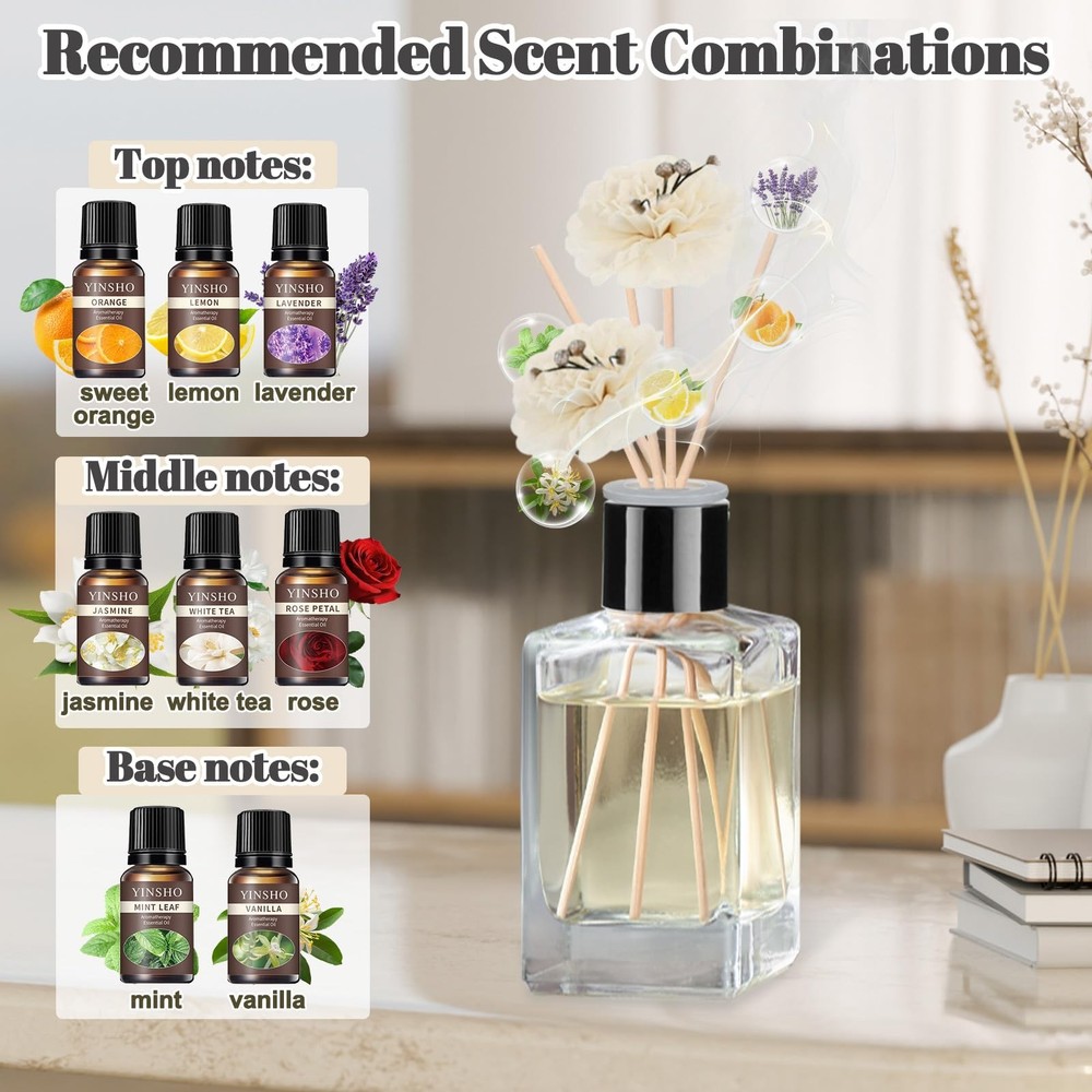 DIY Reed Diffuser Making Kit- Reed Diffuser Making Set with Essential Oils, Flower Reed Diffuser Sticks, 50ml Empty Diffuser Bottle, Home Fragrance Reed Diffuser Gift for Men & Women Craft Your Signature Reed Diffuser: Make your own luxurious diffusers for home! The fragrance diffuser set includes: 1x sweet almond oil, 8x essential oils, 3x glass bottles, 20x reed diffuser sticks, 2x floral reed diffuser sticks, 2x funnels, 2x measuring cups, 2x stirring sticks, 2x gloves, 1x instruction manual and 1x exquisite packaging. Discover the joy of creating personalized scents that reflect your unique style - a truly rewarding creative experience. The Art of Diffuser Scentmaking: Enjoy our essential oils that delicately scent your space for 4-6 weeks. Mix and match our collection of 8 essential oils for diffusers for home to create your perfect aroma: Top Notes: Orange, Lemon, Lavender. Middle Notes: Jasmine, White Tea, Rose. Base Notes: Peppermint, Vanilla. Aroma diffuser isn't just a craft project - home fragrance products is a sensory journey of self-expression and artistic creation. Premium Glass Bottles & Adjustable Scent: 1.7 oz clear glass diffuser bottle crafted with premium-quality glass and durable components, featuring a minimalist design perfect for home use. Reed diffuser set easily customize your fragrance intensity by adding or removing diffuser sticks. For best results, flip the reeds 2-3 times weekly to refresh the scent distribution. Scent Every Space: Dream of a home filled with perfect home fragrance products? DIY diffuser making kit system enhances every environment: bathroom decor, bookshelf decor, hotel collection diffuser, bathroom shelf decor, entryway table decor, room diffuser, bedroom decor, home scent, living rooms, offices. Transform your space into a fresh, peaceful retreat with our long-lasting, mood-boosting fragrances. Best Girls Gift: When you are worried about what gift to give, our DIY reed diffuser set can always impress people. Our indoor fragrance set uses elegant packaging, which is perfect for creating atmosphere on important occasions and festivals. It can be used as a female gift, a teenage girl gift, a perfect gift for mom, Mother's Day gift, Christmas gift, birthday gift, Valentine's Day anniversary gift for women, adults, friends or yourself.
