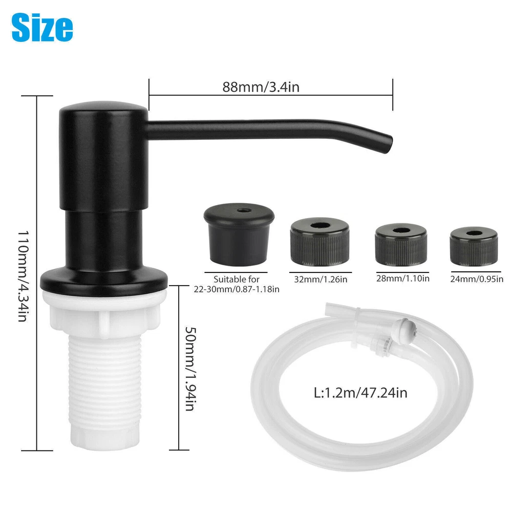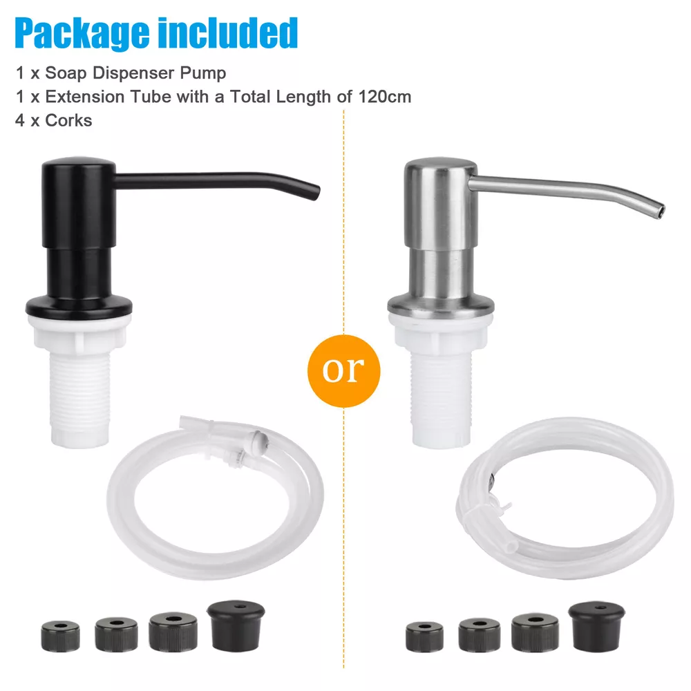 Support & Share Product Features ✨ Suitable for Most Kinds of Bottle Necks : Four kinds of bottle stoppers fit almost all soap bottles. Suitable for 0.65inch to 1.42inch bottlenecks . And it includes virtually all soap bottles and doesn't drip. ✨ High Quality and Modern Design : Brass Brushed Nickel soap dispenser pump and head with metal nut, making it not easy to wear and tear, 47inch Food-Grade silicone tube is soft and elastic, which makes the soap flow out smoothly. ✨ No More Messy Refills : No more crawling under the sink. Our elegant soap dispenser comes with a tube directly into a large dish soap bottle, you can skip the frequent refill process. ✨ Easy To Install : No plumber is required, finishing DIY installation only takes a few minutes. And enjoy your new style soap dispenser. Product Specification Type Soap Dispenser Pump Material Stainless Steel+Plastic Water Pipe Length 1.2m/47inch Hole Size Range 0.98-1.37in Soap Bottles Size 0.65 - 1.42 inch Table Thickness 1.37in Mounting Recessed Features Easy to Refill Room Bathroom, Kitchen Color Black/White Number of Items in Set 6 Package Included 🎁 1 x Soap Dispenser Pump 🎁 1 x Extension Tube with a Total Length of 120cm 🎁 4 x Corks Location Description To improve your buying experience and ensure fast delivery, Your order will be shipped from the warehouse located in either new jersey or california that is closest to your address. If you have any questions, Please contact us. Thank you for your support !