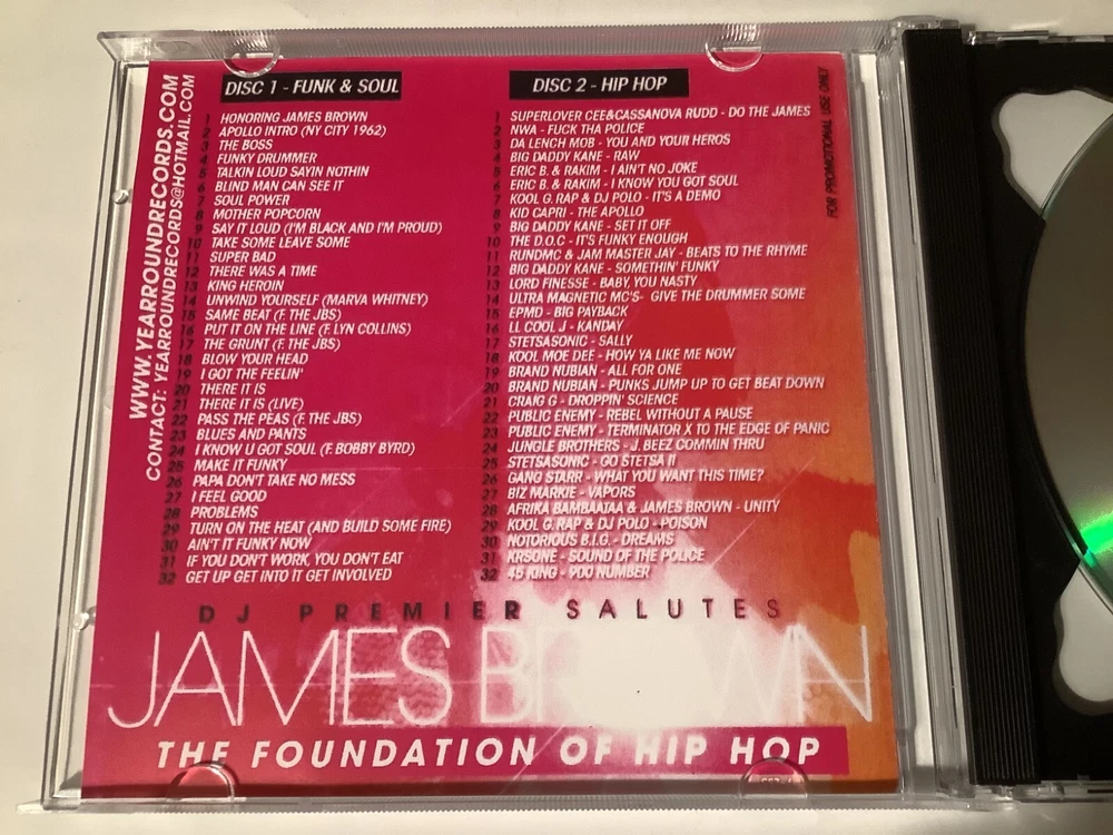 Rare DJ Premier Salutes The Godfather of Soul James Brown The Foundation Of Hip Hop 2 disc set, disc one features all of the best JB jams mixed up proper, disc two features classic hip hop tracks featuring JB samples also mixed up properly. CDrs, insert and double jewel case are like new, discs have been tested all the way through and play perfectly. No extra shipping charge for additional purchases.