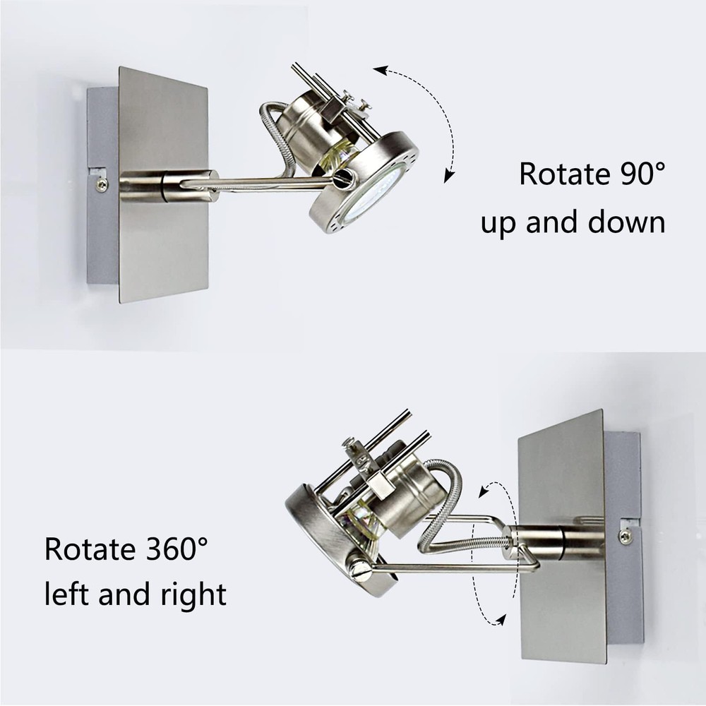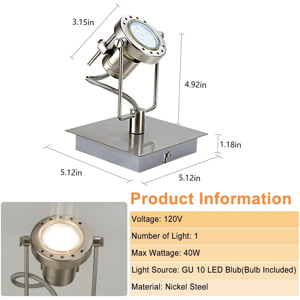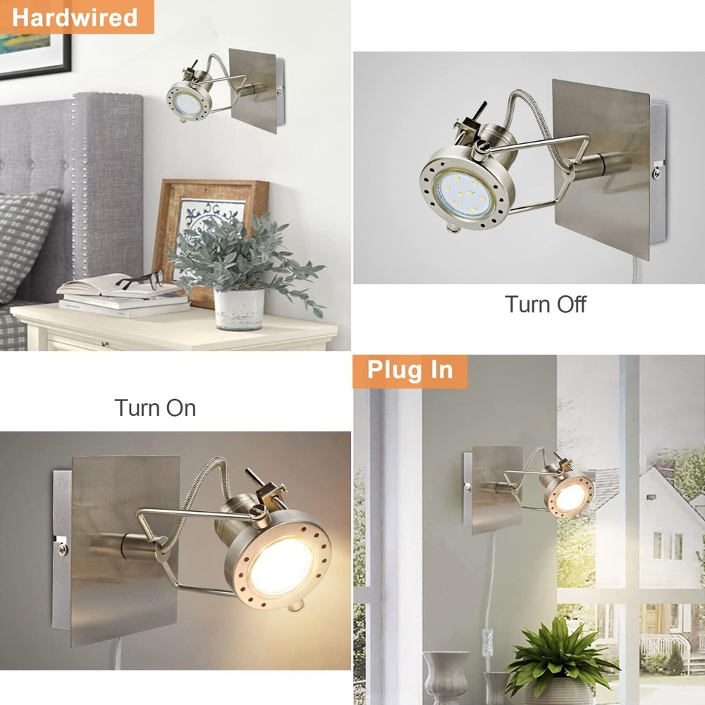 Why choose our mini track lighting? 1.Adjustable contemporary track-style This contemporary lighting fixture is adjustable meaning you can truly customize the lighting in your space.It can be rotate 360-degrees and 90-degree tilt. 2.Energy-Saving 1*Led GU10 LED Bulb bulbs gives of a soft glow,create a romantic and comfortable atmosphere for your sofa,picture,bedside,bed headboard,stairway etc.Cut down your electricity bill up to 85% by replacing 10W Halogen bulb with 3W LED Bulb. 3.Easy Install Just mount on your wall or ceiling, plug in and cover the cord to get started. Specification: Power:3W Power source:Plug-in Voltage:86-265V/50-60Hz Light source:Gu10 led bulb CRI:>85 Color temperature:3000K/warm white Material:nickel steel Package: 1x GU10 led bulb 1x User manual 1x LED adjustable track lighting Heat Dissipation: The lamp holders back hole design can be dissipate heat faster,prolong lifespan of the wall lamps. Light output with no heat to worry about Adjustable Track Heads: Flexible wall sconces head can point almost anywhere needed,it can be rotate 350-degrees and 90-degree tilt. Adjust the track-style light as desired to place light just where you need it Easy Install: Just mount on your wall or ceiling, plug in and cover the cord to get started.It’s perfect for creating a atmosphere in bedroom,kitchen,bathroom,sofa,hospitality,shop,bar and more.(Wire length:5.41ft,Tips: Our spot wall lamp comes with a plug,you can also connect the wires directly,just cut the cable & plug) Energy Saving: 3W soft warm light GU10 LED Bulb(bulb included) provides 240 lumen,it can last for 50,000 hours,saving over 80% electricity bill.And help you save the cost of frequent replacement of bulbs Friendly After-Sales Service: Factory sales, the assurance of quality, economic and affordable. Replacement or refund will be provided if you contact to us