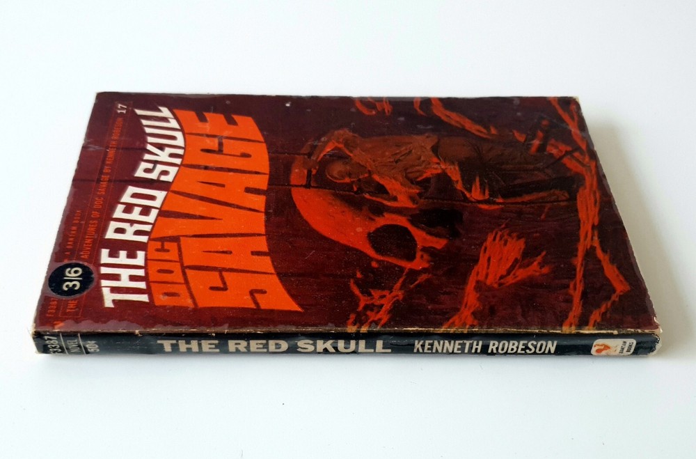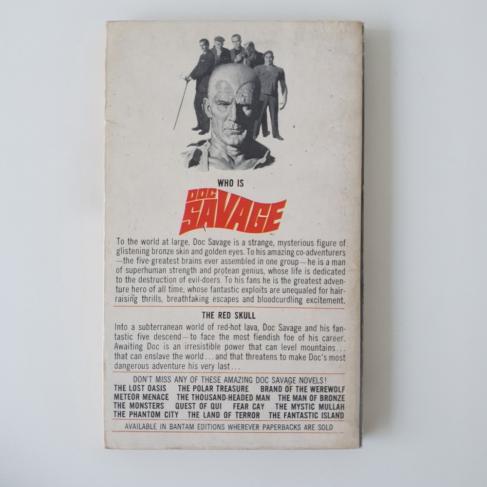 This is a 1967 softcover edition of "DOC SAVAGE #17: THE RED SKULL" by Kenneth Robeson, published by Bantam in the United States. The book belongs to the "DOC SAVAGE" series and features the character family of DOC SAVAGE. The cover is printed in foil.