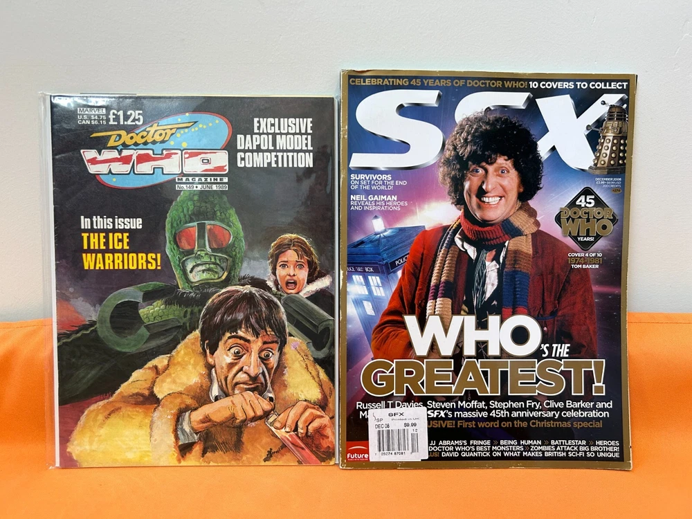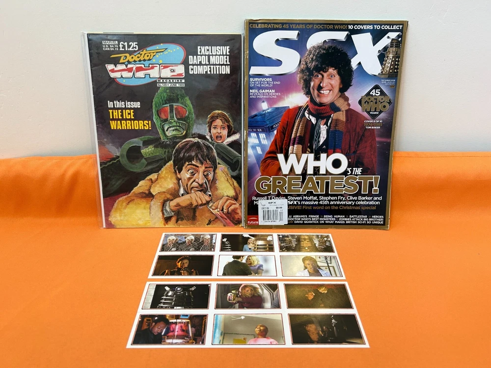 This auction is for a DOCTOR WHO VINTAGE MAGAZINE and STICKER LOT! Lot includes : Doctor Who Magazine (Marvel Comics) #149 from 1989 SFX Magazine #176 w/Tom Baker cover from 2008 Two (2) uncut sheets of Doctor Who Merlin brand stickers from 2004 Magazines are in FN/VF condition by comic book standards. Stickers are in LIKE NEW condition. Shipping in the US will be $5 for Standard/Media Mail. Payment is expected within 3 days of the end of the auction. We currently ship once a week, usually on Thursdays. Handling time is currently set at 5 days to reflect this, but depending on when auctions close and when payment is made we often ship much faster. Thanks in advance for your patience! This item is part of the inventory at Now Or Never Comics in San Diego, CA. Buyers are welcome to pick items up in store to save on shipping. We are open from 11am to 7pm, Monday through Sunday. Feel free to contact us if you have any questions, and we'll get back to you as quickly as we can. Be sure to check out our other auctions for more comic books, toys, video games, posters, signed items, convention exclusives, out of print items, and more! BOX #UT16