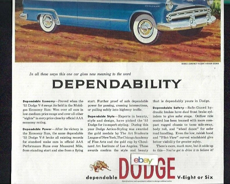 THIS IS AN ORIGINAL COLOR 1953 LARGE FORMAT MAGAZINE AD FOR THE DODGE DIVISION OF CHRYSLER AUTO CORP .IT IS IN EXCELLENT CONDITION,MEASURING 10" X 12.5".. .. DEPENDABILITY. .. .AD SHOWS CORONET V8 4 DOOR SEDAN IN BLUE & WHITE TOP ... ..POSTAGE ON 1 AD IS HTE SAME AS FOR 100....PLEASE VISIT MY E-BAY STORE.... NOSTALGIA AIRWAYS .. .