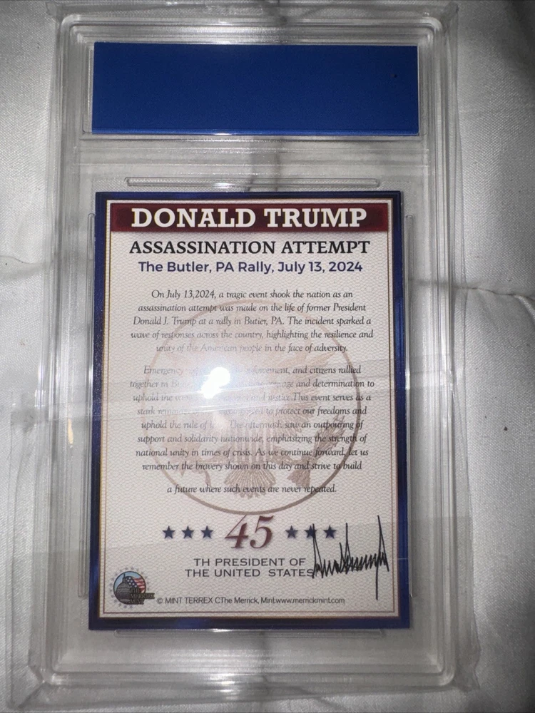 This official trading card features a rare photo of the 45th US President, Donald Trump, and is a must-have for any collector. The card is made of high-quality polyflex and card stock materials, with a standard size that makes it easy to store and display. The card is graded WCG 10, ensuring its authenticity and quality. It features the title "Assassination Attempt" and showcases the iconic character of Donald Trump. This non-sport trading card is an original, licensed reprint that was manufactured in the United States. It is a great addition to any collection and a perfect way to commemorate the presidency of Donald Trump.