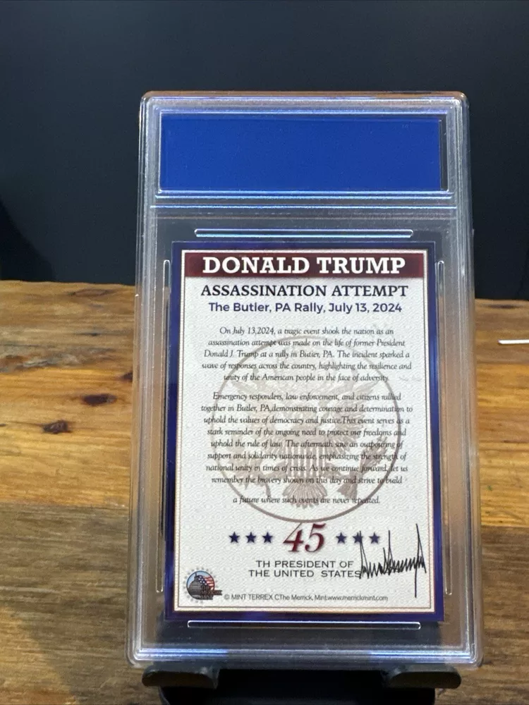 This is an official trading card featuring Donald Trump, the 45th US President. The card is made of polyflex and card stock materials, with a standard size and English language. It is a non-sport trading card that features an assassination attempt on the president. The card is slabbed and has a WCG 10 rating. The Polychrome Flex card is an original, licensed reprint that was manufactured in the United States. It is a great addition to any collection of non-sport trading cards, especially for those who are interested in collecting cards featuring Donald Trump. This card is a must-have for any serious collector and is sure to be a valuable part of your collection.
