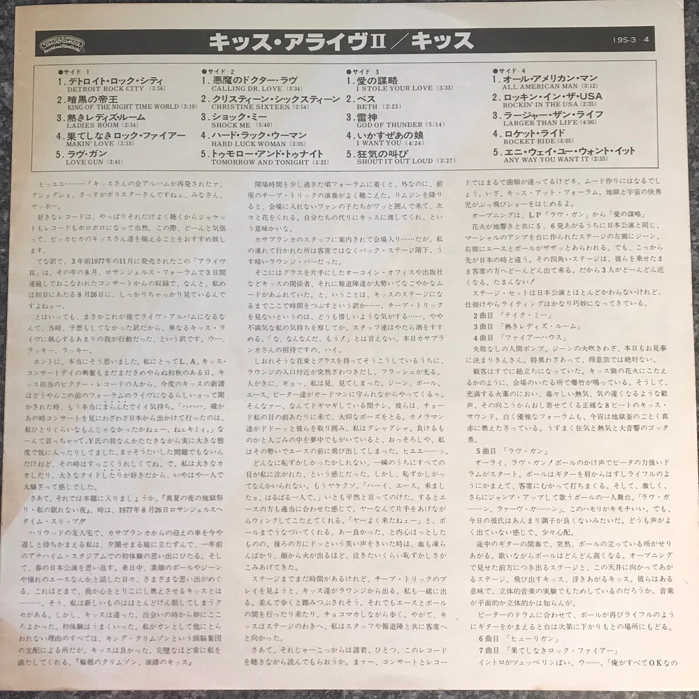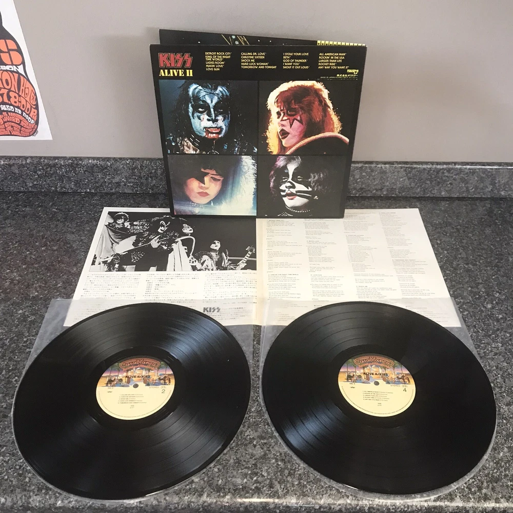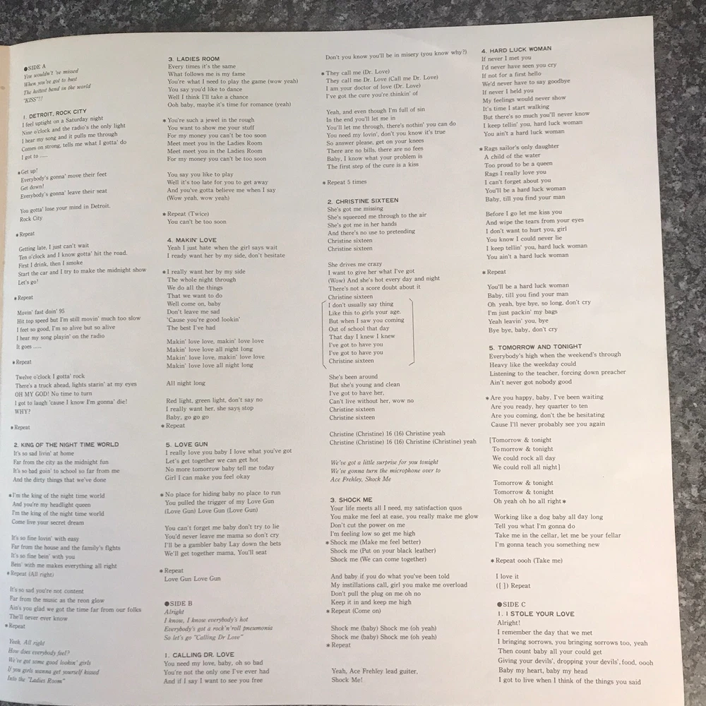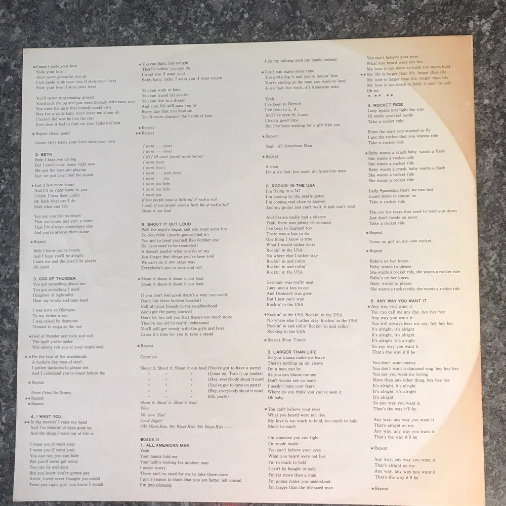 Track List A1 Detroit Rock City 3:45 A2 King Of The Night Time World 3:05 A3 Ladies Room 3:30 A4 Makin' Love 3:15 A5 Love Gun 3:30 B1 Calling Dr. Love 3:15 B2 Christine Sixteen 2:45 B3 Shock Me 4:30 B4 Hard Luck Woman 3:00 B5 Tomorrow And Tonight 3:30 C1 I Stole Your Love 3:25 C2 Beth 2:20 C3 God Of Thunder 5:10 C4 I Want You 4:20 C5 Shout It Out Loud 3:21 D1 All American Man 3:12 D2 Rockin' In The USA 2:35 D3 Larger Than Life 3:58 D4 Rocket Ride 4:06 D5 Any Way You Want It Sleeve Insert and inners excellent condition placed in a sealable clear sleeve new poly lined inner added. Labels clean near mint. Vinyl is also clean excellent plus superb audio nice copy. Please see images as they form an important part or the item description. Pro cleaned. We combine postage on all multiple orders to reduce shipping costs to all our customers outside of the UK. Written-By – D. Clark * 2:33
