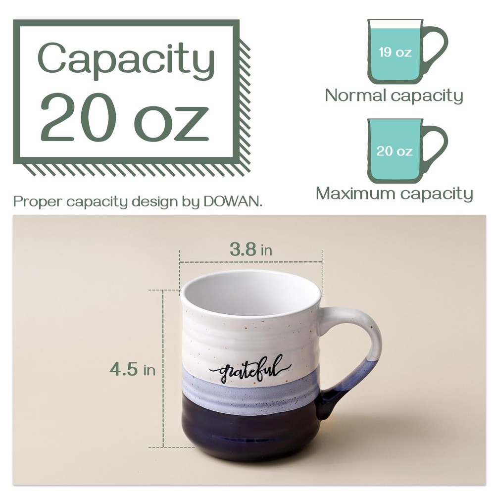 coffee mugs blessed grateful mug set of 2 thank you gifts for women men large ceramic porcelain big 18 oz Christian tea latte cup couple parents friend wife husband boss coworker teacher church birthday holiday mom dad 20 Ounce Large Blue Coffee Mug. Thoughtfully designed to meet all your needs, perfect for your daily coffee, tea, milk or any preferred drink. Great Gift Choice. Coffee mugs with words "blessed" "grateful". A thoughtful thank you gifts to show your gratitude for mother father her him coworker couple friend Christian. Chip Resistant & Dishwasher Safe. Designed with strong thick ceramic, made of lead-free, cadmium-free, high quality ceramic. Suitable for hot and cold drinks. Dishwasher and microwave safe. Easy to Hold. The big handle can keep tea mug from rotating when you try to hold the mug, which helps you enjoy your tea and coffee comfortably. Big coffee mug with big handle. Unique Glaze of Assorted Colors. Meticulous design is special for usual holiday gift for family, couple, husband, wife, father, mother, grandma, grandpa, friend, girlfriend, boyfriend.