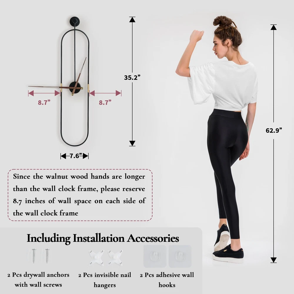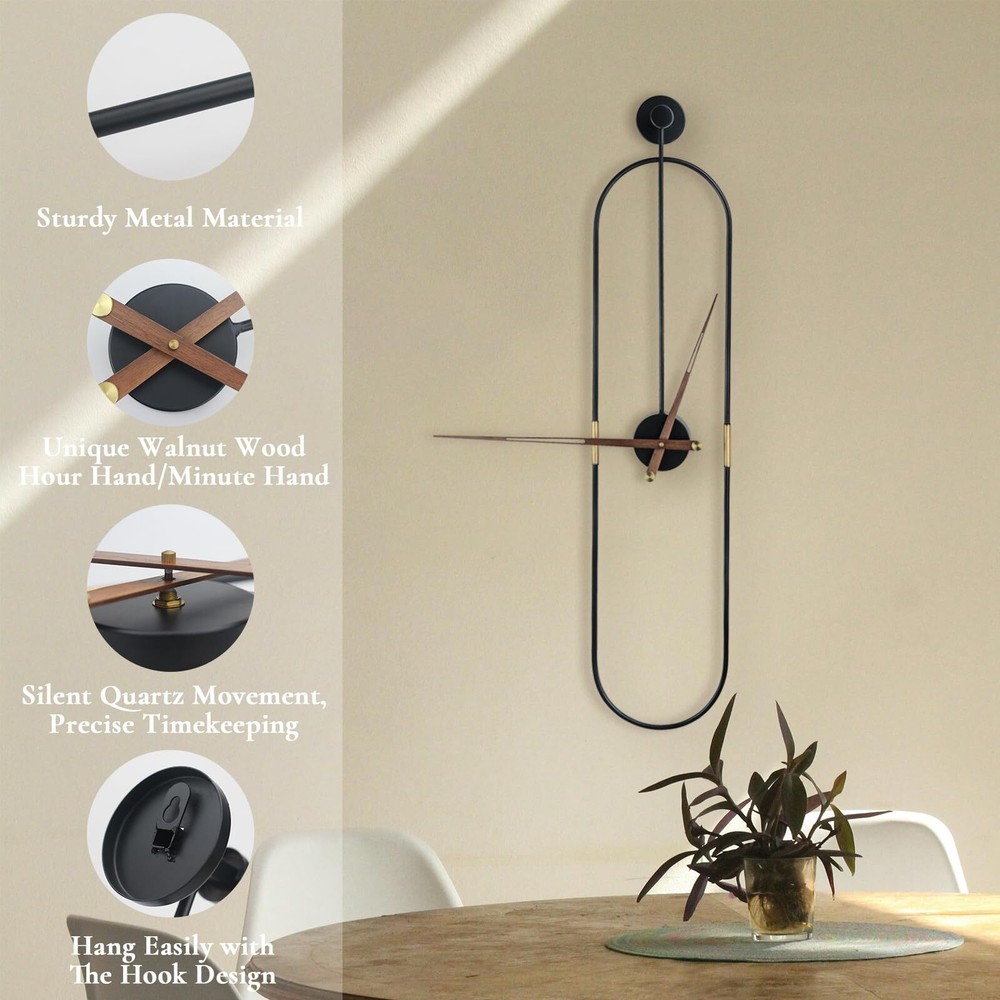 DRELIFAM metal wall clock serves as an elegant addition to your home or office decor, infusing your space with an understated elegance. Question & Answer: 1.Q: Is the metal wall clock heavier than the other large wall clocks? A: The metal wall clock is made of lightweight metal, so it's easy to pick up,and it will not cause any burden on the wall. 2.Q: Is the wall clocks will keep accurate time ? A: DRELIFAM oval wall clock feature silent quartz movement that accurately keeps time. 3.Q: Is the wall clock easy for mount on my home? A: There are three kind of accessories included in the kit can accommodate the clock's installation on various walls. a: Adhesive wall hooks : No need to drill holes. It is the most convenient one b: Invisible nail hangers: Easy installation, less damage to the wall and relatively stable c: Drywall anchors with wall screws: The highest stability choice. The modern wall clock is the perfect gift for your housewarming, family, lover, friends, and holiday. Multipurpose Wall Clocks: Use in the kitchen, dining room, living room, hallway, bar, above a fireplace, coffee house, bathroom, office, restaurant, bedroom, and more. Reminder: 1.As this clock has no second hand, confirming its operation is as easy as observing the minute hand's slow spin or waiting 5 minutes. 2.NOTE:The oval wall clock has gold/black painted edges on both sides. Due to craftsmanship, the paint will inevitably fall off when touched by your hand,so please be cautious when purchasing if you are concerned about it. 【Lightweight Oval Clock】:The modern wall clock comes with gorgeous walnut wood hour hand/minute hand. The metal wall clock features exquisite iron craftsmanship and a lightweight metal oval frame. 【Silent Clocks】:The vintage-style wall clocks feature silent quartz movement that accurately keeps time. 【No Numbers Minimalist Wall Clocks】:The DRELIFAM wall clock with its elegant and minimal design, will assist you in generating inventive decorating ideas. This clock is a perfect fit for the industrial/rustic theme of your home, enhancing any wall it's hung on. Multipurpose wall clocks: Use in the kitchen, dining room, living room,and more.This clock doesn't have any numbers on it, making it be an elegant and minimal art on any wall. It will make your friend or guest curious and try to read its exact time. 【Easy To Use】:Whether your wall is smooth or rough, the three kind of accessories included in the kit can accommodate the clock's installation. The clock require one "AA" carbon battery (not included). 【Including】: 1 PCS large black oval clock(35.2"×7.6"), 2 PCS Drywall wall anchors with screws , 2 PCS adhesive wall hooks, 2 PCS invisible nail hangers and wall clocks installation manual. For optimal decor effect, please measure the wall dimensions and then select the appropriate clock size.