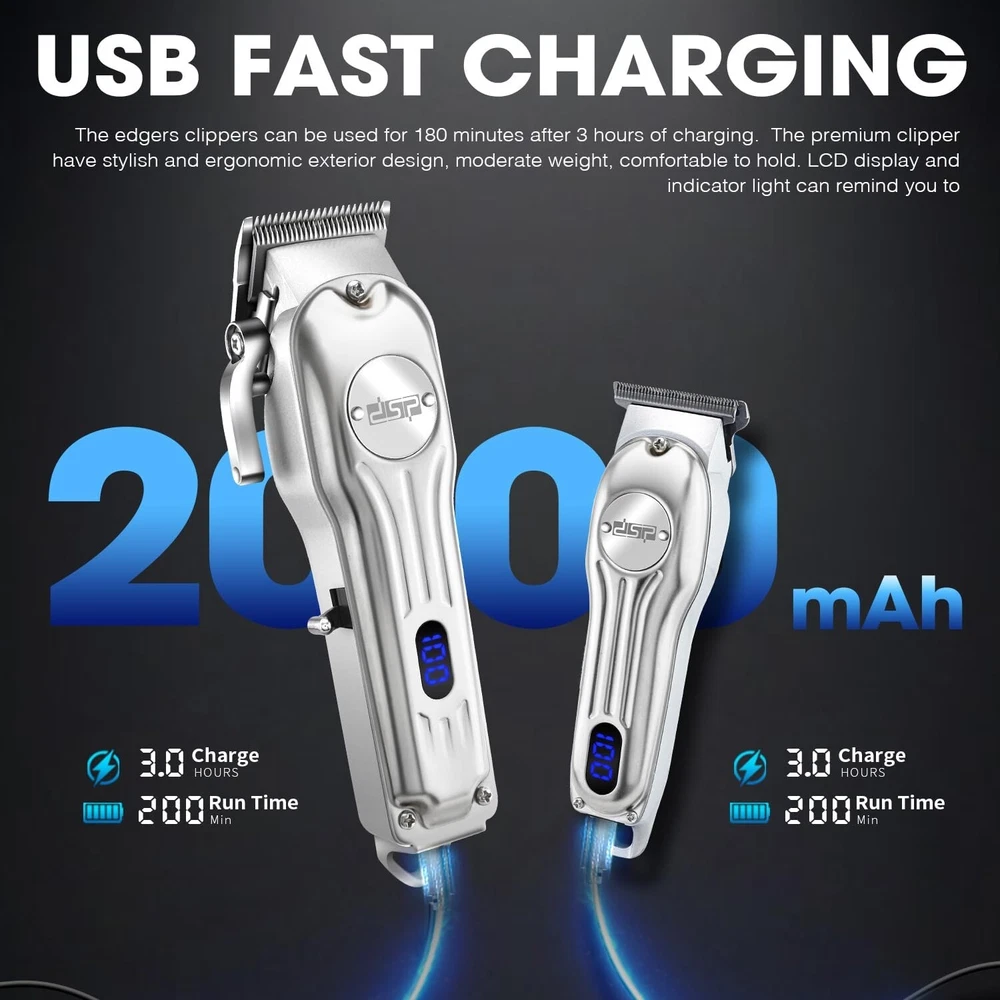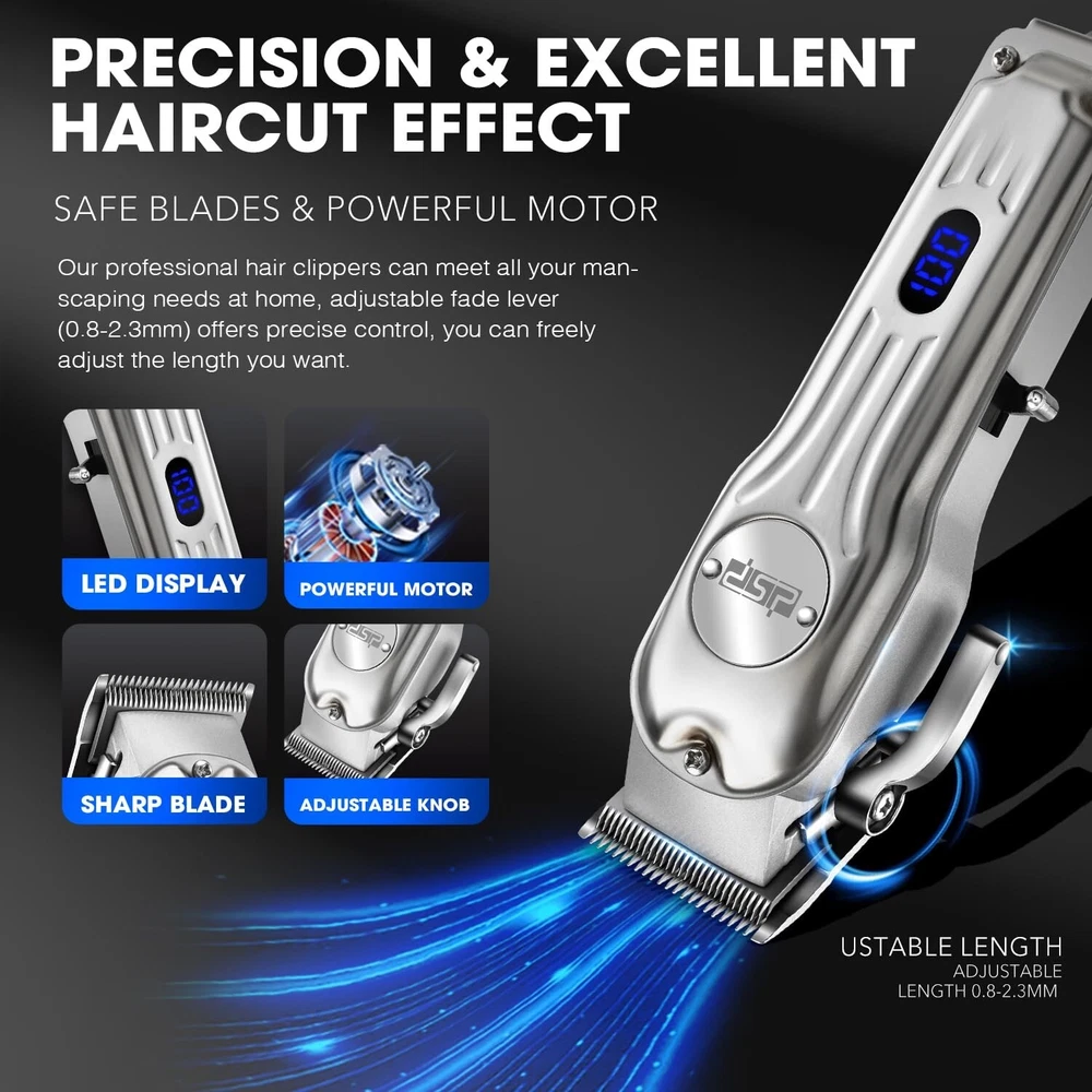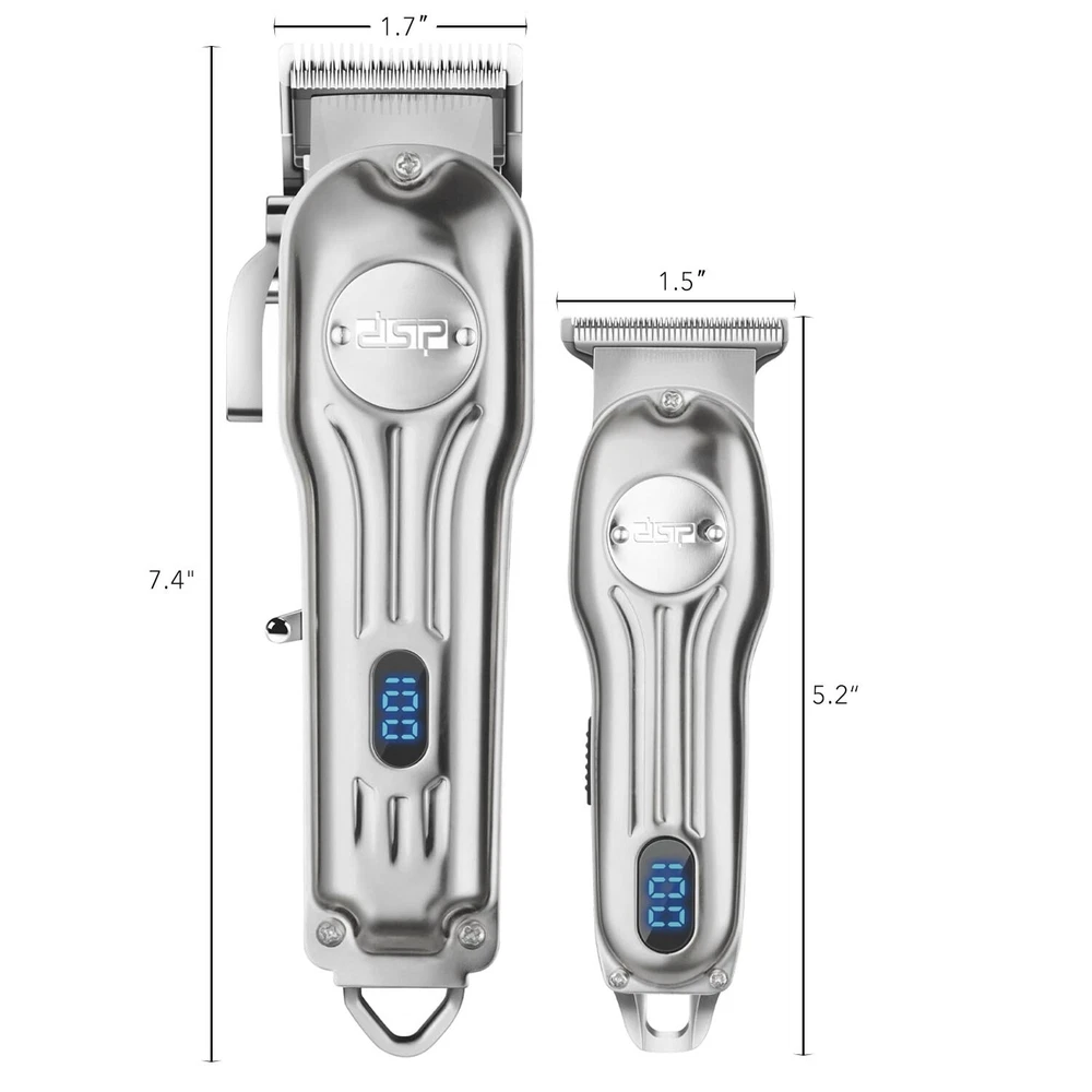 DSP Professional Hair Clipper for Men, Clipper and Trimmer Set - Electric Clipper for Hair Cutting, Cordless Barber Clipper Set with LED Display for Men Gift (Silver) Product Details Color: Silver Clipper Set Brand: DSP MPN: 80170 UPC: Does not apply EAN: Does not apply Brand: DSP Model Name: 80170 Battery Description: Lithium Included Components: Hair Clipper Runtime: 3 hours and 20 minutes Package Dimensions : 9.84 x 9.84 x 3.94 inches; 3.31 Pounds Date First Available : August 21, 2024 Manufacturer : DSP Country of Origin : China Ultimate Precision & Performance: The DSP Hair Clippers and Trimmer set redefine home grooming. Engineered with a trimmer for men, and versatile attachments including 8 limit combs for the clipper and 3 for the trimmer, this kit is suited for all styles - offering unmatched precision for self-styling enthusiasts. Its high-speed rotation (6500RPM) ensures a clean, efficient cut every time, making it a must-have shaving kit for men seeking professional results. Advanced Technology & Durability: Crafted with a robust metal body and 3CR13 blades, the DSP grooming tools promise lasting performance and effortless maintenance. The hair trimmer for men, offers a smooth, irritation-free shave or trim, perfect for maintaining a flawless beard or hairline. The included LED display adds a touch of sophistication, letting you monitor battery life effortlessly during use. Extended Battery Life for Maximum Convenience: Say goodbye to constant recharging with DSP's advanced lithium battery technology. Our men's hair clippers cordless design provides up to 200 minutes of runtime for the clipper and 70 minutes for the trimmer on a single 3-hour charge, ensuring you have enough power to complete your grooming routine without interruption. The plug and play feature guarantees you're always ready for a quick trim or a detailed styling session. Comprehensive Grooming Solution: DSP offers an all-in-one shaving kit for men, making it simpler than ever to achieve professional barber-quality results at home. From detailed outlines with the outliner trimmer to full haircuts, our set meets all your needs. The package includes essential accessories like Type-C cable, cleaning brush, oil, and a protective dust cover for easy upkeep. Designed for Comfort & Efficiency: Embrace the ultimate grooming experience with the DSP hair clippers and trimmers, boasting a stylish metal shell that's not only durable but also ergonomically designed for comfort. Whether youre a professional barber or a home user, the textured grip and balanced weight ensure easy handling for detailed work, making it the perfect trimmer and clipper set for anyone committed to maintaining their appearance with precision and ease.