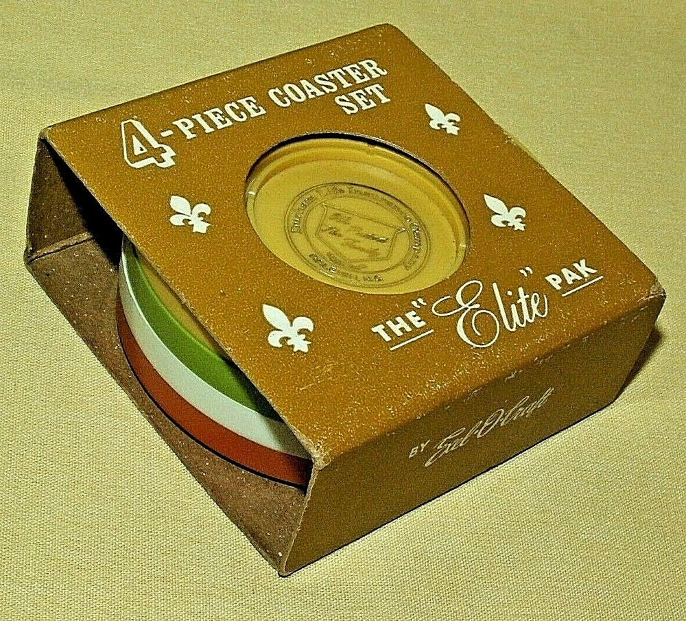 **You are bidding on a great vintage Plastic 4 Color (White Yellow Orange Green) 4 Piece Boxed Coaster Set “The Elite Pak” by Exel-O-Craft – “Our Gift Of Appreciation For You!” – featuring Durham Life Insurance Company Raleigh NC North Carolina “We Protect The Family” – each coaster has Gold Lettering and is marked Foley on the back - package measures 3 by 3 by 1 ¼ inches – packaging shows minor rubbing from storage, coasters are in very good and clean condition. I actually have two sets of these – if you are interested in more than one set, please let me know and I will alter the listing and combine shipping. {18537.148201} I am by no means an expert, so please feel free to ask plenty of questions. I will ship USPS - either Priority or Standard Post depending on the size and weight of the item. Please note that if you are bidding from outside of the United States, the shipping will be more expensive. Please contact me regarding a quote on shipping or refer to the Shipping Calculator for shipping charges. In all instances, please wait for an invoice before paying so that I can give you the correct amount for shipping and handling. I only accept PayPal due to EBay’s requirements. I am always happy to provide additional pictures or answer additional questions. Please note that I will reply during the evening hours since I am may be unavailable to my computer during the daytime hours. Your purchase comes from a clean, smoke free, pet free home. I try to describe the overall condition as best possible. Please ask questions BEFORE bidding. Your purchase is FINAL and NO REFUNDS will be given. Also, please note that you are buying this item AS IS – be aware of any toy recalls if necessary and know that you are purchasing a collectible for an adult versus a toy for a child. I do not add insurance automatically – if you would like to insure your item, please let me know. Please contact me within 48 hours of receiving your invoice so that we can make payment/delivery arrangements. Note that payment is due within a week of receiving your invoice; if not, I will