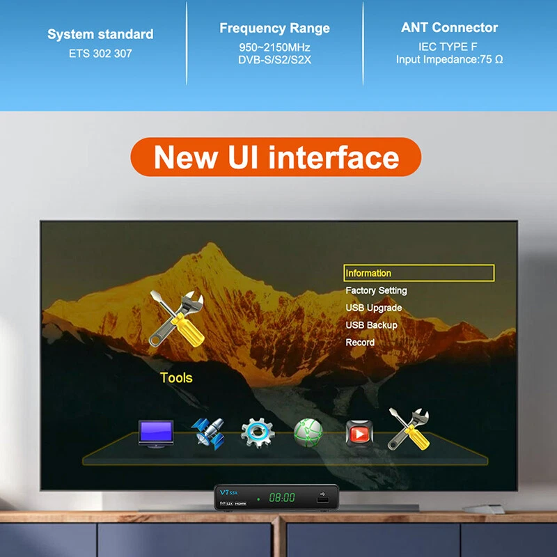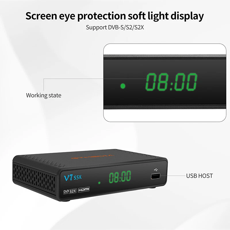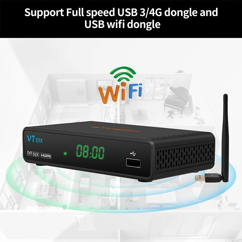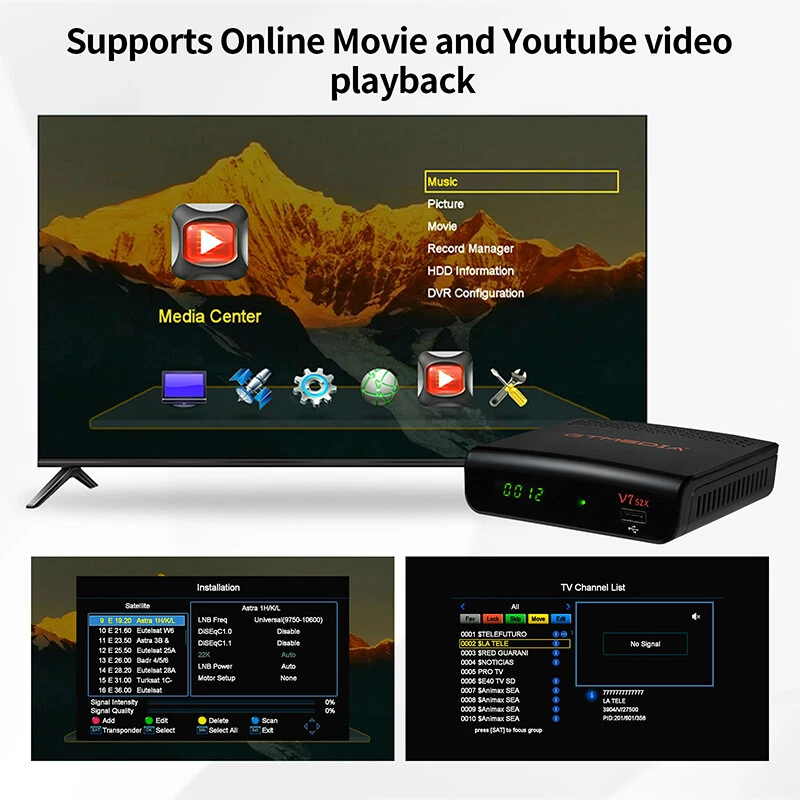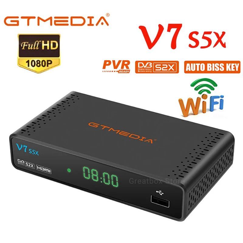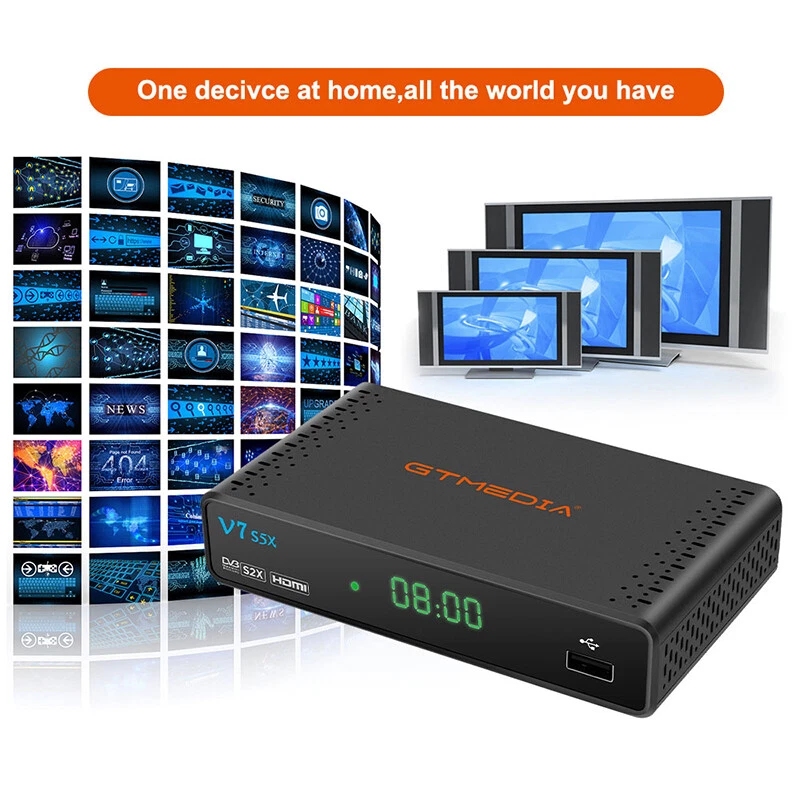 DVB-S/S2/S2X Satellite Receiver Digital TV Box WIFI HDMI USB DVR Media Player US Note: Technical website provided, please contact seller for detail. More function supported: please enter GTMEDIA official forum to download and update the latest firmware version. 【Main Chip Sets】 CPU frequency: 770MHz Dual Core Flash Memory: 64MB SPI Flash DDR2 Memory: 512M RAM 【Video Decode】 Video Decode: HEVC main profile@level 4.1 and main 8 profile@L4.1,High tier, MPEG-2 MP@ML, H.265 BP, MP&HP@L3/L4.1/L4.2, AVS Jizhun profile and broadcast profile, MPEG-4 SP profile, advanced simple profile@L5, VC1 SP@ML, MP@HL, AP@L0-3, H263 baseline profile, -JPEG decoder PAL/NTSC: Automatic PAL/NTSC conversion Aspect Ratio: Auto, 16:9 Pillar box, 4:3 Pan & Scan, 4:3 Letter Box Video Resolution: 1080P, 1080I, 720P, 576P, 480P, 576I, 480I 【Audio Decode】 Audio Decode: MPEG-1/2 Layer 1/2/3, MPEG-2/4 LC-AAC, MPEG-4 HE-AAC, Dolby AC3/AC3+, DRA CH/5.1CH Sound Mode: LEFT/RIGHT/STEREO/MONO Sampling Frequency: 32KHz,44.1KHz,48KHz 【Hardware specifications】 Panel display: 4-digit LED display LED Indicator: Power ON - Green; Standby - Red Button: NC Wifi: Support USB Wifi dongle (MTK7601/RT5370) IR: IR for 38KHz,Infra Remote control Rear Panel: LNB IN (Frequency Range950MHz to 2150MHz DVB-S/S2/S2X) HD OUT (up to 1080P) RCA OUT 2*USB 2.0 HOST Power (DC 12V/1.5A) 【DVB- S/S2 Tuner】 System standard: ETS 302 307 Frequency Range: 950~2150MHz for DVB-S/S2/S2X LNB Power and Polarization: DiSEqC1.0/1.1/1.2/USALS Motor fully support, 13/18V DC @ 400mA MAX, 22KHz±0.4KHz(0.6V ±0.2V)tone,Overload Protection Input Level Range: -80dBm~ -25dBm Symbol Rates: DVB-S QPSK,DVB-S2 QPSK/8PSK/16APSK/32APSK, DVB-S2X QPSK/8PSK/16APSK/32APSK/64APSK Forward error correction rate: 1/4,1/3,2/5,3/5,2/3,3/4,4/5,5/6,8/9,9/10 Carrier frequency acquisition range: ±5MHz for symbol rates above 3 Msps and ±3MHz for the remaining symbol rates Symbol Rates: 2 ~ 90MSPS(Code Rate 1/2) Code Rates: 1/2,2/3,3/4,5/6,7/8 for DVB-S, 1/4,1/3,2/5,1/2,3/5,2/3,3/4,5/6 ,8/9,9/10 for DVB-S2, DVB-S2X Normal Frame and Short Frame FEC code rates ANT. Connector: IEC TYPE F (Input Impedance:75 Ω ) 【USB Decode】 USB 2.0: Support FAT/FAT32/NTFS big capacity hard disk PVR Option: USB 2.0 for PVR,TIMESHIFT,media files playback Media Codec: TS,mkv, mp4, avi, flv, f4v, ts, m2ts, mov, 3gp files Audio Codec: WMA,MP3 Photo Codec: JPG, BMP, PNG, GIF Feautures: Standard: Fully comply with DVB-S/S2/S2X (SCPC and MCPC receivable from C/Ku band satellite) LNB Power and Polarization: DiSEqC1.0/1.1/1.2/USALS Motor fully support, 13/18V DC @ 400mA MAX, 22KHz±0.4KHz(0.6V ±0.2V)tone,Overload Protection High Speed Network: Support Full speed USB 3/4G dongle and USB wifi dongle. Channels Number: 6000+ channels TV and Radio programmable Channel Search: Supports Automatic network search for newly added transponders Channel Edit: Various channel editing function(favorite,move,lock,skip,delete,rename,find,sort) Channel Recording: Can view another channel under the same TP,Various channel editing function(favorite,move,lock,skip,delete,rename,find,sort) Parental Ctrl: Parental control for channels Subtitle: support DVB EN300743 and EBU Teletext: support DVB ETS300472 by VBI and OSD PVR Option: USB 2.0 for PVR,TIMESHIFT,media files playback Program Scan: Auto scan, Fast scan and LCN function Various channel editing: favorite, move ,lock, skip, delete, rename, find, sort SoftUpgrade: Software upgrades through USB port upgrade. EPG: Fully support to 7 days Electronic Program Guide(EPG) Easy Menu: Plug and Play installation, with an easy to use Menu System Time Set: Time set by GMT offset automatic and manual,Summer Time support Timer: 5 event timers,off/Once/Daily/Weekly Mode OSD Color: 16-bit OSD with anti-flickering OSD Language: Multi-language for options(English, Español, Français, Русский язык, Português, Polski, Bahasa Indonesia, اللغة العربية, Türkçe, Deutsch, Italiano, فارسی , ภาษาไทย ) Package included: 1x V7 S5X TV Box 1x Adapter (US Ver.) 1x Remote control 1x HDMI cable 1x user manual 1x Warranty card 1x USB Antenna (wifi) Payment Shipping Return Contact us Feedback Payment 1.You can checkout and pay immediately after the auction ends or you complete the purchases. 2.If you need an eBay invoice sent to you by Email, please contact us after making payments. Shipping 1.Please allow up to 1-2 days for shipping arrangement after payment confirmed (weekend & holiday excluded), if you need the item urgently, please contact us for detail before purchase. 2.We ship items only to the ebay address. We will not be responsible for any loss because of wrong or undeliverable shipping address. 3.We do not offer in store pick up and return service, hope you can understand. Return 1.If you are not satisfied with our products. Please kindly contact us before you open the return request. We provides 30 days Warranty. 2.Please Kindly contact us for the RMA No.and address before returning the item back. Contact us 1.Please email us through "My Messages" or "Contact seller" if you have any question about our listings or your purchasing. 2.Please contact us if you are not satisfied with the item after receive it.You can find the " Ask the seller a question" link on eBay. 3.All replies will be sent to your email, if you don't get response within 1-2 business days, pls check your My messages' in case your email provider has an overly-aggressive spam filterblocking eBay's emails. Please email us AGAIN. Feedback 1. Please contact us before leaving a neutral or negative feedback. We would try our best to help you solve the problem. Please allow us to reply your email within 48 hours. 2.We will provide the service as best as we can, cause the positive feedback is what we are striving for.