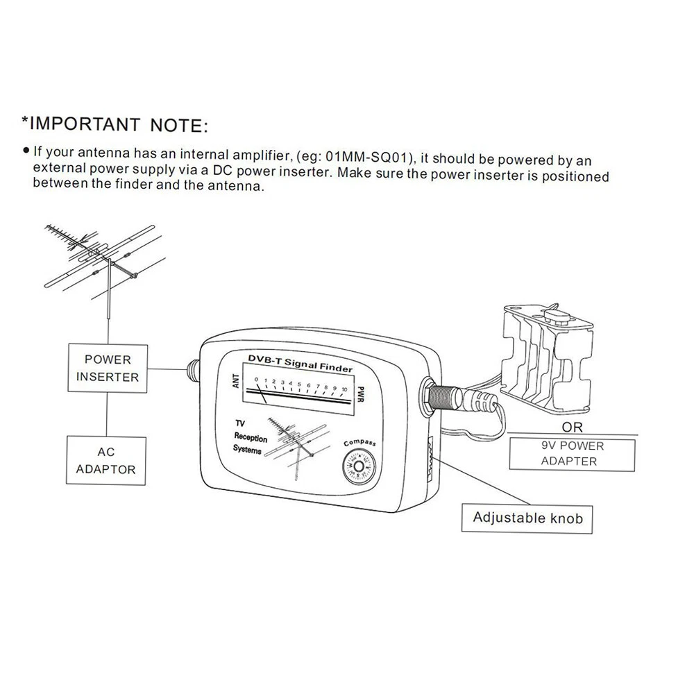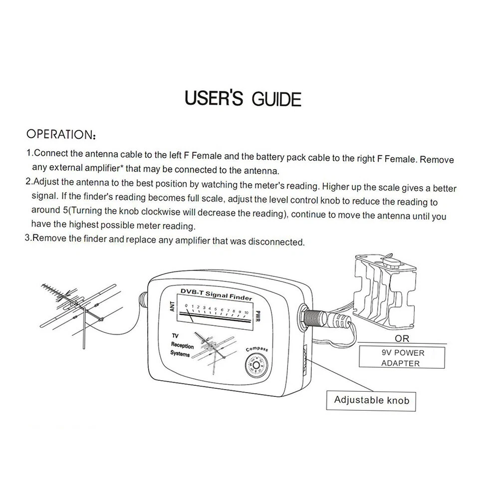 Features: Featured as Excellent Sensitivity and Accurate, help you to find the best position for DVB-T antenna installation. Designed with a compass for easier and quicker tuning. With buzzer and attenuation control function, easy user-friendly operation. Feedback numbers shows the strength of the signal intuitively. Mini size and light weight, really portable and convenient to carry. Operation: 1.Connect the antenna cable to the left F Female and the battery pack cable to the right F Female. Remove any external amplifier* that may be connected to the antenna. 2.Adjust the antenna to the best position by watching the meter's reading. Higher up the scale gives a better signal. If the finder's reading becomes full scale, adjust the level control knob to reduce the reading to around 5 (Turning the knob clockwise will decrease the reading), continue to move the antenna until you have the highest possible meter reading. 3.Remove the finder and replace any amplifier that was disconnected. Important Note: -If your antenna has an internal amplifer, (eg: 01MM-SQ01), it should be powered by an external power supply via a DC power inserter. Make sure the power inserter is positioned between the finder and the antenna. Specifications: Color: blue Material: plastic Frequency range: 170-860MHz Input level range: 65-95dBuv Impedance: 75Ω Insertion Loss: ≤5.0dB Power supply: 9-12V DC Item Size: Approx. 127 * 63 * 35 mm / 5 * 2.48 * 1.38in Item Weight: Approx. 90g / 3.2oz Package Size: Approx. 18.6 * 14.1 * 4.3cm / 7.32 * 5.55 * 1.69in Package Weight: Approx. 197g / 6.97oz Package List: 1 * Satellite Finder 1 * English User Manual 1 * Battery Holder 1 * Power Cable Your satisfaction is our eternal pursuit