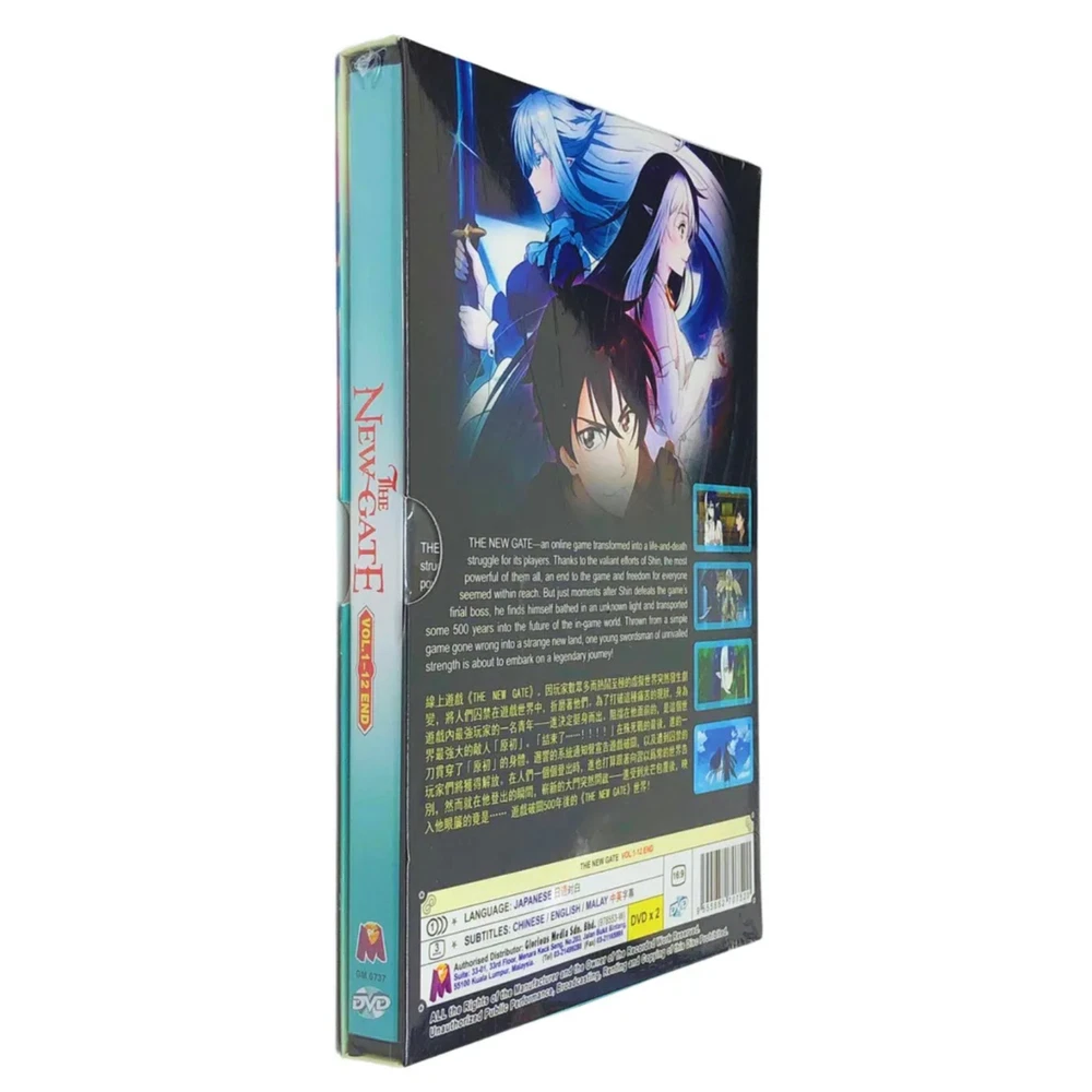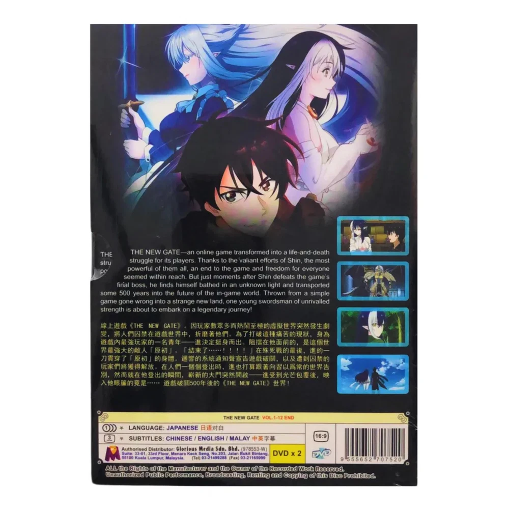 DVD Anime The New Gate (Vol. 1-12) End Synopsis Trapped with thousands of people in The New Gate, a virtual reality game, the elite player Shinya Kiritani resolves to clear the game and finally return home. However, after he manages to single-handedly defeat the final boss, Shinya is transported to a new world—seemingly indistinguishable from the one he just escaped. Shinya discovers that as long as the game menu and his skills are unchanged, he cannot leave this oddly familiar world. In his search of a way to break out from this new dimensional prison, Shinya encounters Tiera Lucent, a hotel receptionist who happens to be a protégée of Schnee Raizar—one of Shinya's former party members. With this glimmer of hope, Shinya strives to reunite with Schnee and find out the truth about The New Gate. Features and further details Title : The New Gate (Vol. 1-12 End) Weight : 174g Product Description : Language: Japanese Subtitle: English/Chinese/Malay Media Type: NTSC; Widescreen 16:9, All Region No of CDs: 2 DVD