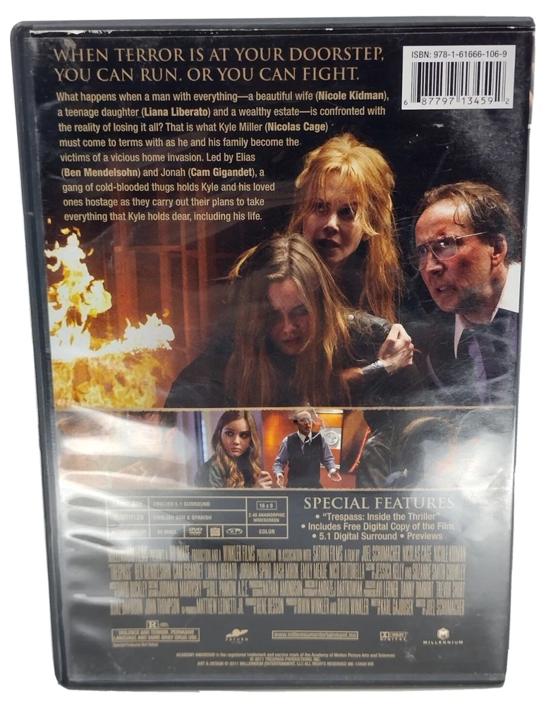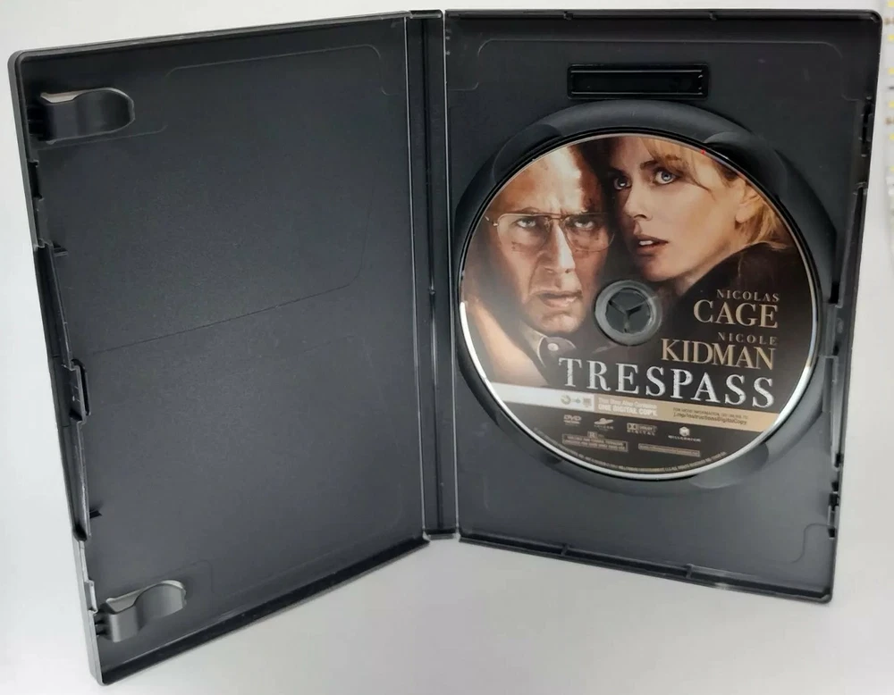 DVD Movie Trespass 2011 Millennium Films Nicolas Cage Nicole Kidman VG . DVD has some light scratches/scuffs. Case has minor wear. We provide free returns on all non-international purchases for a period of 30 days if there are any issues during play of the DVD. We have many more DVDs, Laserdiscs, CDs, and watches in our store, ljmcollectibles, and will combine shipping (when possible) for additional purchases made the same day.