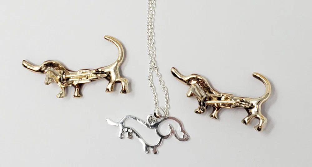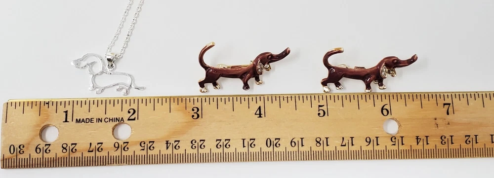 Dachshund Weiner Dog Jewelry - Silver Tone Necklace & 2 Enamel & Rhinestone Pins See pictures for measurements. The necklace has a stamp on the back, but I cannot read it. Combined Shipping on All Listings: I will be happy to combine the shipping on all purchases made from any of my listings on eBay. In order to receive this combined shipping price please put items in your shopping cart with the intent to purchase and request an updated invoice before paying. Calculated shipping costs are exact costs based on dimensions of package, weight of package, and location for delivery - these are calculated by the USPS.