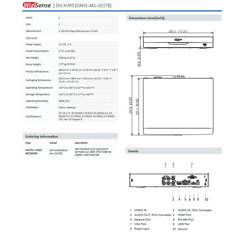 Dahua 4CH Penta-brid 4K 5MP IoT&POS 1U 1SSD HDCVI AHD TVI CVBS XVR5104HS-4KL-I3 Note: Original Dahua worldwide English version and upgradeable. Features: 4CH Penta-brid 4K Value/5MP Compact 1U 1SSD 1TB WizSense Digital Video Recorder * The information below only applies to hardware version 3.0 of the product > Comes with an internal 1TB SSD, and can record videos for about 18 days. > 4-channel SMD Plus for analog channels which allows the device to trigger accurate alarms for humans and vehicles. > 4-channel perimeter protection for analog channels which supports tripwire and intrusion detection powered by AI. > 2-channel face recognition for analog channels which supports face comparison. > 4-channel AI Coding saves on storage and bandwidth while maintaining the details of targets in videos. > Supports HDCVI, AHD, TVI, CVBS and IP video input. > Supports up to 8-channel IP camera input and each channel can be up to 8 MP. The incoming bandwidth reaches 64 Mbps. > Smart H.265+ and Smart H.265 dual-stream video compression. > IoT and POS capabilities. Specifications: System Main Processor Industrial-grade processor Operating System Embedded Linux Operating Interface Web; Local GUI Perimeter Protection Perimeter Performance AI by Recorder (Number of Channels) Advanced Model: 2 channels, 10 IVS rules for each channel General Model: 4 channels, 10 IVS rules for each channel Face Detection Face Attributes 6 attributes Face Detection Performance of AI by Recorder (Number of Channels) 2 channels (up to 8 face images/s each channel) Face Recognition Face Database Capacity Up to 10 face databases with 20,000 face images in total. Face Recognition Performance of AI by Recorder (Number of Channels) 2 channels SMD Plus SMD Plus by Recorder 4 channels: Secondary filtering for human and motor vehicle , reducing false alarms caused by leaves, rain and lighting condition change Audio and Video Analog Camera Input 4 BNC ports, supports HDCVI/AHD/TVI/CVBS auto-detect Camera Input 1. CVI: 4K@25/30 fps; 6 MP@20 fps; 5 MP@20 fps; 5 MP@25 fps; 4 MP@25/30 fps; 1080p@25/30 fps; 720p@25/30 fps; 720p@50/60 fps. 2. TVI: 4K@15 fps; 5 MP@20 fps; 4 MP@25/30 fps; 3 MP@25/30 fps; 1080p@25/30 fps; 720p@25/30 fps. 3. AHD: 4K@15 fps; 5 MP@20 fps; 4 MP@25/30 fps; 3 MP@25/30 fps; 1080p@25/30 fps; 720p@25/30 fps IP Camera Input Up to 8 channels of IPC access 4 IP channels by default + 4 channels (analog channels are converted to IP channels) incoming bandwidth: 64 Mbps, recording bandwidth: 64 Mbps and outgoing bandwidth: 64 Mbps *After IP extension is enabled, the AI Function (IVS, SMD, FACE) will be disabled. Encoding Capacity Main stream: 4K@(1 fps-7 fps); 6 MP@(1 fps-10 fps); 5 MP@(1 fps-12 fps); 4K-N, 4 MP, 3 MP@(1 fps-15 fps); 4M-N, 1080p, 720p, 960H, D1,CIF@(1 fps–25/30 fps); Sub stream: 960H@(1 fps–15 fps); D1/CIF@(1 fps–25/30 fps) Dual-stream Yes Video Bit Rate 32 kbps–6144 kbps Audio Sampling 8 kHz, 16 bit Audio Bit Rate 64 kbps Video Output 1 HDMI, 1 VGA HDMI: 3840 × 2160, 1920 × 1080, 1280 × 1024, 1280 × 720 VGA: 1920 × 1080, 1280 × 1024, 1280 × 720 *Simultaneous/heterogeneous video sources output for VGA and HDMI is configurable Multi-screen Display When IP extension mode not enabled: 1/4 When IP extension mode enabled: 1/4/8/9 Third-party Camera Access ONVIF; Panasonic; Sony; Axis; Arecont; Samsung Compression Standard Video Compression AI Coding; Smart H.265+; H.265; Smart H.264+; H.264 Audio Compression G.711a; G.711u; PCM Network Network Protocol HTTP; HTTPS; TCP/IP; IPv4; IPv6; RTSP; UDP; NTP; DHCP; DNS; SMTP; UPnP; IP Filter; FTP; DDNS; Alarm Server; P2P; Auto Registration; IP Search (Supports IP camera, DVR, NVS, etc.) Mobile Phone Access iOS; Android Interoperability ONVIF 22.12(Profile T; Profile S; Profile G); CGI; SDK Browser Chrome; Firefox; IE Network Mode Single-address mode Recording Playback Record Mode General; motion detection; intelligent; alarm; POS Recording Playback 1/4 Backup Method USB device and network Playback Mode Instant playback; general playback; event playback; tag playback; smart playback (face and motion detection) Alarm General Alarm Motion detection; alarm box; camera external alarm; network alarm; PIR alarm Anomaly Alarm Error (no disk, disk error, low space, low quota space; network disconnection; IP conflict; MAC conflict) ;video loss; video tampering; camera offline Intelligent Alarm Face detection; face recognition; perimeter protection Alarm Linkage Record; snapshot (panoramic); IPC external alarm output; audio; buzzer; log, preset; email Ports Audio Input 1-channel RCA 4-channel BNC (Coaxial Audio) Audio Output 1-channel RCA Two-way Talk Yes (share the same audio input with the first channel) HDD Interface 1 SSD:1TB(replaceable with 256 GB or 512 GB) Stores for 18 days under default settings. RS-485 1 port, for PTZ control USB 2 (1 front USB 2.0 port, 1 rear USB 2.0 port) HDMI 1 VGA 1 Network Port 1 (10/100 Mbps Ethernet port, RJ-45) General Power Supply 12 VDC , 2 A Power Consumption <7 W (with SSD) Net Weight 0.96 kg (2.12 lb) Gross Weight 1.37 kg (3.03 lb) Product Dimensions 260.0 mm × 237.9 mm × 47.6 mm (10.24'' × 9.37'' × 1.87'') (W × D × H) Packaging Dimensions 333.0 mm × 89.0 mm × 315.0 mm (13.12'' × 3.51'' × 12.41'') (W × D × H) Operating Temperature –10 °C to +55 °C (+14 °F to +131 °F) Storage Temperature –20 °C to +60 °C (–4 °F to +140 °F) Operating Humidity ≤93% (RH) Installation Rack or desktop Certifications CE: CE-LVD: IEC 62368-1 CE-EMC: EN 61000-3-2, EN 61000-3-3, EN 55032, EN 50130, EN 55024, EN 55035 FCC: Part 15 Subpart B
