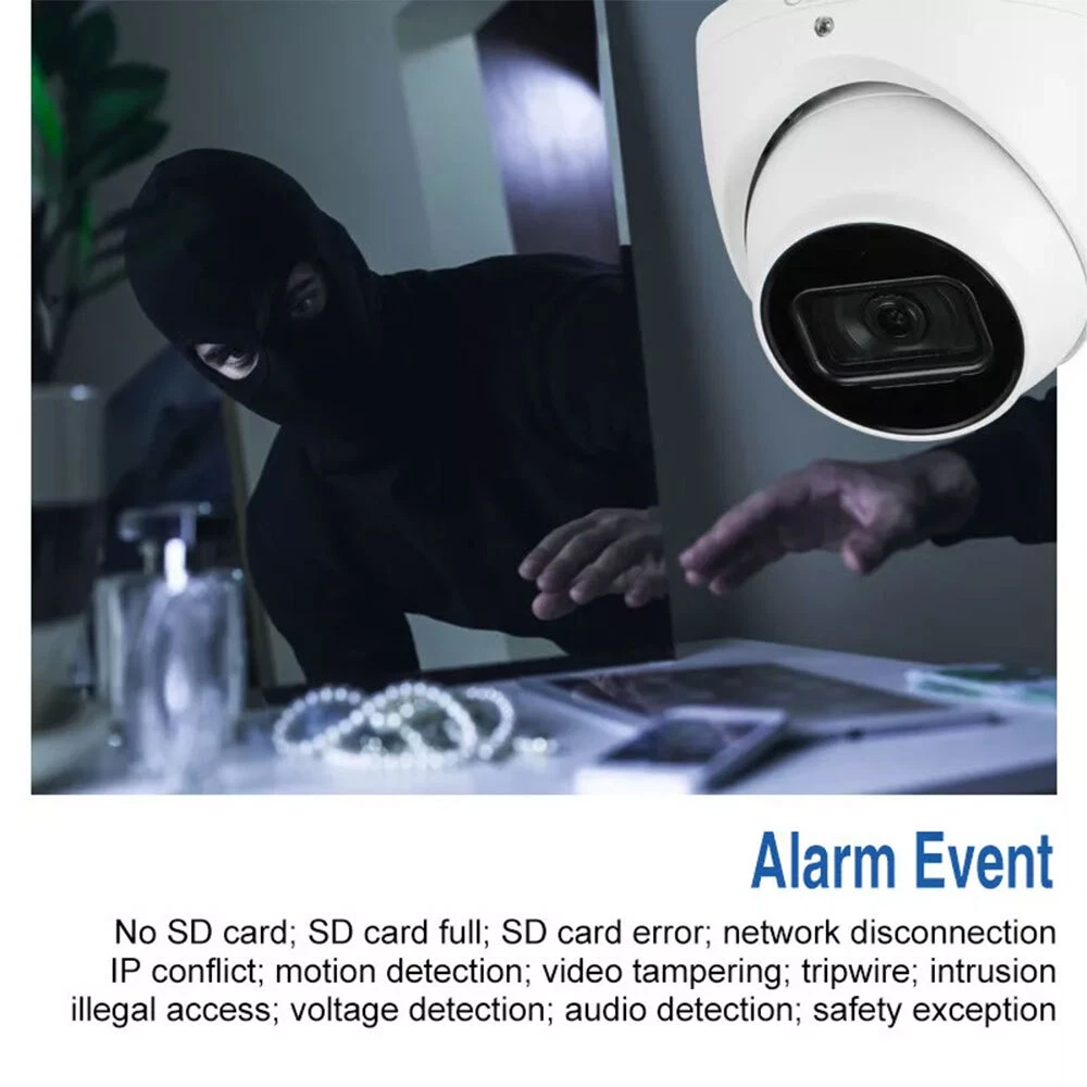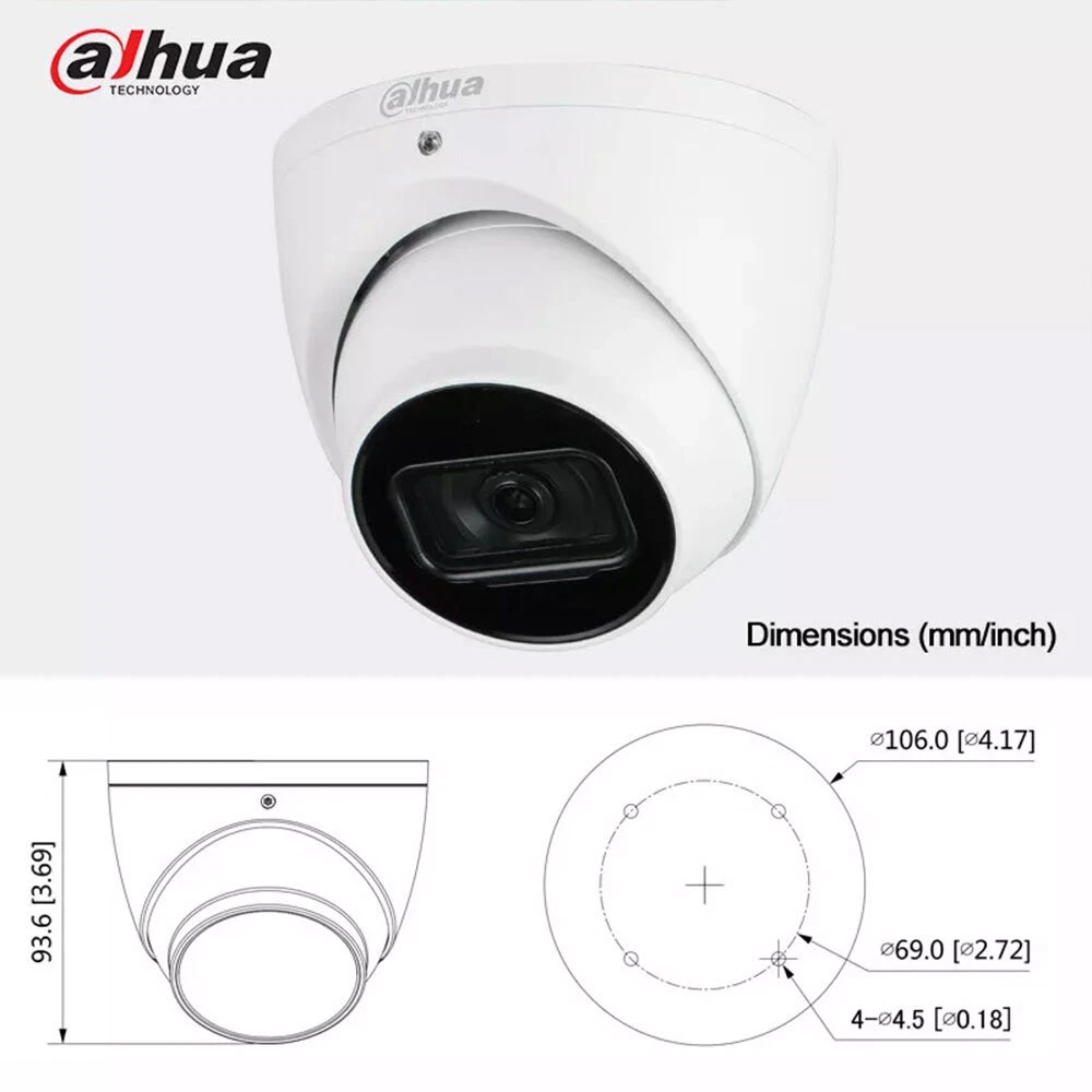 Product Description 8MP IR Fixed focal Eyeball WizSense Network Camera Features: > 8MP, 1/2.8” CMOS image sensor, low illuminance, high image definition > Outputs max. 8MP (3840 × 2160) @20 fps (AI function enabled by default) and supports 8MP (3840 × 2160) @25/30 fps (when AI function disabled) > H.265 codec, high compression rate, low bit rate > Built-in IR LED, max. IR distance: 30 m > ROI, SMART H.264+/H.265+, flexible coding, applicable to various bandwidth and storage environments. > Rotation mode, WDR, 3D DNR, HLC, BLC, digital watermarking, applicable to various monitoring scenes > Intelligent detection: Intrusion, tripwire (support the classification and accurate detection of vehicle and human) > Abnormality detection: Motion detection, video tampering, scene changing, audio detection, no SD card, SD card full, SD card error, network disconnection, IP conflict, illegal access, and voltage detection > Supports max. 256 G Micro SD card, built-in Mic > 12V DC/PoE power supply > IP67 protection > SMD Plus Specifications: Camera Image Sensor 1/2.8”8Megapixel progressive CMOS Max. Resolution 3840 (H) × 2160 (V) ROM 128 MB RAM 512 MB Scanning System Progressive Electronic Shutter Speed Auto/Manual 1/3 s–1/100,000 s Min. Illumination 0.007 Lux@F1.4 (Color, 30IRE) 0.0007 Lux@F1.4 (B/W, 30IRE) 0 Lux (Illuminator on) S/N Ratio > 56 dB Illumination Distance 30 m (98.4 ft) Illuminator On/Off Control Auto/Manual Illuminator Number 2 (IR LED) Pan/Tilt/Rotation Range Pan: 0°–360° Tilt: 0°–78° Rotation: 0°–360° Lens Lens Type Fixed-focal Mount Type M12 Focal Length 2.8 mm; 3.6 mm Max. Aperture F1.4 Field of View 2.8 mm: Horizontal 108° × Vertical 58° × Diagonal 127° 3.6 mm: Horizontal 85° × Vertical 45° × Diagonal 100° Iris Type Fixed Close Focus Distance 2.8 mm: 1.4 m (4.6 ft) 3.6 mm: 2.4 m (7.9 ft) Electronic Shutter Speed Auto/Manual 1/3 s–1/100,000 s DORI Distance Lens Detect Observe Recognize Identify 2.8 mm 85.5 m (280.5 ft) 34.2 m (112.2 ft) 17.1 m (56.1 ft) 8.6 m (28.2 ft) 3.6 mm 110.3 m (361.9 ft) 44.1 m (144.7 ft) 22.1 m (72.5 ft) 11.0 m (36.1 ft) Professional, intelligent Perimeter Protection Tripwire; intrusion (support the classification and accurate detection of vehicle and human) Intelligent Search Work together with Smart NVR to perform refine intelligent search, event extraction and merging to event videos. Video Video Compression H.265; H.264; H.264H; H.264B; MJPEG (only supported by the sub stream) Smart Codec Smart H.265+/ Smart H.264+ Stream Capability 3 streams Video Frame Rate Main stream: 3840 × 2160 @(1–20 fps by default) 3840 × 2160 @(1–25/30 fps when AI function disabled) sub stream: 704 × 576 @(1–25 fps)/704 × 480 @ (1–30 fps) third stream: 1920 × 1080 @(1–25/30 fps) Resolution 8M (3840 × 2160); 6M (3072 × 2048); 5M (3072 × 1728/2592 × 1944); 4M (2688 × 1520); 3M (2048 × 1536/2304 × 1296); 1080p (1920 × 1080); 1.3M (1280 × 960); 720p (1280 × 720); D1(704 × 576/704 × 480); VGA (640 × 480); CIF (352 × 288/352 × 240) Bit Rate Control CBR/VBR Video Bit Rate H.264: 3 kbps–8192 kbps H.265: 3 kbps–8192 kbps Day/Night Auto (ICR)/Color/B/W BLC Yes HLC Yes WDR 120 dB Scene Self-adaptation (SSA) Yes White Balance Auto/natural/street lamp/outdoor/manual/regional custom Gain Control Auto/Manual Noise Reduction 3D DNR Motion Detection OFF/ON (4 areas, rectangular) Region of Interest (RoI) Yes (4 areas) Smart Illumination Yes Image Rotation 0°/90°/180°/270° (Support 90°/270° with 1080p resolution and lower.) Mirror Yes Privacy Masking 4 areas Audio Built-in MIC Yes Audio Compression G.711a; G.711Mu; G726 Alarm Alarm Event No SD card; SD card full; SD card error; service life warning (only supported by Dahua card); network disconnection; IP conflict; illegal access; motion detection; video tampering; intrusion; tripwire; scene changing; audio detection; voltage detection; SMD; safety exception Network Network RJ-45 (10/100 Base-T) SDK and API Yes Protocol IPv4; IPv6; HTTP; TCP; UDP; ARP; RTP; RTSP; RTCP; RTMP; SMTP; FTP; SFTP; DHCP; DNS; DDNS; QoS; UPnP; NTP; Multicast; ICMP; IGMP; NFS; SAMBA; PPPoE; SNMP Cyber Security Video encryption; firmware encryption; configuration encryption; Digest; WSSE; account lockout; security logs; IP/MAC filtering; generation and importing of X.509 certification; syslog; HTTPS; 802.1x; trusted boot; trusted execution; trusted upgrade Interoperability ONVIF (Profile S/Profile G/Profile T); CGI; P2P; Milestone; Genetec User/Host 20 (Total bandwidth: 72 M) Storage FTP; SFTP; Micro SD card (support max. 256 G); NAS Browser IE: IE8; IE9; IE11 Chrome Firefox Management Software Smart PSS; DSS; DMSS Mobile Phone IOS; Android Certification Certifications CE-LVD: EN62368-1 CE-EMC: Electromagnetic Compatibility Directive 2014/30/EU FCC: 47 CFR FCC Part 15, Subpart B UL/CUL: UL60950-1 CAN/CSA C22.2 No.60950-1-07 Power Power Supply 12V DC/PoE (802.3af) Power Consumption Basic power consumption: 2.6W (12V DC); 3.3W (PoE) Max. power consumption (WDR + H.265 + IR LED intensity): 6.9W (12V DC); 7.9W (PoE) Environment Operating Conditions –40°C to +60°C (–40°F to +140°F)/Less than 95% RH Storage Conditions –40°C to +60°C (–40°F to +140°F) Protection Grade IP67 Structure Casing Metal Dimensions 93.6 mm × Φ106 mm (3.7" × Φ4.2") Net Weight 530 g (1.1 lb) Gross Weight 800 g (1.7 lb) Shipping & Handling: Warranty & Return Policy: Feedback & About Us: About Customs duty/Tax: 1. Item will be shipped out within 5 business days after the payment. Please check and make sure your address is correct before payment. (In order to make sure you can receive the items successfully, please provide your phone number as well.) 2. The items will be shipped via Post Office Airmail. It usually takes around 2 to 3 weeks to United Stated, United Kingdom, Australia, Canada and some European countries. But for other countries, it may need 4-6 weeks to deliver the parcel. It may take longer time if there 