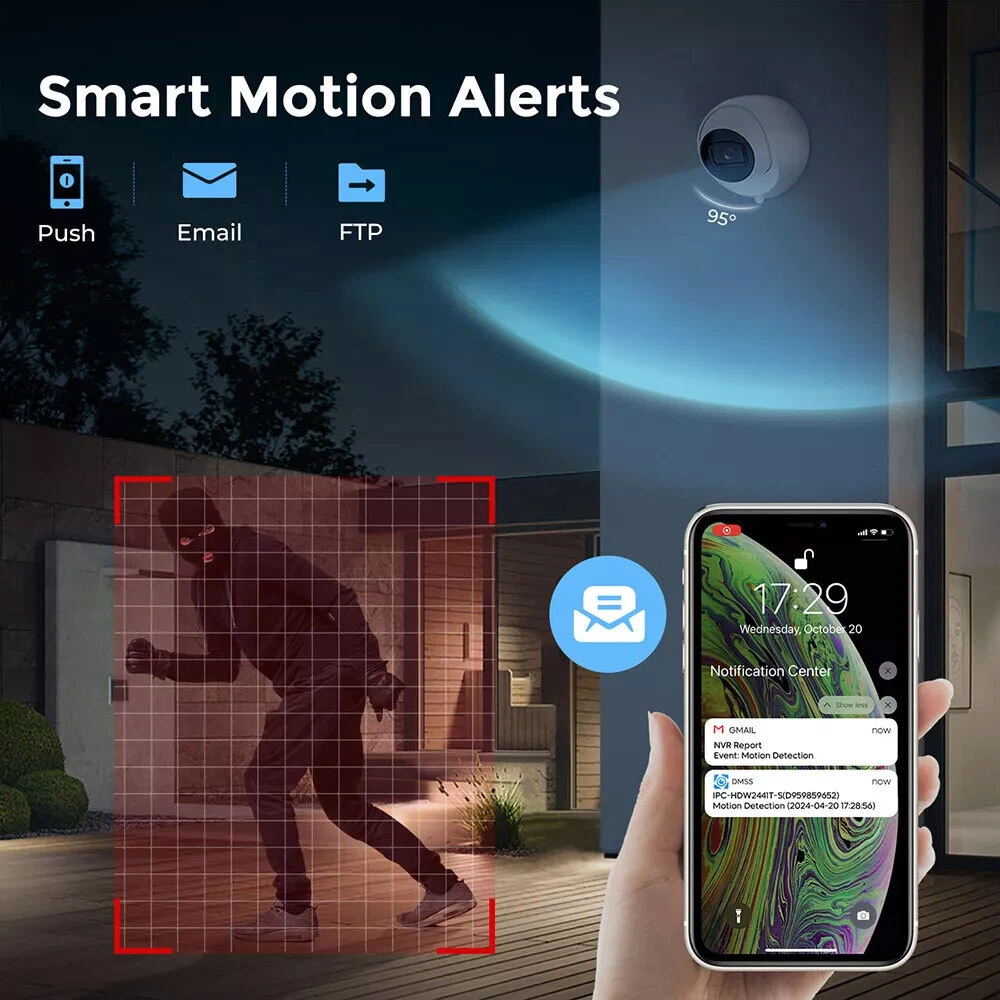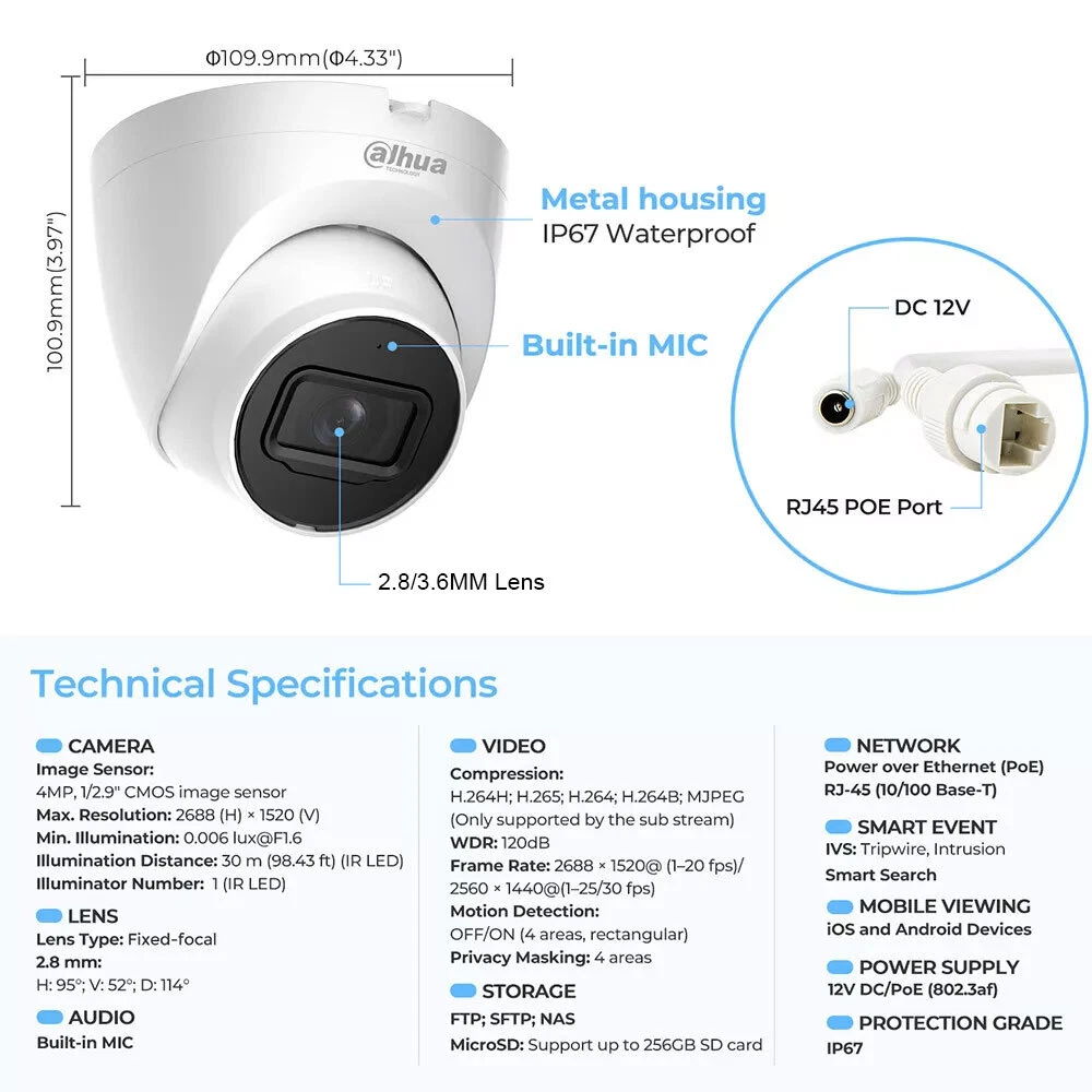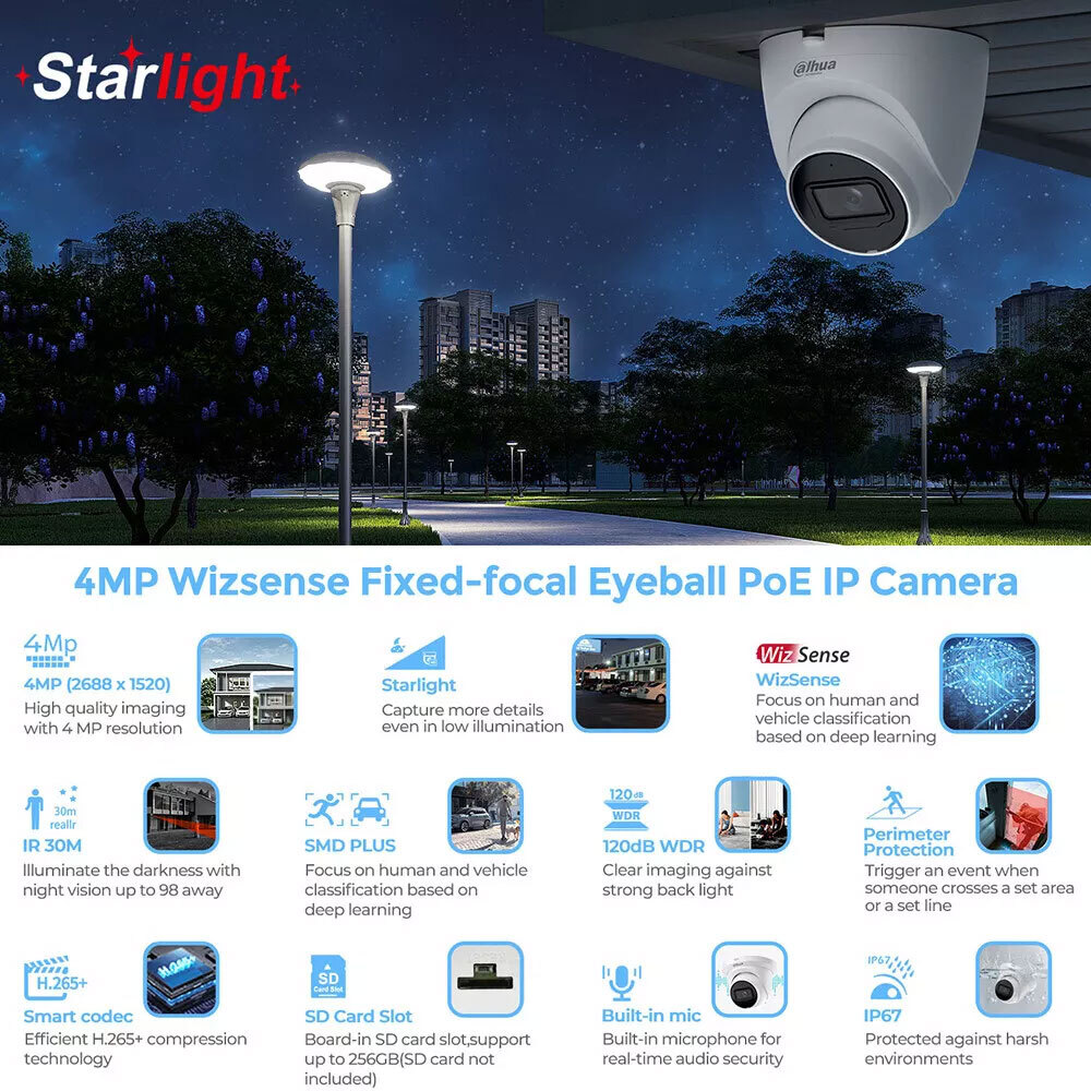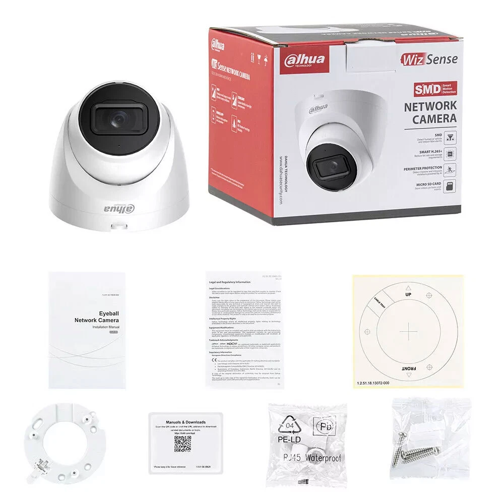 Product Description Features 4MP IR Fixed-focal Eyeball WizSense Network Camera > 4-MP 1/2.9" CMOS image sensor, low luminance, and high definition image. > Outputs max. 4 MP (2688 × 1520) 20 fps, and supports 2560 × 1440 25/30 fps. > H.265 codec, high compression rate, ultra-low bit rate. > Built-in IR LED, and the max. illumination distance is 30 m. > ROI, SMART H.264 +/H.265+, flexible coding, applicable to various bandwidth and storage environments. > Rotation mode, WDR, 3D NR, HLC, BLC, digital watermarking, applicable to various monitoring scenes. > Intelligent monitoring: Intrusion, tripwire (the two functions support the classification and accurate detection of vehicle and human) > Supports max. 256 G Micro SD card; built in MIC. > 12 VDC/PoE power supply. > IP67 protection. > SMD Plus. Specifications Camera Image Sensor 1/2.9" CMOS Max. Resolution 2688 (H) × 1520 (V) ROM 128 MB RAM 128 MB Scanning System Progressive Electronic Shutter Speed Auto/Manual 1/3 s–1/100,000 s Min. Illumination 0.006 lux F1.6 (Color, 30IRE) 0.0006 lux F1.6 (B/W, 30IRE) 0 lux (Illuminator on) S/N Ratio >56 dB Illumination Distance 30 m (98.43 ft) (IR LED) Illuminator On/Off Control Auto; manual Illuminator Number 1 (IR LED) Pan/Tilt/Rotation Range Pan: 0°–360° Tilt: 0°–78° Rotation: 0°–360° Lens Lens Type Fixed-focal Lens Mount M12 Focal Length 2.8 mm; 3.6 mm Max. Aperture F1.6 Field of View 2.8 mm: H: 95°; V: 52°; D: 114° 3.6 mm: H: 78°; V: 41°; D: 94° Iris Control Fixed Close Focus Distance 2.8 mm: 0.9 m (2.95 ft) 3.6 mm: 1.6 m (5.25 ft) DORI Distance Lens Detect Observe Recognize Identify 2.8 mm 63.6 m (208.66 ft) 25.4 m (83.33 ft) 12.7 m (41.67 ft) 6.4 m (20.99 ft) 3.6 mm 85.4 m (280.18 ft) 34.2 m (112.20 ft) 17.1 m (56.10 ft) 8.5 m (27.89 ft) DORI (Detect, Observe, Recognize, Identify) is a standard system (EN-62676-4) for defining the ability of a person viewing the video to distinguish persons or objects within a covered area. The numbers in this table do not reflect intelligent function distances. For intelligent function distances, refer to installation and commissioning manual/project design tool. Intelligence IVS (Perimeter Protection) Intrusion, tripwire (the two functions support the classification and accurate detection of vehicle and human) Smart Search Work together with Smart NVR to perform refine intelligent search, event extraction and merging to event videos Video Video Compression H.264H; H.265; H.264; H.264B; MJPEG (Only supported by the sub stream) Smart Codec Smart H.265+; Smart H.264+ Video Frame Rate Main stream: 2688 × 1520 (1–20 fps)/2560 × 1440 (1–25/30 fps) Sub stream: 704 × 576 (1–25 fps)/704 × 480 (1–30 fps) *The values above are the max. frame rates of each stream; for multiple streams, the values will be subjected to the total encoding capacity. Stream Capability 2 streams Resolution 4M (2688 × 1520); 4M (2560 × 1440); 3M (2304 × 1296); 1080p (1920 × 1080); 1.3M (1280 × 960); 720p (1280 × 720); D1 (704 × 576/704 × 480); VGA (640 × 480); CIF (352 × 288/352 × 240) Bit Rate Control CBR/VBR Video Bit Rate H.264: 32 kbps–6144 kbps H.265: 12 kbps–6144 kbps Day/Night Auto (ICR)/Color/B/W BLC Yes HLC Yes WDR 120 dB White Balance Auto; natural; street lamp; outdoor; manual; regional custom Gain Control Auto; manual Noise Reduction 3D NR Motion Detection OFF/ON (4 areas, rectangular) Region of Interest (RoI) Yes (4 areas) Image Rotation 0°/90°/180°/270° (Support 90°/270° with 2688 × 1520 resolution and lower) Mirror Yes Privacy Masking 4 areas Audio Built-in MIC Yes Audio Compression G.711a; G.711Mu; PCM; G.726 Alarm Alarm Event No SD card; SD card full; SD card error; network disconnecton; IP conflict; illegal access; moton detecton; video tampering; tripwire; intrusion; SMD; voltage detecton; security excepton Network Network Port RJ-45 (10/100 Base-T) SDK and API Yes Network Protocol IPv4; IPv6; HTTP; TCP; UDP; ARP; RTP; RTSP; RTCP; RTMP; SMTP; FTP; SFTP; DHCP; DNS; DDNS; NTP; Multicast; ICMP; IGMP; P2P Interoperability ONVIF (Profile S/Profile G/Profile T); CGI User/Host 6 (Total bandwidth: 36 M) Storage FTP; SFTP; Micro SD card (support max. 256 GB) Browser IE; Chrome; Firefox Management Software DSS; DMSS Mobile Client iOS; Android Cyber Security Configuration encryption;Trusted execution;Digest;Security logs;WSSE;Account lockout;syslog;Video encryption;802.1x;IP/MAC filtering;HTTPS;Trusted upgrade;Trusted boot;Generation and importing of X.509 certification Certification Certifications CE-LVD: EN62368-1; CE-EMC: Electromagnetic Compatibility Directive 2014/30/EU; FCC: 47 CFR FCC Part 15, Subpart B; UL/CUL: UL62368-1 & CAN/CSA C22.2 No. 62368-1-14 Power Power Supply 12 VDC/PoE (802.3af) Power Consumption Basic: 2.5 W (12 VDC); 3.3 W (PoE); Max. (ICR + H.265 + max. resolution + main stream + IR intensity + WDR + IVS): 4.2 W (12 VDC); 5.1 W (PoE) Environment Operating Temperature –40 °C to +60 °C (–40 °F to +140 °F) Operating Humidity ≤95% Storage Temperature –40 °C to +60 °C (–40 °F to +140 °F) Protection IP67 Structure Casing Material Inner core: Metal Cover: Plastic Product Dimensions 100.9 mm × Φ109.9 mm (3.97" × Φ4.33") Net Weight 0.37 kg (0.82 lb) Gross Weight 0.56 kg (1.23 lb) Shipping & Handling: Warranty & Return Policy: Feedback & About Us: About Customs duty/Tax: 1. Item will be shipped out within 5 business days after the payment. Please check and make sure your address is correct before payment. (In order to make sure you can receive the items successfully, please provide your phone number as well.) 2. The items will be shipped via Post Office Airmail. It usually takes around 2 to 3 weeks to United Stated, United Kingdom, Australia, Canada and some European countries. But for other countries, it may need 4-6 weeks to deliver the parcel. It may take longer time if there is abnormal weather condition or customs control issue. Please kindly contact us for refund or assistance if the item 