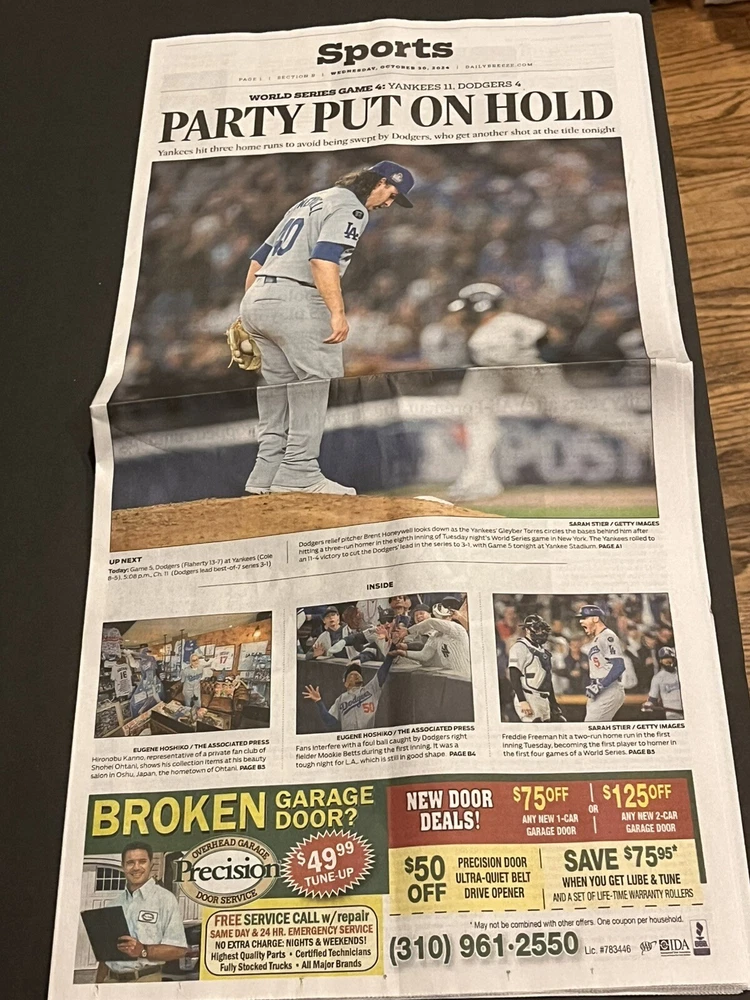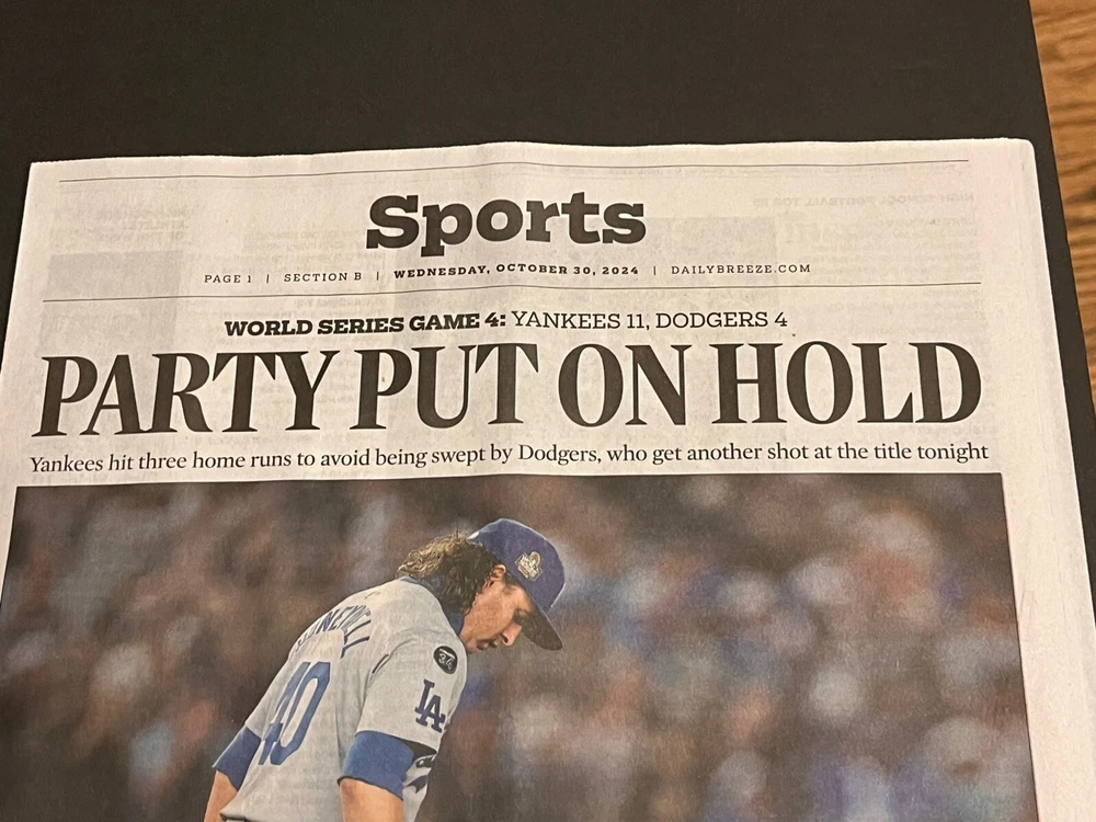 This Daily Breeze newspaper Sports Section from October 30, 2024 is a must-have for any baseball fan. It features the only game that the Yankees won in the World Series.