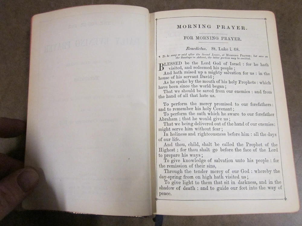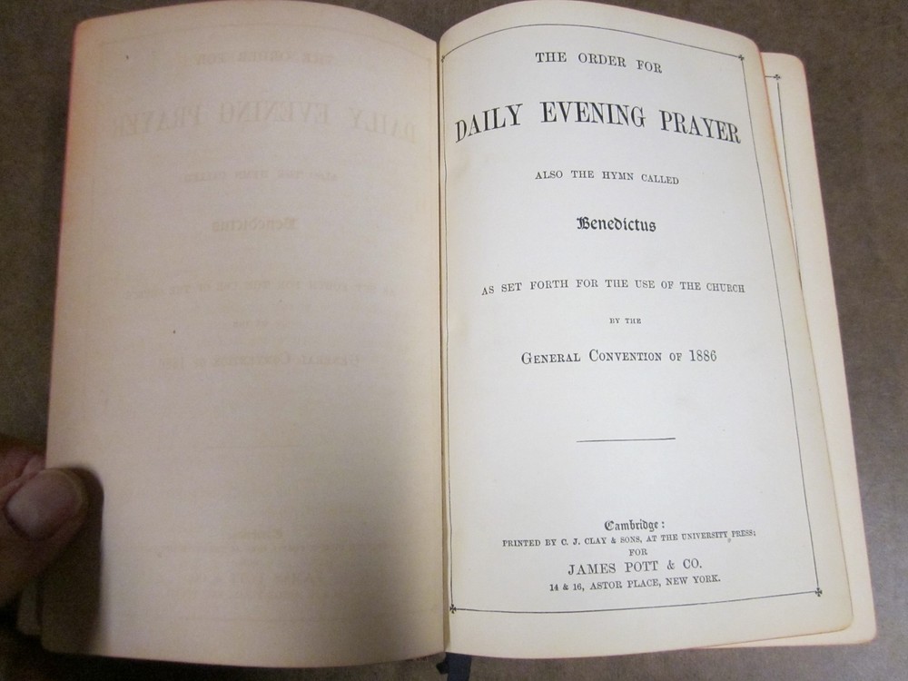 The Order for Daily Evening Prayer. Also the Hymn Called Benedictus. As Set for the use of the Church by the General Convention of 1886. James Pott & Co., publisher, New York. 580 pages. Includes an Appendix of 16 pages entitled: Alterations and Addition in the Book of Common Prayer Finally Adopted by The General Convention in the Year of Our Lord 1886. 4 3/4 by 7 inches. Leather bound. There are only four (4) other copies for sale on the used book market, three selling in the $75 range, the other at $128. Thank you.