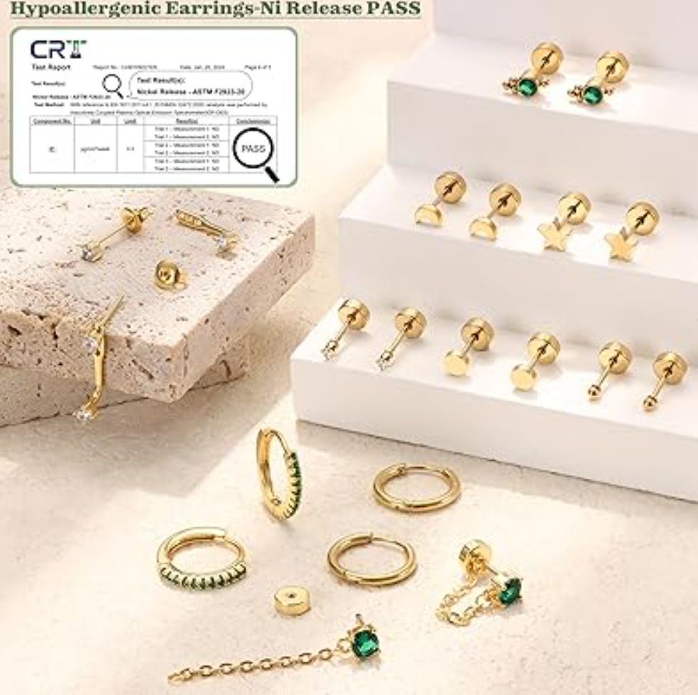 Dainty Gold Flat Back Earrings Hypoallergenic Cartilage Earring Sets for Multiple Piercing 20G Surgical Stainless Steel Earrings Trendy Earring Stacks Small Hoop Flatback Stud Earrings Dainty Cartilage Earring Sets for Multiple Piercing--Multipack Gold Cartilage Earring Stacks.10 Pairs hypoallergenic earrings for women.Including 6 pairs gold studs earrings,2 Pairs small huggie hoop earrings,chain dangle earrings and ear jacket earrings.Wrap It around Your Ears,Dainty Earrings for Women Trendy and You Can Match Gold Earrings with Whatever You Want Hypoallergenic Surgical Steel Earrings--Premium 316L Surgical Steel Earrings for Sensitive Ears.Authoritative Structure Certification,NI Release Pass,No Nickle & Lead,No Allergy,No Irritation.Upgraded Vacuum Real 14K Gold Plated,Long Lasting Color Retention,No Rust & No Tarnish Gold Earrings for Women Comfy Flat Back Stud Earrings for Women--Internally Thread Screw Back Flat Back Earrings,Simple to Wear,Not Easy to Fall off.Comfortable Flat Back Earrings,Won't Poke Skin or Hook Hair,You Won't Feel Discomfort Even When Sleeping or Sporting.FLAT BACK EARRINGS-NICE COMFY NAP EARRINGS Trendy Gold Earrings for Women--"Shine Bright, Be Yourself".It's Our Encouragement for Every Customer to Feel Their Distinctive Beauty While Adorning Our Gold Stud Earrings Set.Trendy,Classic,Dainty,Comfy,Hypoallergenic.Therefore,Not Only Can You Give It to Your Friends, But You Can Also Give Yourself A Surprise Small Hoop and Stud Earrings Set Size--Gauge:20G(0.8MM) Pin Thickness,2MM Tiny CZ Ball Stud Earrings,Flat Backs Size:5MM(0.2 In),Huggie Hoop Earrings Inner Dia:10MM(0.4 In).Lightweight and Hypoallergenic Gold Cartilage Earring Sets for Multiple Piercing,Can Be Used As Stud Earrings,Helix Earrings,Daith,Conch,Tragus Piercing Jewelry.Suitable for Earlobe, Second Hole, Third Hole,Hypoallergenic Earrings Set for 3 Holes.Trendy Triple Piercing Earrings Set,Stacking Match Your Own Style