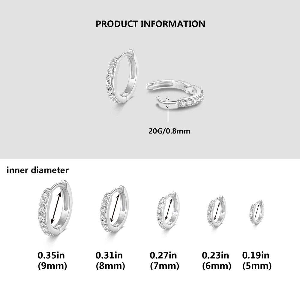 Dainty Tiny White Gold Huggie Hoop Earrings, 5 Pairs Mini Cubic Zirconia Hoops Earring Set for Cartilage Helix Lobe Piercings Small Hoop Earrings 5/6/7/8/9mm for Women Huggie hoop earrings: One package comes with 5 pairs different size mini silver hoop earrings include 5mm 6mm 7mm 8mm 9mm, meet your need for ear multiple piercing. Cartilage hoop earrings: In particular 5mm 6mm 7mm these tiny hoop earrings, are suitable for cartilage/helix/rook/tragus/daith/snug ear piercings. 7mm 8mm 9mm these small hoop earrings suitable for low lobe/2nd lobe/3rd lobe/conch/cartilage/helix ear piercings. Lightweight cute hoop earrings: It is made of very light brass base and plated with 14k gold and white gold. These cz hoop earrings are very light and cute. They can hardly be felt when worn. Cubic zirconia hoop earrings: These small hoop earring inlaid with cubic zirconia. It is sparkling and dazzling that makes you stand out in the crowd, and you will received a lot compliments. Hinged hoop earrings: Every customer is our valuable asset, and we put the customer's needs first. Please feel free to contact us when you have any problems, we will reply and solve within 24 hours. Shipping We offer FREE shipping on all orders! We ship within Three business days of payment, usually sooner. We use a selection of shipping services such as UPS, FedEx, USPS etc. We only ship to the lower 48 states, no APO/FPO addresses or PO Boxes allowed. Local pickups and combined shipping options are not provided at this time. Return You can return a product for up to 30 days from the date you purchased it. Any product you return must be in the same condition you received it and in the original packaging. Please keep the receipt. Payment We accept payment by any of the following methods: PayPal Please pay as soon as possible after winning an auction, as that will allow us to post your item to you sooner! Feedback Customer satisfaction is very important to us. If you have any problem with your order, please contact us and we will do our best to make you satisfied. Contact Us If you have any queries, please contact us via ebay. We usually respond within 24 hours on weekdays. Please visit our eBay store to check out other items for sale! Thank you for shopping at our store.