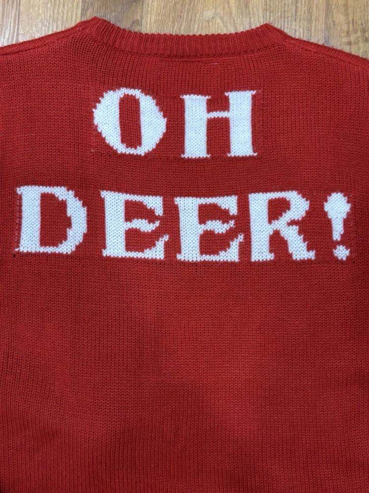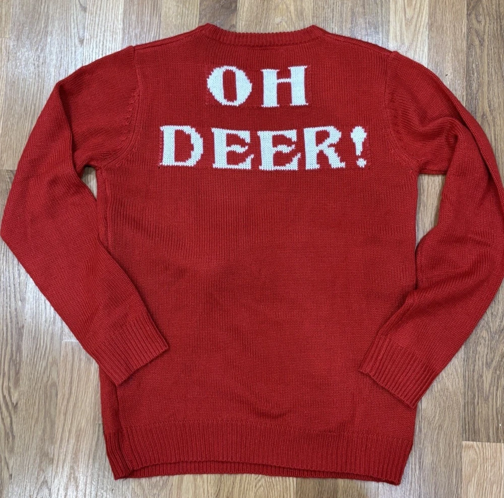 Daisy’s Boutique pom pom nosed Reindeer Christmas sweater. Women’s size medium. Back says “Oh Deer”. Preowned. Good condition.