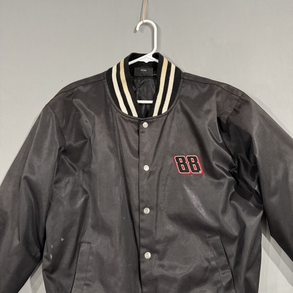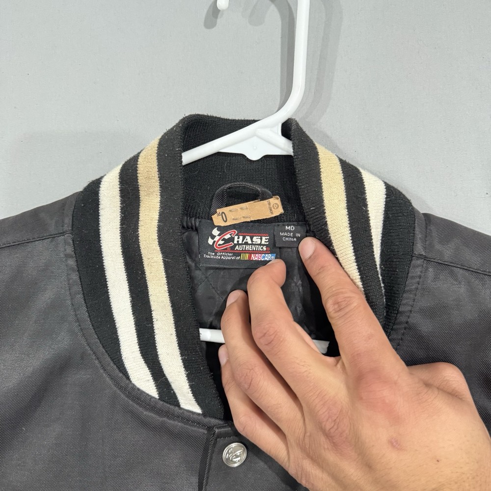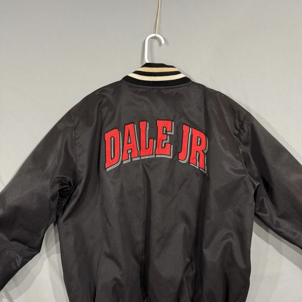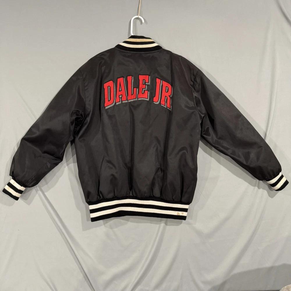 The product is a vintage Dale Earnhardt Jr. #8 NASCAR bomber jacket in size Medium, manufactured in the United States by Chase Authentics. This black jacket features a sportswear design with a bomber/Harrington style from the 1990s. Made from polyester, it is an original piece and ideal for casual occasions. The jacket showcases authenticity and a classic look inspired by NASCAR racing.