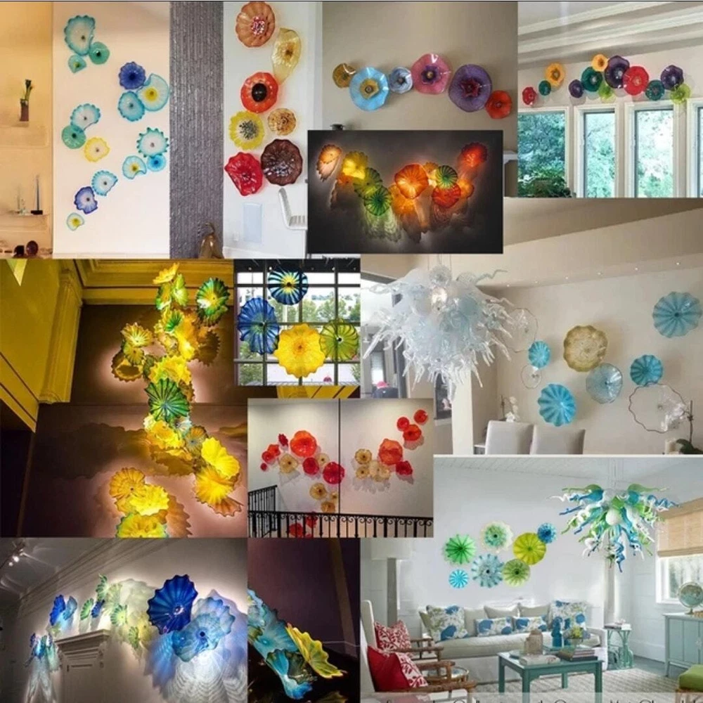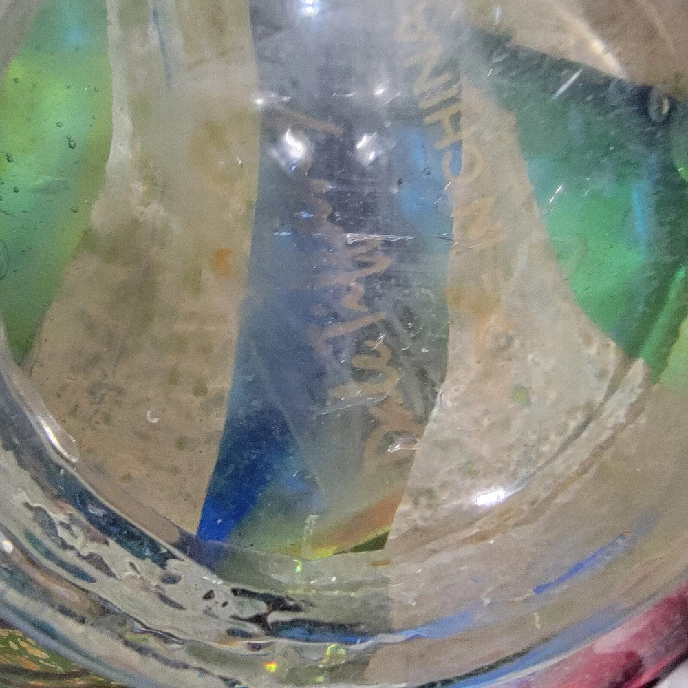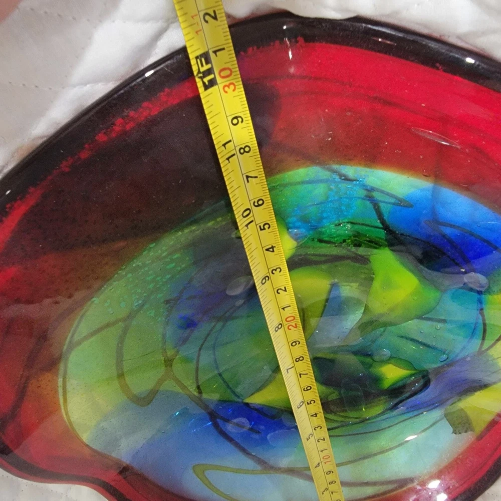 Dale Tiffany Hankley 12" large hand blown glass dish is very versatile and can be used as a display, fruit bowl, secured at base as wall décor. Slightly curved edges, dark blue and green blending, thick red band around edge with black trim. Has a 1" glass base. I have multiple Dale Tiffany dishes in various sizes. You can use a variety of them to create a stunning, artistic wall mural. Soup can is pictured to show size and dimension. Measures 12 inches across and 2.5 inches at the highest part of the curved edge. Like new condition. Never used & label still on the base. You can use a variety of them to create a stunning, artistic wall mural by buying wall brackets at your local home improvement store - brackets not included - example in last pic. Nonsmoking home with awesome pugs.