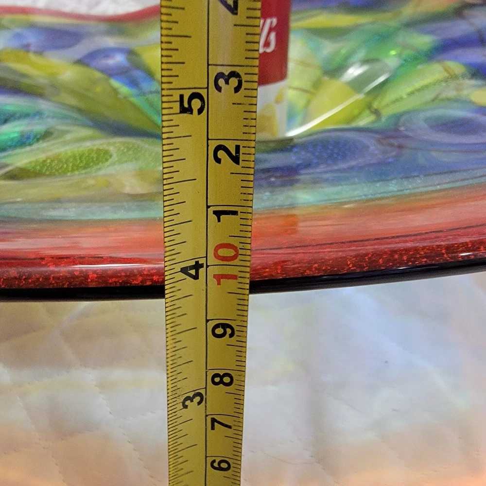 Dale Tiffany 20" Hankley, large hand blown glass dish is very versatile and can be used as an art display, plate platter fruit bowl, or can be secured at base as wall décor. Slightly curved edges, light green and olive colored swirls with blue mixed in, thin red band and black trim. Has a 1" glass base. I have multiple Dale Tiffany dishes in various sizes. You can use a variety of them to create a stunning, artistic wall mural with wall brackets that are not included but can be found at home improvement stores. Soup can is pictured to show size and dimension. Measures 20.5 inches across and 4 inches at the highest part of the curved edge. Like new condition. Never used & label still on the base. Nonsmoking home with awesome pugs.