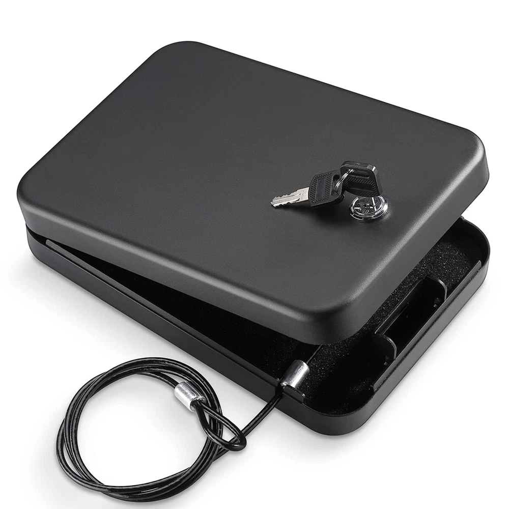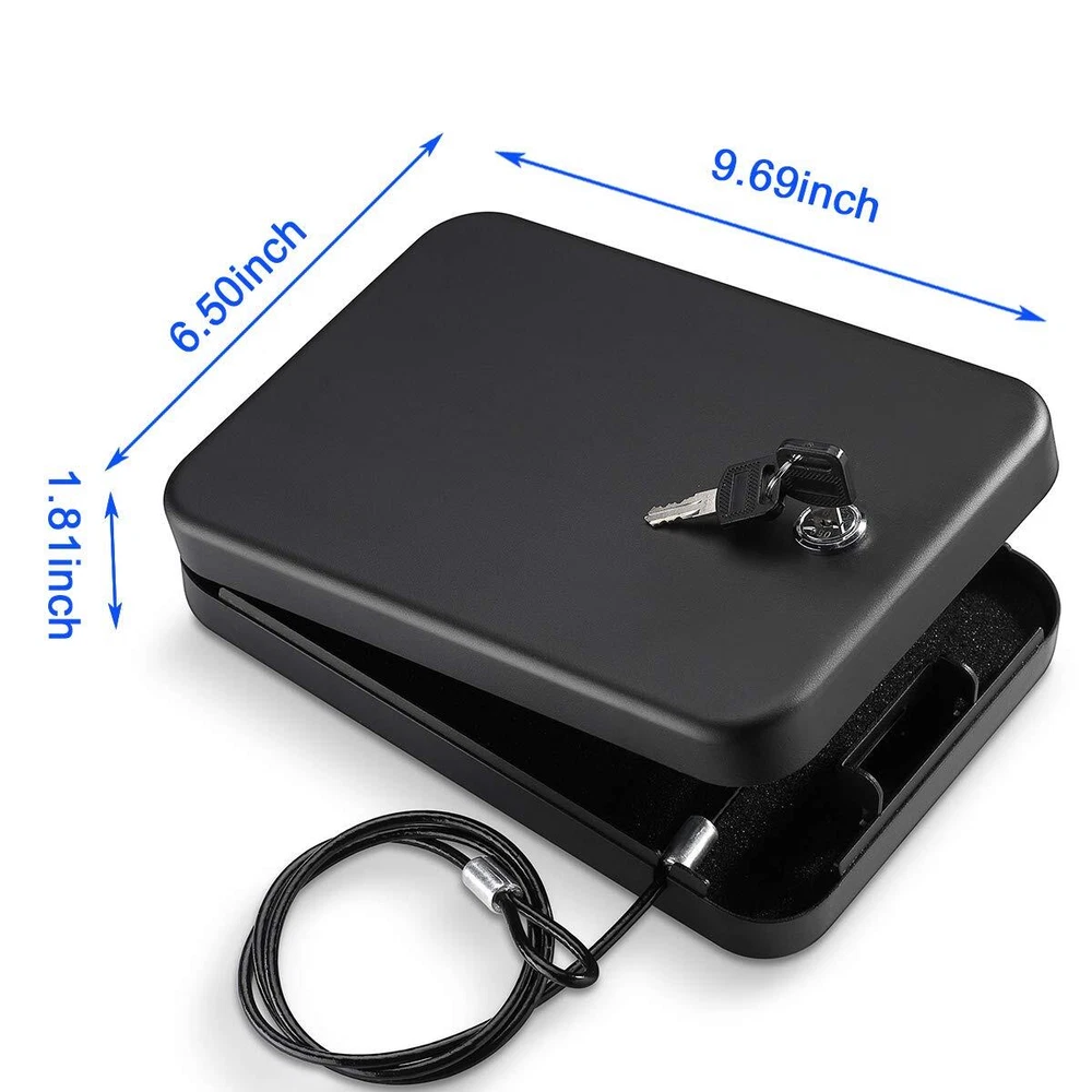 ▲TRAVEL&VALUABLES SAFE: The portable gun safe is perfect for concealed use under a car seat or travel, nice for locking up cash, medicine, passports and jewelry as well as a pistol. ▲DURABLE CONSTRUCTION: The pistol lock box features heavy duty 16 gauge steel housing, the sturdy metal box will provide long-lasting strength and use for years to come. It also comes with a heavy steel cable to secure to a fixture. ▲KEYED LOCKING SYSTEM: Featured with 2 keys can open the safe box quickly ▲SCRATCH PROTECTION: The travel gun safe includes four layer protective foam, ensure security and protect your valuables from scratching or damage during transit. If needed, these pads also can be removed for increased storage capacity. ▲WHAT YOU GET: pistol safe box, a heavy steel cable. 24 hours friendly customer support, 12 months replacements for all parts.