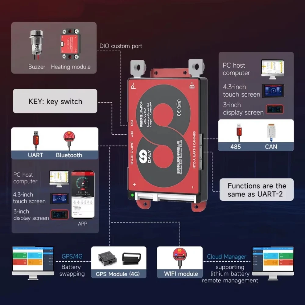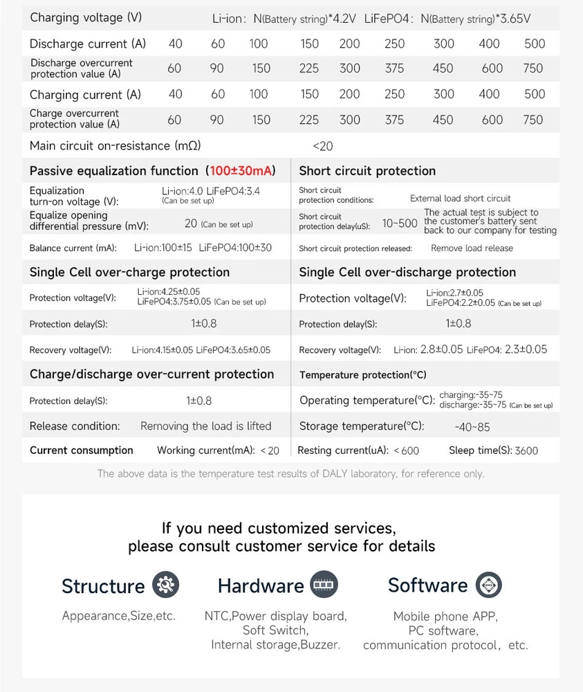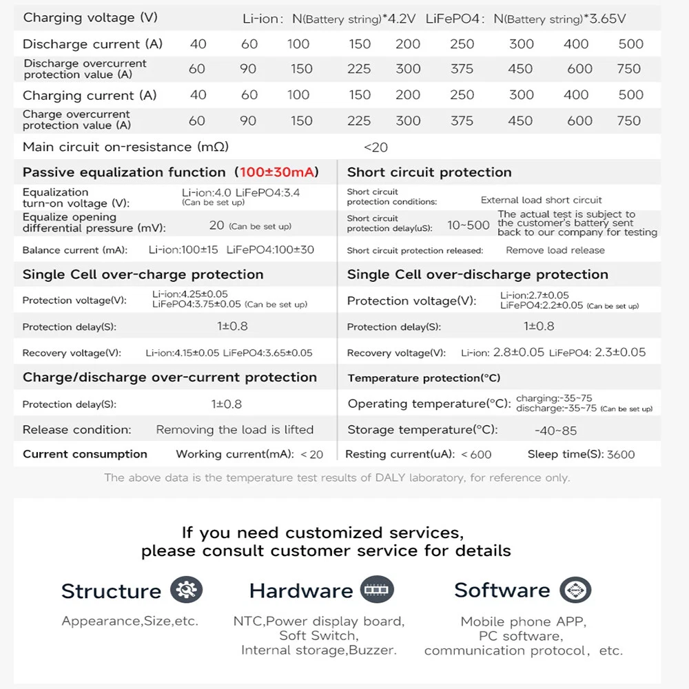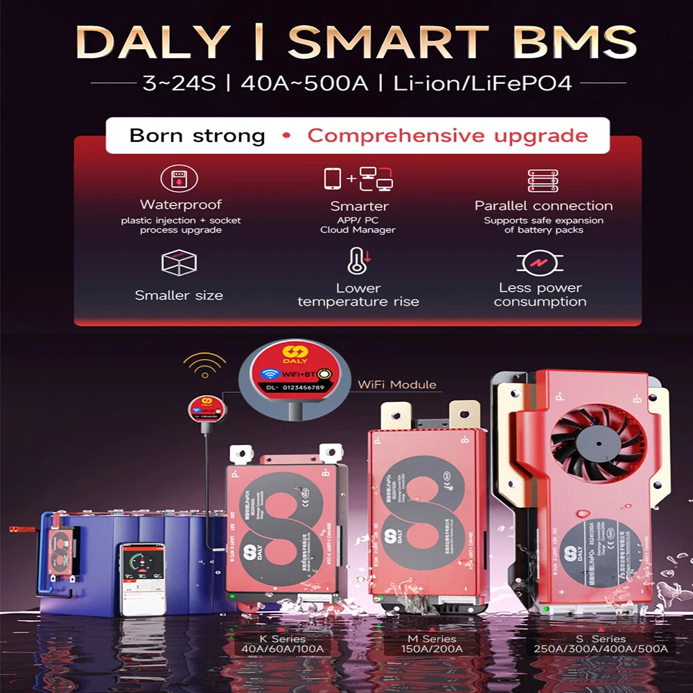 SAFE & SECURE SHOPPING 100% SATISFACTION GUARANTEED FAST SHIPPING Daly 4S 12V/8S 24V/13S 16S 48V/20S 72V Li-ion LiFePo4 Smart BMS+Wifi Module lot Product Description Product Name: DALY K/M/S-Shaped SMART BMS Colour: Red Size: as shown in the picture Applicable battery series and voltage: 4S 12V, 8S 24V, 13S 48V, 16S 48V, 20S 72V Applicable battery type: 3.2V Lifepo4 Battery, 3.7V Li-ionBattery Discharge current: 40A, 60A, 100A, 150A, 200A, 250A, 300A, 400A, 500A Discharge Protection Current: 60A, 90A, 150A, 225A, 300A, 375A, 400A, 600A, 750A Charging current: 40A, 60A, 100A, 150A, 200A, 250A, 300A, 400A, 500A Charging overcurrent protection: 60A, 90A, 150A, 225A, 300A, 375A, 400A, 600A, 750A Passive equalisation: 100±30Ma Working temperature: -40℃-85℃ Package Included: 1*DALY K-shaped SMART BMS 1*manual 2*B- P- Link wire 1*Wifi Module 1*Cable Payment Shipping Returns Contact Us Payment Payment must be completed within 5 days. If you have any problems about payment, please contact us via ebay message. Shipping We only ship to confirmed ebay Order addresses. Please comfirm that your Order address is in line with your shipping address. Please kindly note that the combined shipping is not provided because the shipping fee is calculated by weight. Also, the each additional item means exactly the the same color and size. It takes about 7-15 working days to US; about 10-30 working days to other countries. Transit time may be a little delayed because of the bad weather and customs inspection. If you do not receive your item within 30 working days since payment finished, please contact us immediately for further assistance. Returns Items can be returned for exchange or refund within 30 days from the date you receive your merchandise. We are not responsible for any purchase after this 30-day period. Return shipping is the responsibility of buyer unless the return is a result of our mistake (i.e., your receive the wrong item). We will pay for shipping replacement back to you if an exchange is requested. Contact Us Customer satisfaction is very important to us and our feedback rating reflects this satisfaction. If you have any questions, Our customer service staffs welcome feel free to contact us by EBAY message box. We strive to answer all questions and resolve any problems as quickly as possible. Copyright © 2022 Tongtool On Dec 30, 2024 at 03:10:57 PST, seller added the following information: