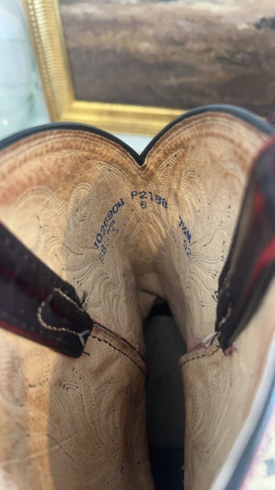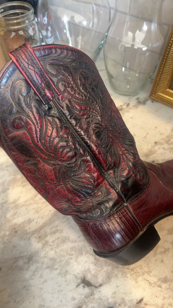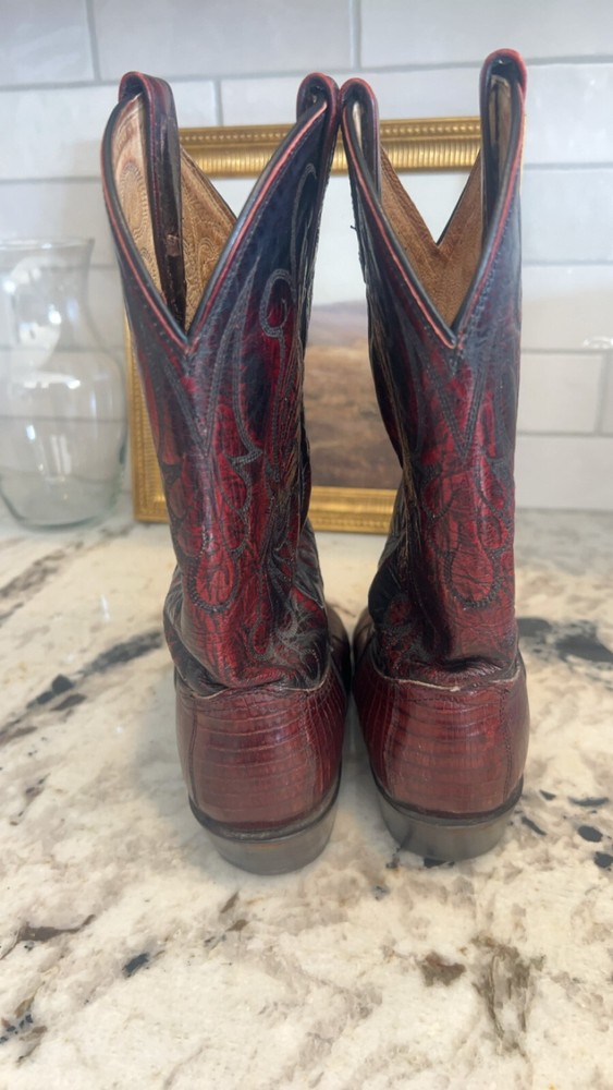 extreamly well made in USA Dan Post cowboy boots. (Im not sure which animal skin it is!) BUT I believe it's a lizard skin or something along the lines of that. Made with real leather and a dark cherry colorway. Has usual worn factors.