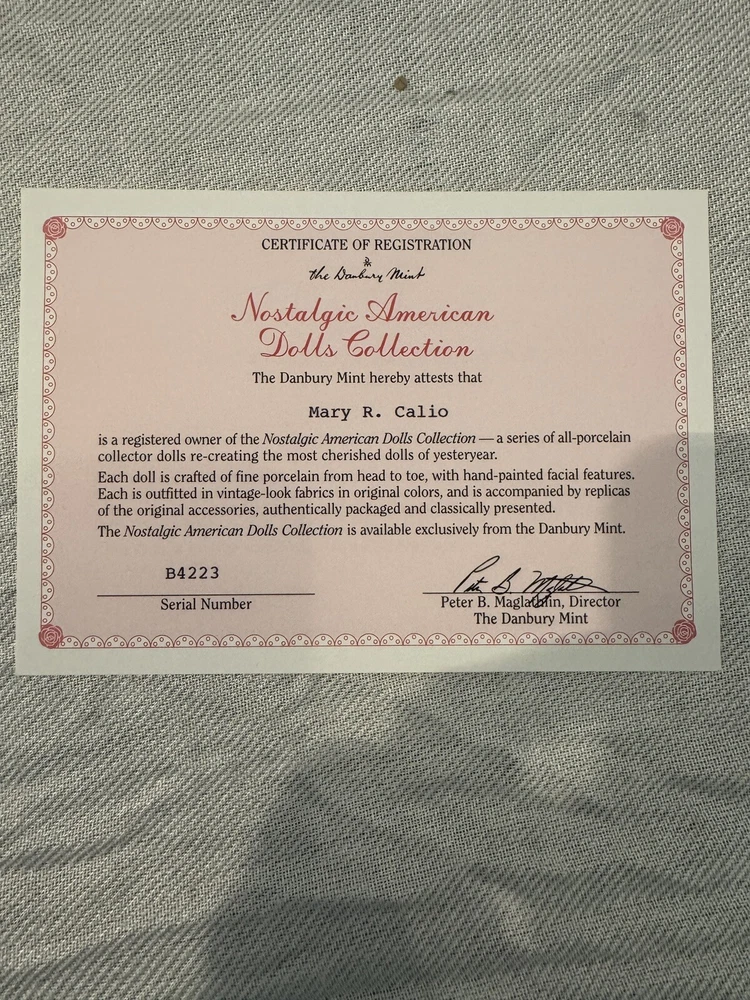 This beautiful Danbury Mint porcelain doll is a special edition. With its vintage charm and licensed reproduction status, it is a must-have for collectors. The doll has light brown hair and blue eyes, with a light complexion. It comes with a set that includes the trunk, doll itself, and many accessories including clothing. The doll comes dressed in a white and pink onesie, and has an additional pink and white dress and other clothes. The doll is made of high-quality porcelain material. It is a perfect addition to any doll collection or a great gift for someone who loves vintage dolls. This set is truly amazing for any doll collector! Certificate of Authenticity and other original paperwork included. Everything has never been removed from the box! PCL12