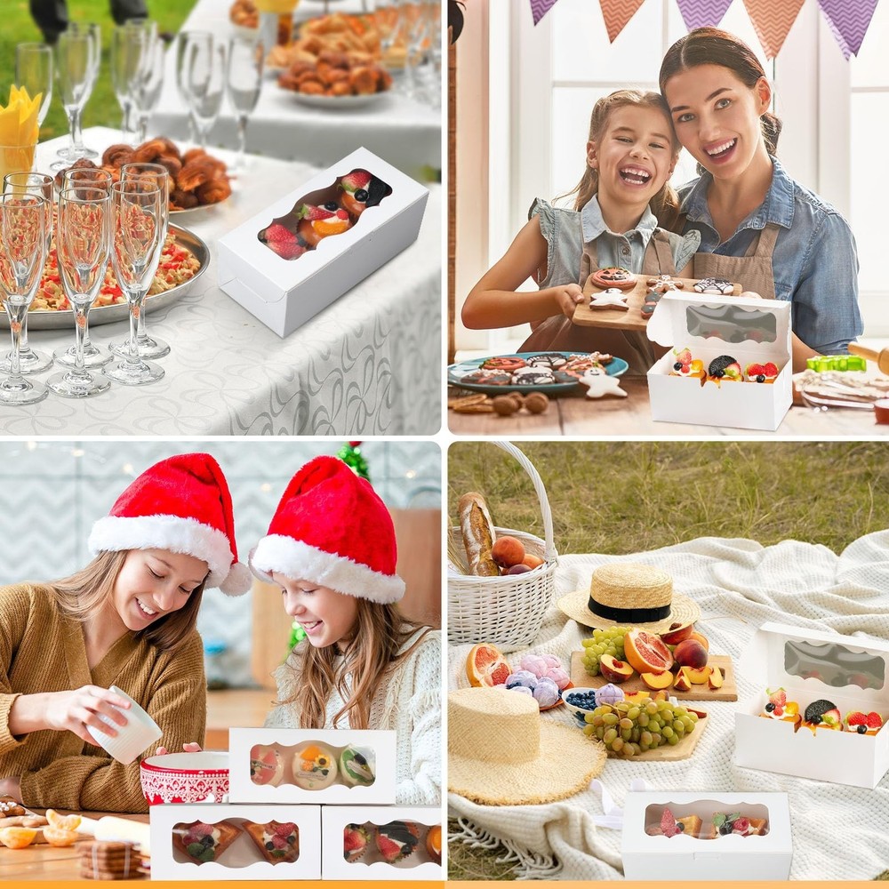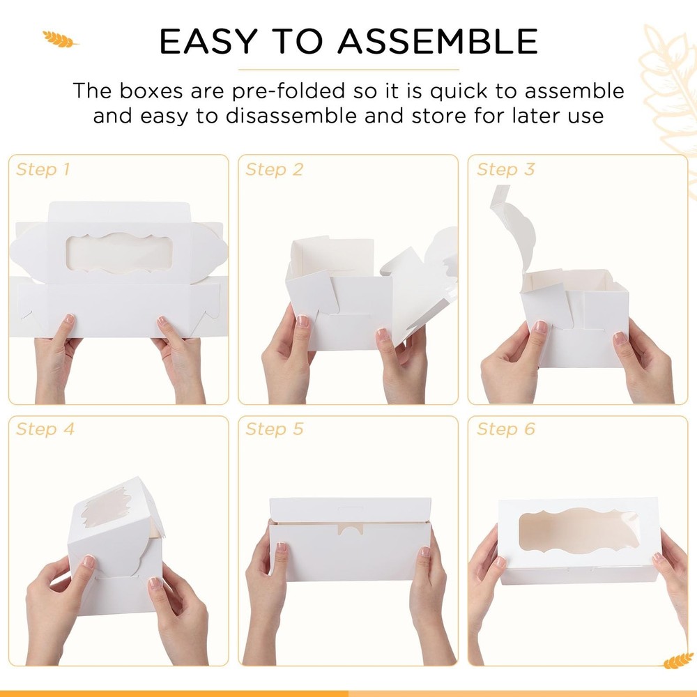 Dandat 60 Pack White Bakery Boxes with Window Large Cookie Box Treat Boxes Strawberries Chocolate Pies Donut Cakes Muffins Pastries Desserts for Wedding (9 x 4 x 3 Inch) Product Details Brand: Dandat Color: White Material: Cardboard Material Feature: Food Grade Product Dimensions: 9.84"L x 5.9"W x 2.16"H Product Dimensions : 9.84 x 5.9 x 2.16 inches; 5.03 Pounds Item model number : Dandat-YURD9098 Date First Available : May 14, 2023 Manufacturer : Dandat Best Sellers Rank: #77,556 in Industrial & Scientific (See Top 100 in Industrial & Scientific) #1,118 in Bakery Take Out Containers #1,118 in Bakery Take Out Containers Customer Reviews: 4.5 4.5 out of 5 stars (19) Package Includes: 60 pieces of bakery boxes for cookies, enough for your daily use or replacement; Patterned open window design makes it cute and stylish, suitable as gift boxes for family or friends for birthday, Valentine's Day, New Year, Thanksgiving and Christmas Optimal Size: each box measures 9 x 4 x 3 inches/ 23 x 10.2 x 8.8 cm, which provides ample space to store and display the baked goods; The optimal dimensions make it easier to handle and transport the boxes, while the clear windows offer high visibility to the contents inside; Manual measurement, please allow 1-2 cm errors on size Elegant Bakery Boxes for Any Occasion: these white colored boxes with clear windows are ideal for displaying your home-made baked treats at any event, whether it's a birthday party, wedding, holiday party, or baby shower; These versatile boxes can hold various baked goodies like cakes, pies, cookies, cupcakes, muffins, donuts, macarons, pastries, chocolates, strawberries and more Easy to Assemble: the boxes can be easily assembled at home, without the need for any additional tape or tools; The preset creases make it convenient for anyone to assemble the boxes manually; The easy-to-assemble feature saves time and effort while packaging your baked goods Features: Practical boxes: The white cookie boxes are useful supplies for packing gifts to your loved ones or customers without worrying about the cakes getting damaged during transit. Easy to deal with: These bakery pastry boxes will help you a lot in holding a party. They will support and display the delicious food, thus your guests are willing to eat them. After the party, you can directly throw away the boxes if they get dirty. Specifications: Material: white cardboard Color: white Size: 9 x 4 x 3 inches/ 23 x 10.2 x 8.8 cm Package includes: 60 x Cookie boxes with window Notes: Manual measurement, please allow slight errors on size. The color may exist a slight difference due to different screen displays.