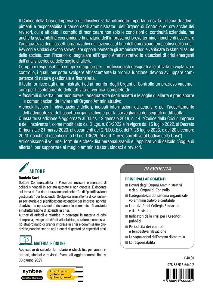 Further Details Title: Gli obblighi di sindaci e revisori nella prevenzione e gestione della crisi. Adeguati assetti e soglie di allerta (Crisi di impresa e insolvenza) Condition: New Format: Paperback EAN: 9788891664402 ISBN-10: 8891664405 Author: Daniela Savi Item Weight: 1 Kilogramsg Release Date: 11/14/2024 Language: Italian ISBN: 9788891664402 Type: Kommunalpolitik Item Length: 30mm Item Height: 240mm Release Year: 2024 Missing Information? Please contact us if any details are missing and where possible we will add the information to our listing.