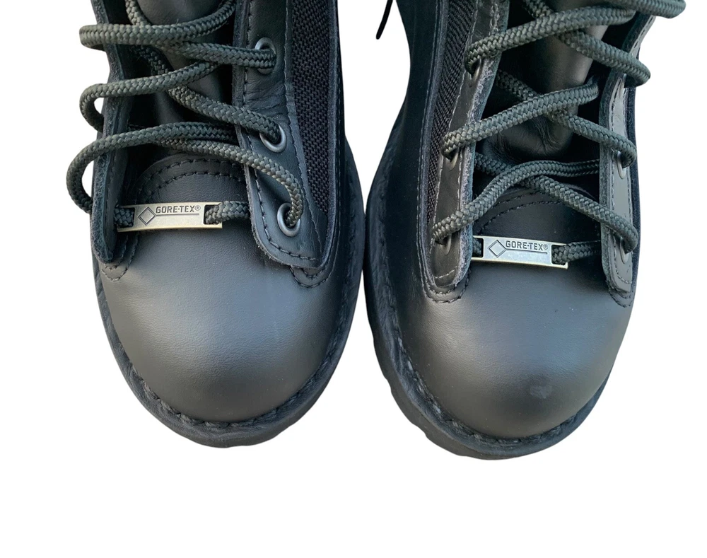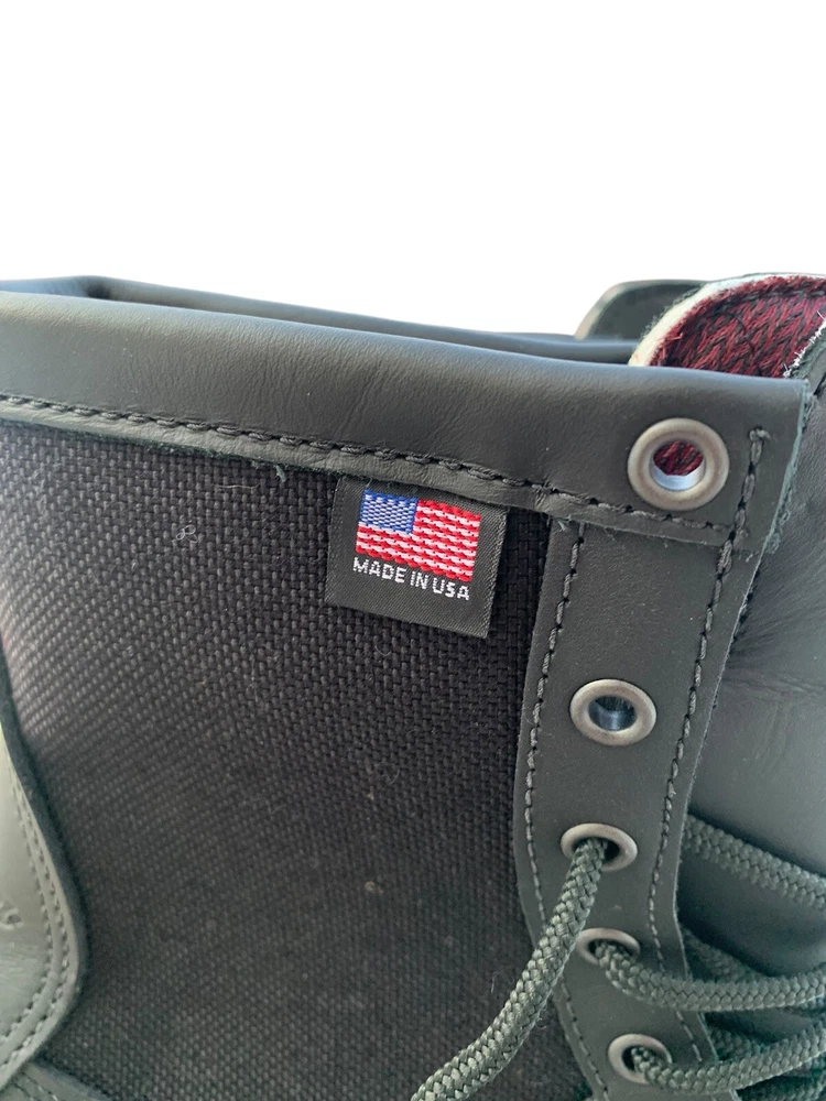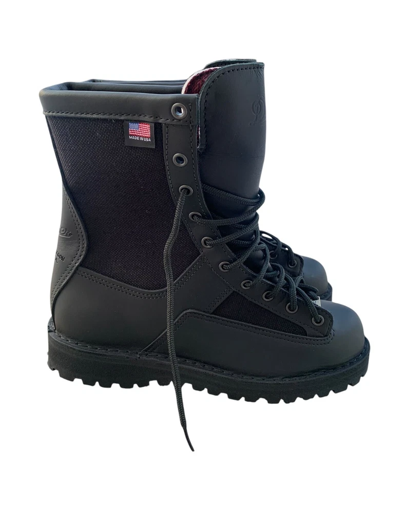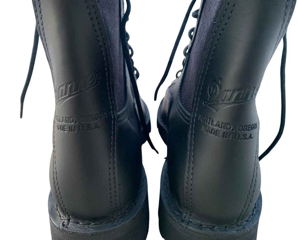 The Danner Acadia 8" Black Combat Gore-Tex Boots are a vintage style boot designed for men in size 7 EE. Handmade in the USA, these boots feature a round toe shape, lace-up closure, and mid-calf shaft style. They are made of black leather with accents like lace, eyelet, and logo details. The boots have arch support, waterproofing, and insulation, making them suitable for winter, fall, and spring wear. The Danner Acadia boots are part of the Danner product line and embody a USA theme.