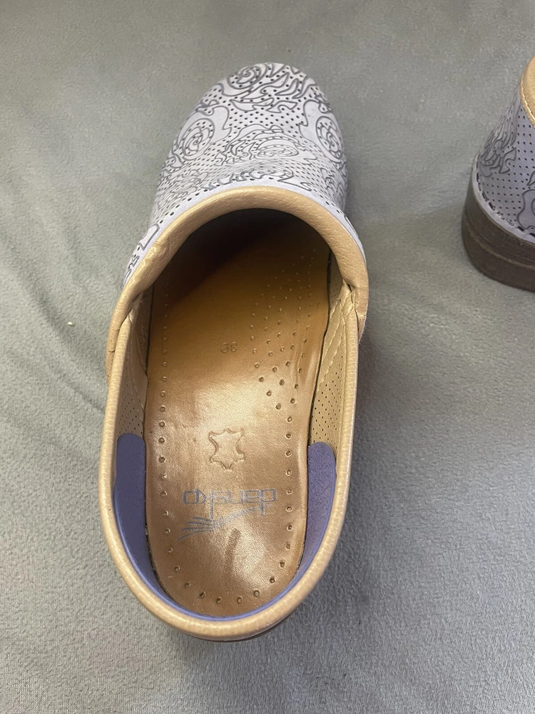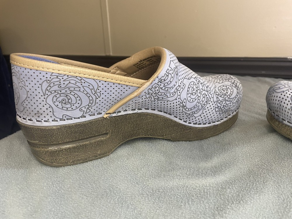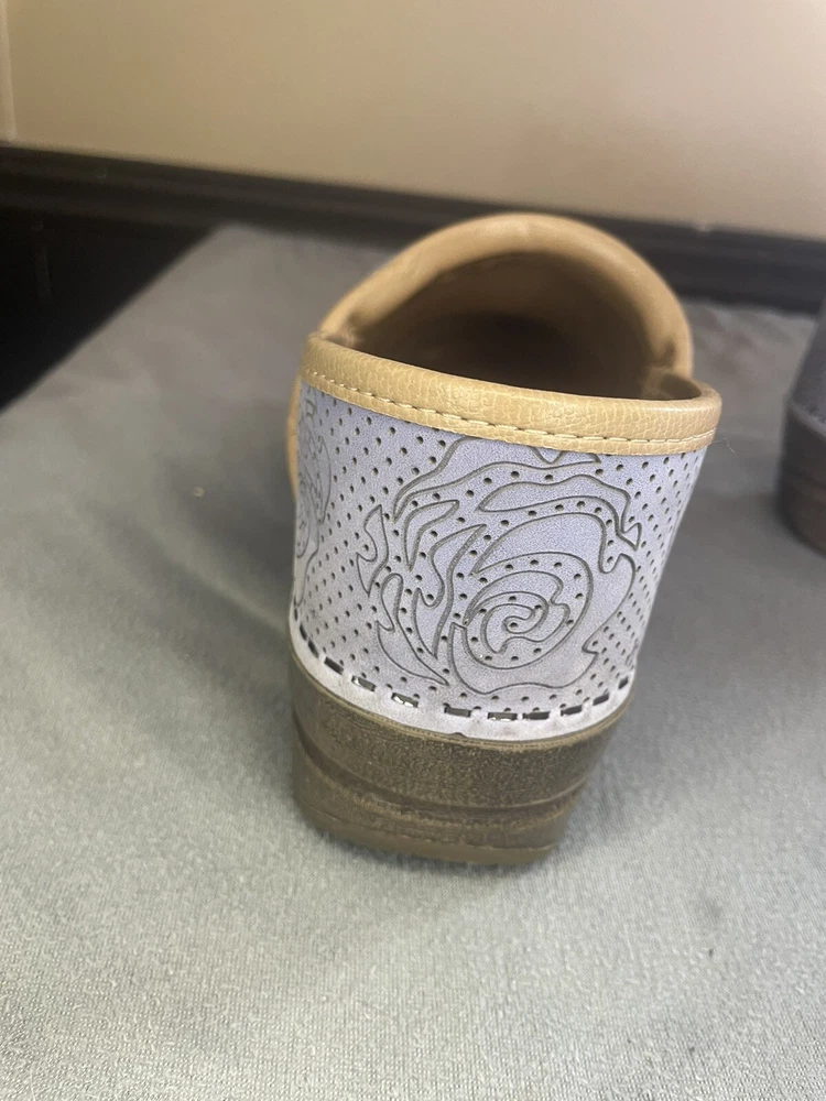 Dansko clogs are perfect for women who want both style and comfort. These blue suede clogs feature a round toe shape, slip-on closure, and a mid-height rocker heel style. The shoes are cushioned and have a comfortable feel, making them suitable for casual and workwear occasions. The clogs are perforated with a floral pattern, which adds a touch of bohemian and classic style to them. These shoes are handmade in China and are available in a standard shoe width. They are perfect for walking and are available in all seasons, including winter, summer, fall, and spring. The lining material is leather, and the upper material is also leather. These shoes are a great addition to any wardrobe and are perfect for those who want a comfortable and stylish pair of shoes.