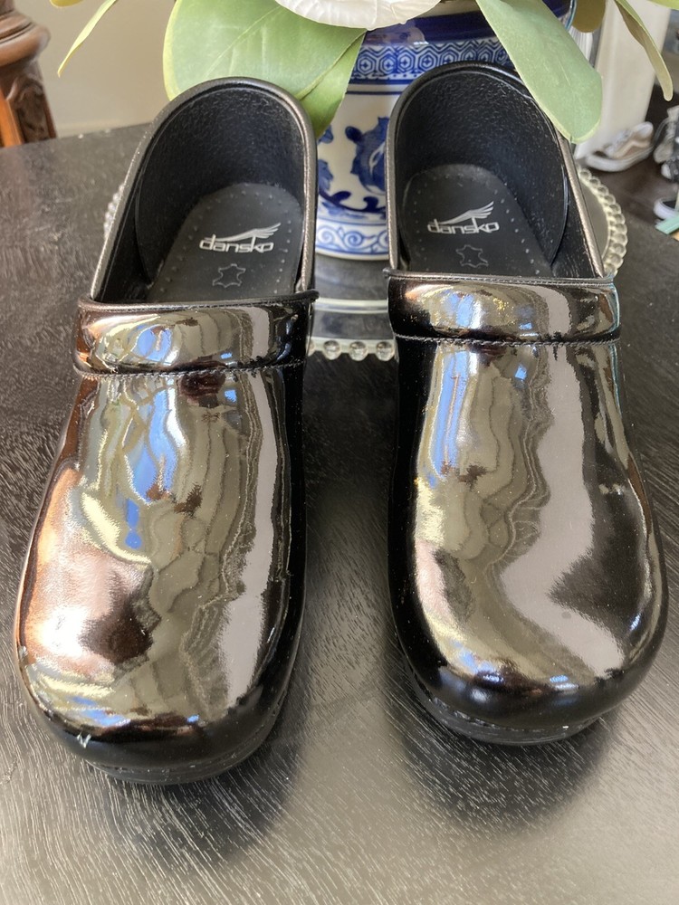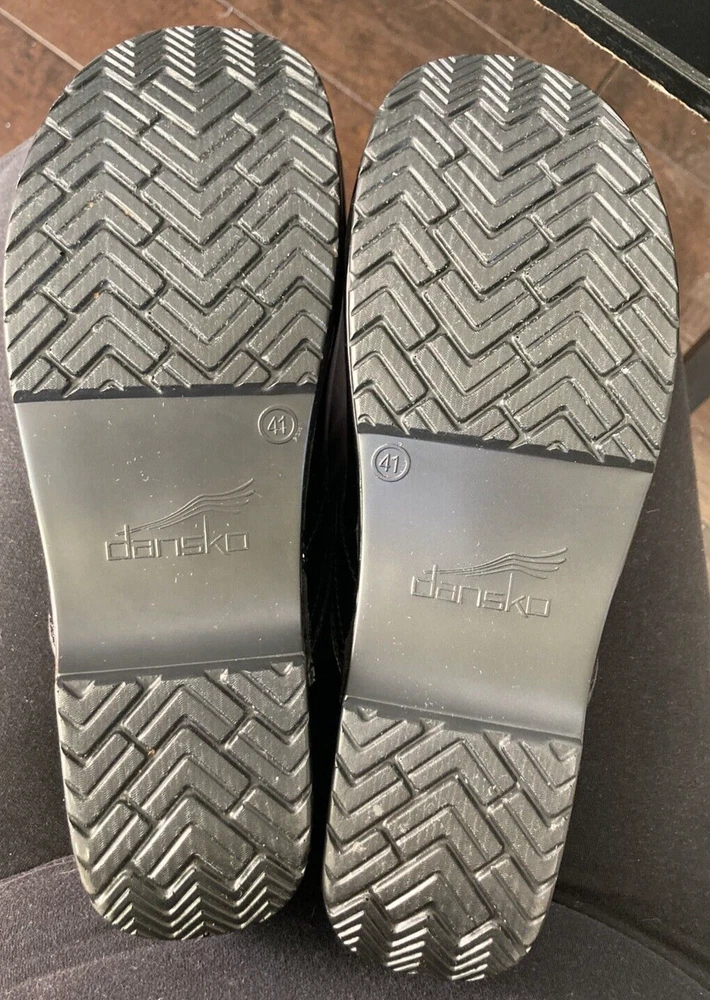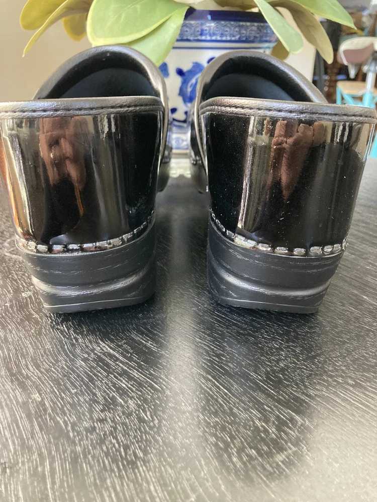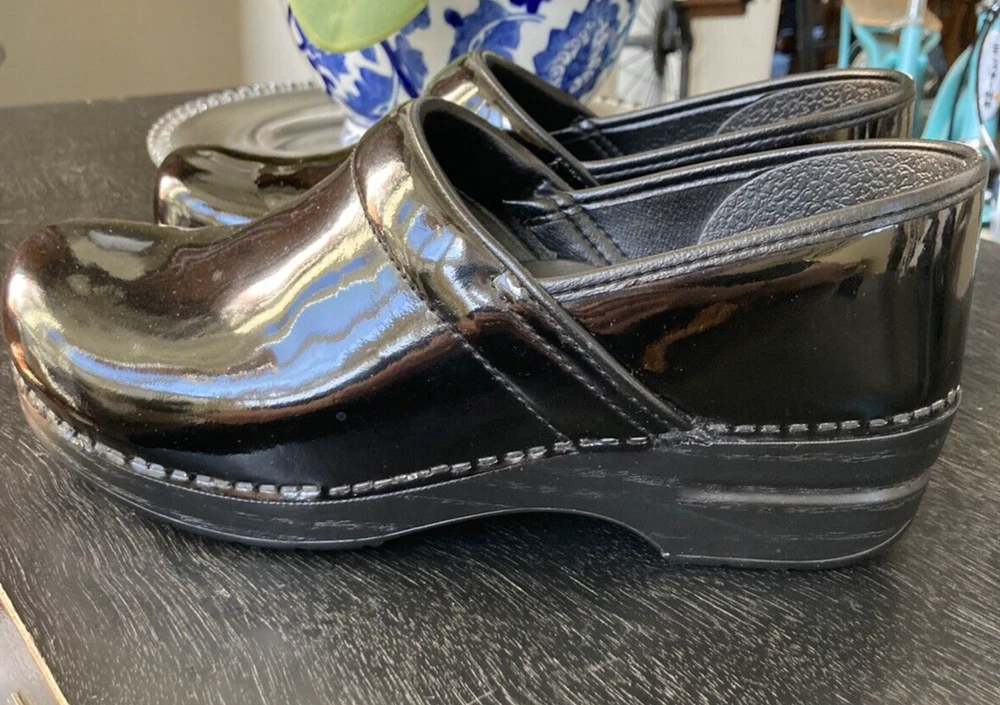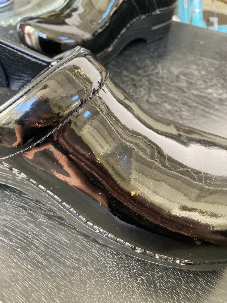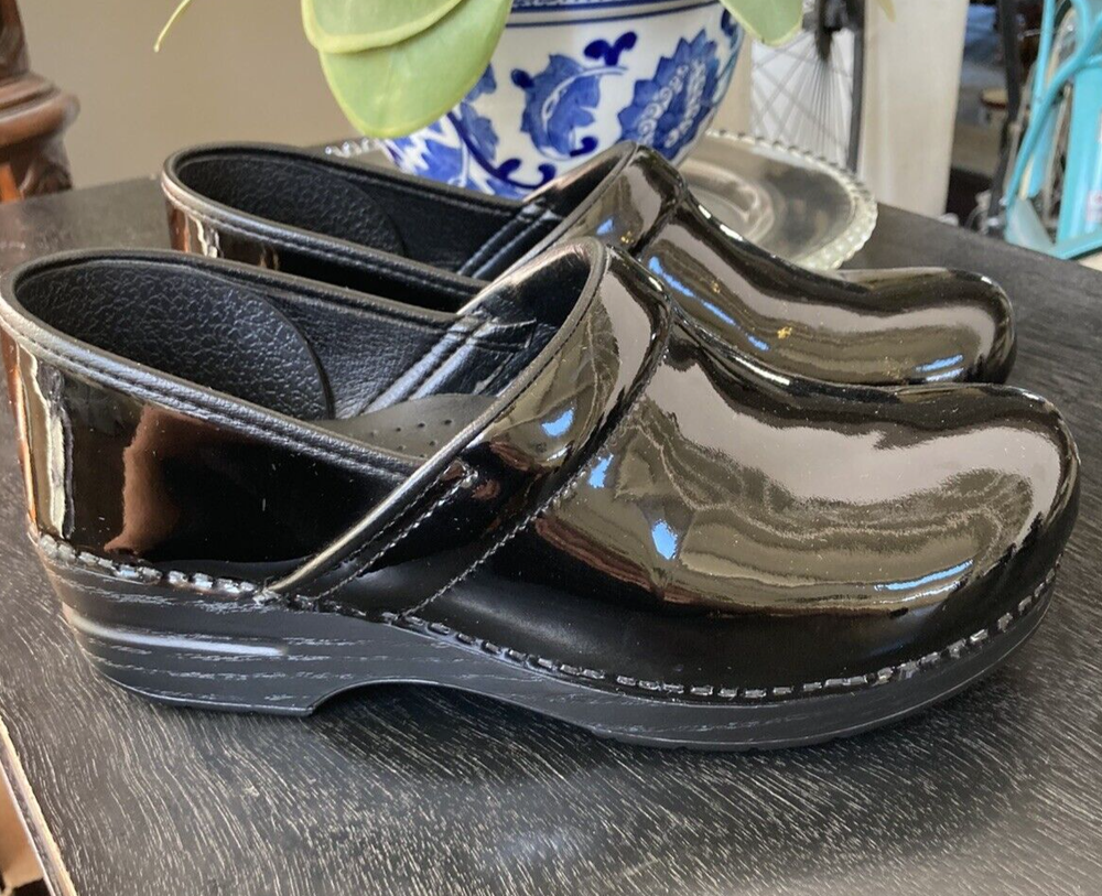 READ -The product is a pair of Dansko Professional clogs for women in size 41, featuring a sleek black patent leather upper material. These slip-on clogs have a standard shoe width and a solid color, perfect for those seeking both style and comfort. With a professional design and a classic clog style, these shoes are described as "like new," ensuring a high-quality appearance for the wearer. Perfect for those in need of comfortable and stylish footwear, these Dansko clogs are a versatile option for comfort and style while on the job. Very light wear and minor scuff in the photo.