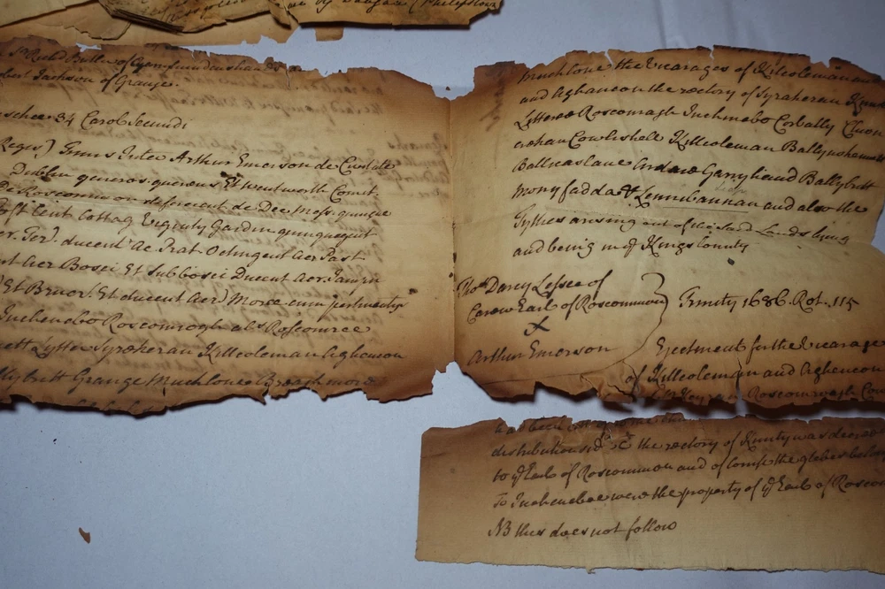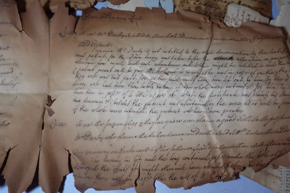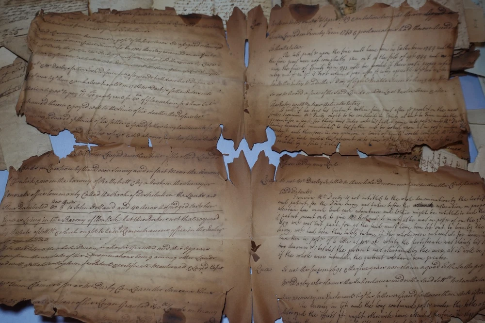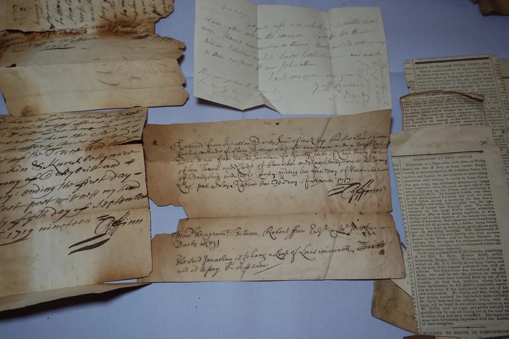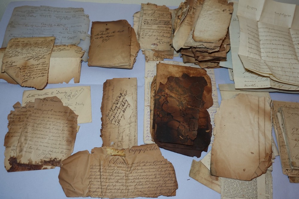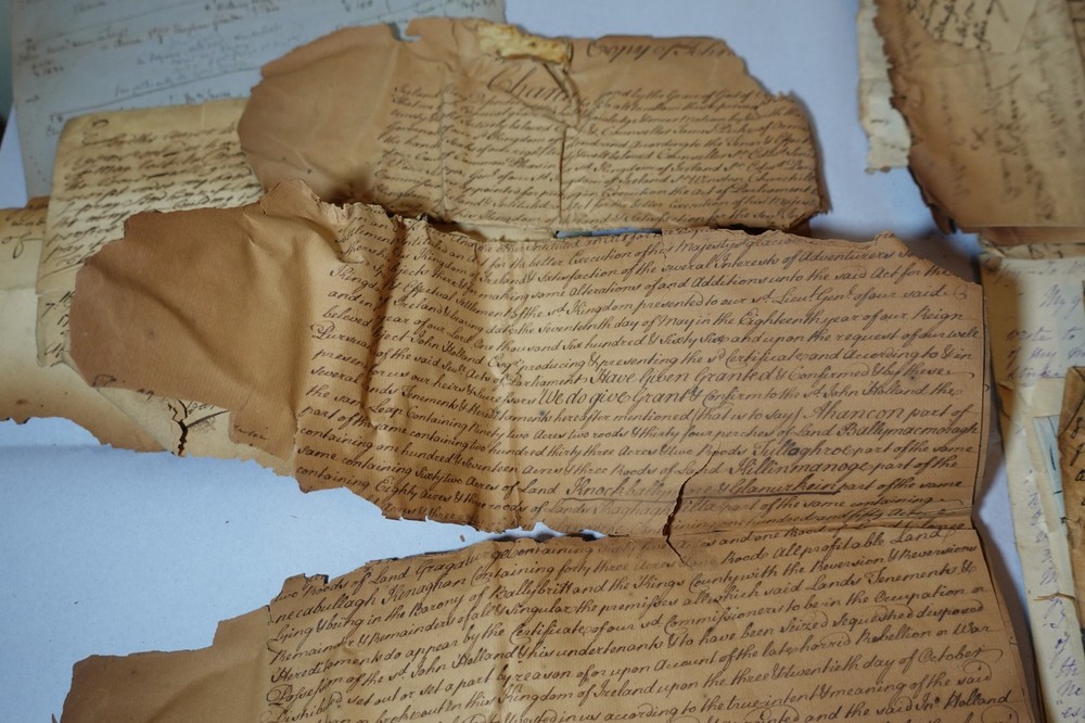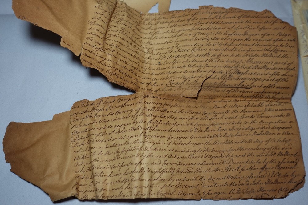 Darby Family Leap Castle Ireland 1660s-1860s Rare Original Historical Papers & Documents Lot All items are in Antique Condition with years ranging from 1662 to 1863. Included: 1. Handwritten Letter Signed by "St. Vincent" and addressed to "Dear Lady Hamilton." It is undated. St. Vincent was John Jervis, the 1st Earl of St. Vincent (1735-1823). Measures approximately 4 3/8" x 5 7/8". 1 Page. 2. Handwritten Letter Signed by "St. Vincent" and addressed to "My Dear Lady Hamilton." It appears to be dated "1 January 1799." Letter mentions Captain Darby of the HMS Bellerophon and the "Nile." Part of Darby's name is chipped on the right side of the letter. Measures approximately 4 3/8" x 5 7/8". 1 Page. 3. Envelope with writing on the outside, which mentions "Letter written to Darby dated Feb 27, 1799." It also mentions Gibraltar, the Bellerophon and St. Vincent. Measures approximately 3 5/8" x 5 3/4". Envelope is empty. 4. Folded Papers with "Copy Hollands Patent" and "1717" written on the outside. These papers have a heavy fold with extensive tearing along the folds. All pages have tearing. The fold is completely uneven. Folded, the item measures around 4 3/4" x 6 1/2". When the fold is straightened out, it is around 4" x 11 7/8". It is difficult to open these papers due to the fold and tearing. Papers are extremely fragile. There appears to be three pages The papers do mention "John Holland," "Ahancon," "Leap," and discusses land and likely property, I'm not sure. When carefully opening it up, it seems to measure 11 3/4" x 11 3/4" (give or take). I noticed that the top section of these papers was missing but found a loose segment which appears to be part of this missing area. It measures around 3 7/8" x 8 7/8". 5. Notebook with heavy darkening to the outside pages, possibly fire damage. Measures approximately 5 1/8" x 8 1/2". Around 60 Pages. This antique book is fragile with extensive tearing, chipping and wear. Pages have handwritten text which seem to be related to the Royal Navy. There are mentions of Pendants, various colors, flags, and words like "fleet" and "ships." No date or an indication on who wrote this information. This may have been written by a student learning about naval customs and meanings. I don't have any other information. Notebook has heavy wear and needs to be handled with care for preservation. 6. There are four segments of torn paper with family history written on them. Names include Christopher, Lawrence, Robert, Edward, and more. These were all part of the same document at one time. Segments measure around 6 1/4" x 6 1/2" (give or take). On the outside of the paper it reads, "Lovett Pedigree." The Lovetts and the Darbys were connected through marriage. 7. Undated Letter appearing to be addressed to "Honored Sir." Letter may be signed by Jonathan Darby, I'm not sure. Measures approximately 7 3/8" x 11 1/4. 1 Page. Document has heavy tearing. Top part of the letter is nearly torn loose at the fold. 8. 2 Letter Fragments which appear to be part of the same letter. It is signed by "John Holland." I don't see a date. Heavy tearing, folds and missing parts of the papers. 9. Letter Fragment signed by "John Holland." Heavy tearing, folds and missing part of the paper. This letter does not open and I don't want to risk further tearing by trying to open it. I don't see a date. 10. Letter Fragment signed by "John Holland." Heavy tearing, folds and missing part of the paper. 11. Letter Fragment addressed to "Mr. Darby." No signature. Measures approximately 2 1/2" x 6 3/4". Heavy tearing, folds and missing nearly all of the paper. 12. Letter Fragment with no identifiable names. Measures 7 1/2" x 11 3/4". Heavy tearing, folds and missing part of the paper. 13. Unknown Document mentions "John Holland" and "Jonathan Darby" and appears to discuss land/property. It is four pages torn into two segments. Multiple years mentioned including 1666 and 1742. Segments measure around 7" x 9" (give or take). Heavy tearing, folds, chipping and missing parts of the paper. 14. Letter signed by "John Holland" addressed to "Darby." Measures approximately 6 7/8" x 11 1/2". 1 Page. Heavy tearing, folds, chipping and missing parts of the paper. 15. 16 Letter Fragments. Some torn pieces are as small as 2" x 3 3/8. Darby's name is mentioned throughout the pages. These items may be connected to other papers within this batch or some other document in this collection, I'm not sure. Largest measures around 6 1/4" 11 1/2". Heavy tearing, folds, chipping and missing sections. 16. Envelope with writing on the front side, which reads: "Pedigree showing connection between Darbys, Bennetts, Lovetts and Poes." Measures 3 5/8" x 4 3/4". 17. Family Genealogy Chart mentioning the Lovetts, Bennetts...etc. Measure approximately 7" x 8 3/4". 1 Page. 18. Unknown Handwritten Letter/Document measuring approximately 4 1/2" x 7 1/4". 4 Pages. Undated. Heavy tearing, folds, chipping and missing sections. 19. Letter addressed to "My Good Fellow" dated 1783. Above that it reads, "Copy to Mr. Charles Vaughan." Measures approximately 6 1/2" x 8 1/4". 5 Pages. I don't know who wrote this letter. Heavy tearing, folds, chipping and missing sections. 20. Document Fragment which mentions the "Earl of Roscommon." I also see the year "1686," although I don't know if it was written that year or if was just mentioned as a historical reference. There are two parts to this document, one measures just 2 1/4" x 7 1/2" and the larger segment measures around 6" x 7 1/2". Heavy tearing, folds, chipping and missing sections. 21. Letter addressed to "Mr. Darby" and signed by "John Holland." Measures approximately 5 3/4" x 7 1/2". I don't see a date. Heavy tearing, folds, chipping and missing sections. 22. Letter addressed to "Jonathan Darby," and it appears this was also written by "John Holland," although the signature is torn. The date is also torn away. Measures approximately 6 1/2" x 12 1/2". Heavy tearing, folds, chipping and missing sectio