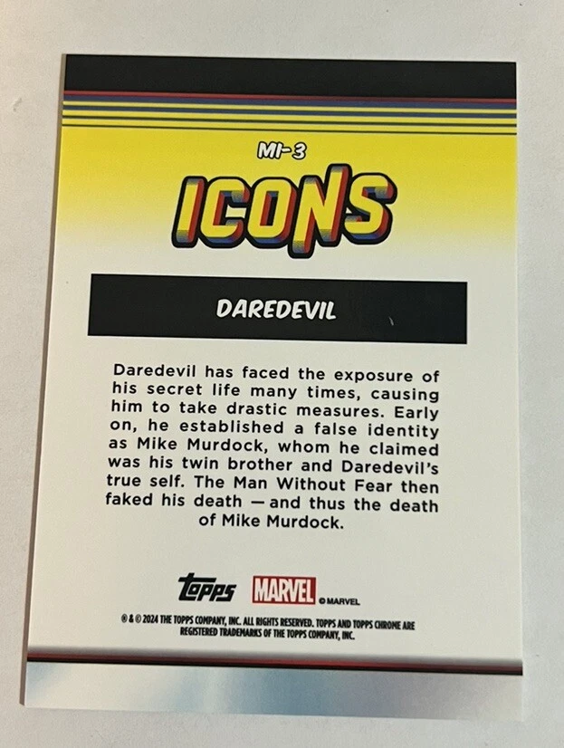 Character: Daredevil Autographed: No Set: 2024 Topps Chrome Marvel Insert Set: Icons Franchise: Marvel (MCU) Genre: Comics gtin13: Dose Not Apply Type: Non-Sport Trading Card UPC: Dose Not Apply Year Manufactured: 2024 Features: Insert Card Number: MI-3 Manufacturer: Topps Autograph Authentication: Topps