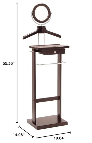 The Alfred Valet Stand accommodates a shirt, jacket, trousers, ties, and pair of shoes. This valet features a center storage drawer perfect for keys and a wallet, and a tilt mirror. The solid wood base for resting your shoes. Sold as 1 Each. Dark espresso solid wood construction. Features includes coat/shirt hanger, bar, mirror and drawer. Dimensions: 55.33"H x 19.84"W x 14.96"D. Functional and attractive addition to any bedroom or dressing area. Assembly required. Keep your clothing wrinkle-free and ready to go. Finish: Dark espresso.