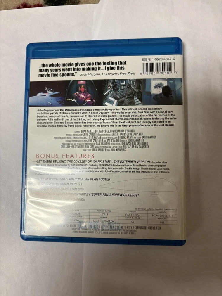 Aspect Ratio:1.78:1Sub-Genre:Comedy VideoFormat:Blu-raygtin13:0089859901027UPC:0089859901027Movie/TV Title:Dark Star (Hyperdrive Edition)Genre:Science FictionStudio:VCI VideoDirector:John CarpenterRun Time:83 min.Producer:J. Stein Kaplan, Jack H. Harris, John Carpenter