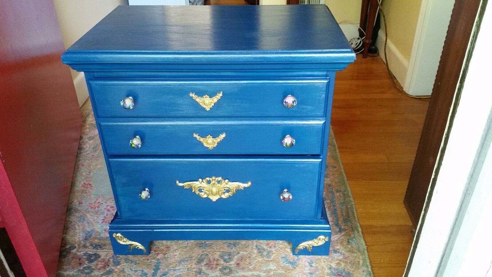Dark blue /turquoise nightstand, or a side table. This piece is hand-stained with decorative ornaments highlighted in gold. Knobs are multi-faceted glass, which changes color depending on the light. It has 3 drawers.