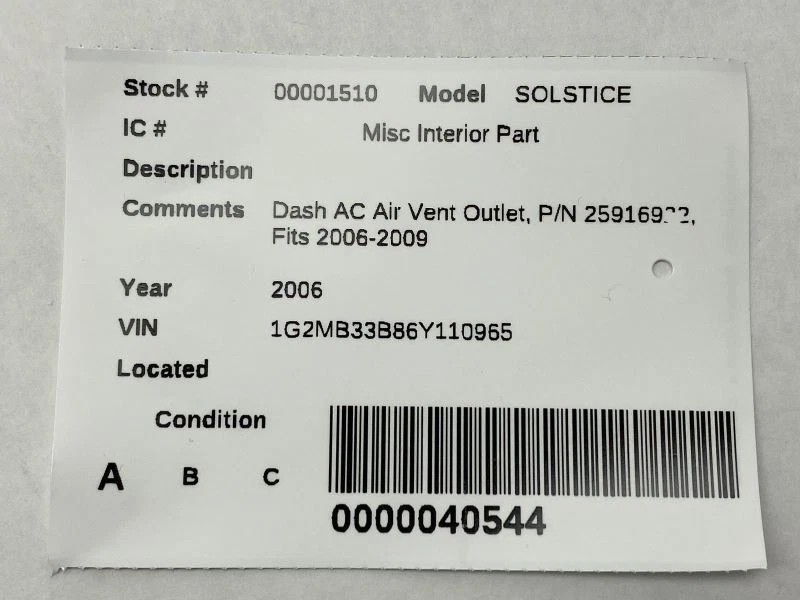 Hollander Welcome to our eBay store! Dash AC Air Vent Outlet 25916922 Fits 2006-2009 Pontiac Solstice 82638 Description This listing is for a used Dash AC Air Vent Outlet. The part pictured is the actual item you will receive, no other parts are included. This part is used so normal wear, such as scratches, scuffs or fading is to be expected. Please see part fitment information and please match part numbers before buying this item. If you have any questions please let us know. Donor Vehicle Model : SOLSTICE Year : 2006 Mileage : 96000 (0 = not available or unknown) Stock Number : 001510 Notes : DASH AC AIR VENT OUTLET, P N 2591692 112624 This Part Will Fit These Makes And Models With These Options About Us Payment Shipping Returns Warranty About Us Please contact us with any questions BEFORE purchasing. If you are unsure if this part will fit we are happy to verify fitment for you prior to purchase via your vehicle's VIN (Vehicle Identification Number). We try to answer all messages in 24 hours. Please note that orders are sent to the shipping department throughout the day therefore we cannot guarantee adjustments to orders after payment is received. Our hours of operation are: Monday - Friday 8:00AM - 5:00 PM CST Saturday - Sunday Closed Payment All orders must be paid in full prior to shipment. Payments are processed through eBay. We accept credit card and cash for Local Pickup orders. If payment is not received, an Unpaid Item case will be opened for the sake of seller fee reimbursement. Sales tax will be collected by eBay where applicable. Shipping We ship items via UPS, USPS, or LTL Freight Carriers. Tracking information is uploaded to the order once the item is shipped. Larger items such as Engines, Transmissions, Doors, Tailgates, Trunk Lids, Rear Axles etc. will ship via freight. Freight items are unable to be shipped until we have all the necessary information required by the carrier. Typically that includes a valid business name, address, valid phone number, and hours of operation. Be sure to provide us with all necessary contact information with your order as well. Freight charges are for zoned commercial addresses with a forklift or loading dock. If the location requires the assistance of a lift gate there will be an additonal fee. If a commercial address is not able to be provided we can ship the item to your residence for an additional fee. Add $100 for Residential delivery Add $85 for Liftgate delivery Most orders are shipped within one business day. If there is an issue with your order or item we will reach out to you before we ship the order. Once payment is received for a freight item we will send a message asking for additional information needed for the freight carrier. Without this information we will not be able to ship your item. If a USPS or UPS item is damaged during shipping please keep all packaging and loose parts complete with the package. Send us a message through Ebay with some pictures and your invoice number. We will work on getting a replacement item to you while handling the UPS claim as well. Please Inspect all freight shipments before signing for them at time of delivery! If there has been any damage to the item during shipping inspect the item to see if you can still use it or not. If you can still use the item, notate the damage on the delivery ticket that the driver is keeping then hand it back to them. Send us a message with a copy of your receipt and the delivery ticket you kept. We will take care of the damage claim with the freight carrier. If you cannot use the product simply decline the shipment send us a message and we will work on getting a replacement or refund to you. It is very important to not sign for any damaged product without notating it on the delivery ticket or denying the shipment. You have the right to inspect the package for obvious signs of damage prior to signing and accepting the delivery. If a delivery driver is refusing to let you inspect the shipment before you sign for it, do not sign, refuse the shipment and contact us through eBay messaging. When you sign for the delivery on the carrier's Bill Of Lading (BOL) it is accepting the merchandise as is and in good order. So please inspect your package before signing for it. We do understand that sometimes there will be damage that is missed, don’t worry we will still be able to help you. If you do find concealed damage after you sign for the package let us know through messages and send some pictures as well. We will get with the freight company and start a claim. We are not responsible for any delays incurred by the shipping company. No International shipping is available outside of the eBay Global Shipping program. We do not ship to PO Boxes, Hawaii, Alaska, Puerto Rico, APO, FPO, AA, AE, AP and U.S. Territories outside of the continental U.S. International orders are shipped via eBay’s Global Shipping Program. Customer pickup at our location is also available. Please contact us prior to your purchase to arrange pick up. Returns If you need to return an item for any reason please contact us first to obtain a RMA number (Return Material Authorization). All returns must be authorized by us before being shipped back. Any items returned must include an RMA number clearly written on the side of the packaging. If you are returning a part because you bought the wrong one or no longer need it the original shipping charges are not refunded and you are responsible for the return shipping. All returns must be made within 30 days of the date of purchase. All parts must be returned in their original condition to receive full credit Once you obtain an RMA number, ship the item back to: Frontier Auto Parts, 2199 Ranger Hwy, Weatherford, TX 76088 Warranty All parts we sell through eBay Motors come with a 30-day warranty and a 30 day return period unless otherwise stated. No labor warranty is provided. In the event a part sold with a warranty fails to operate within the warranty period