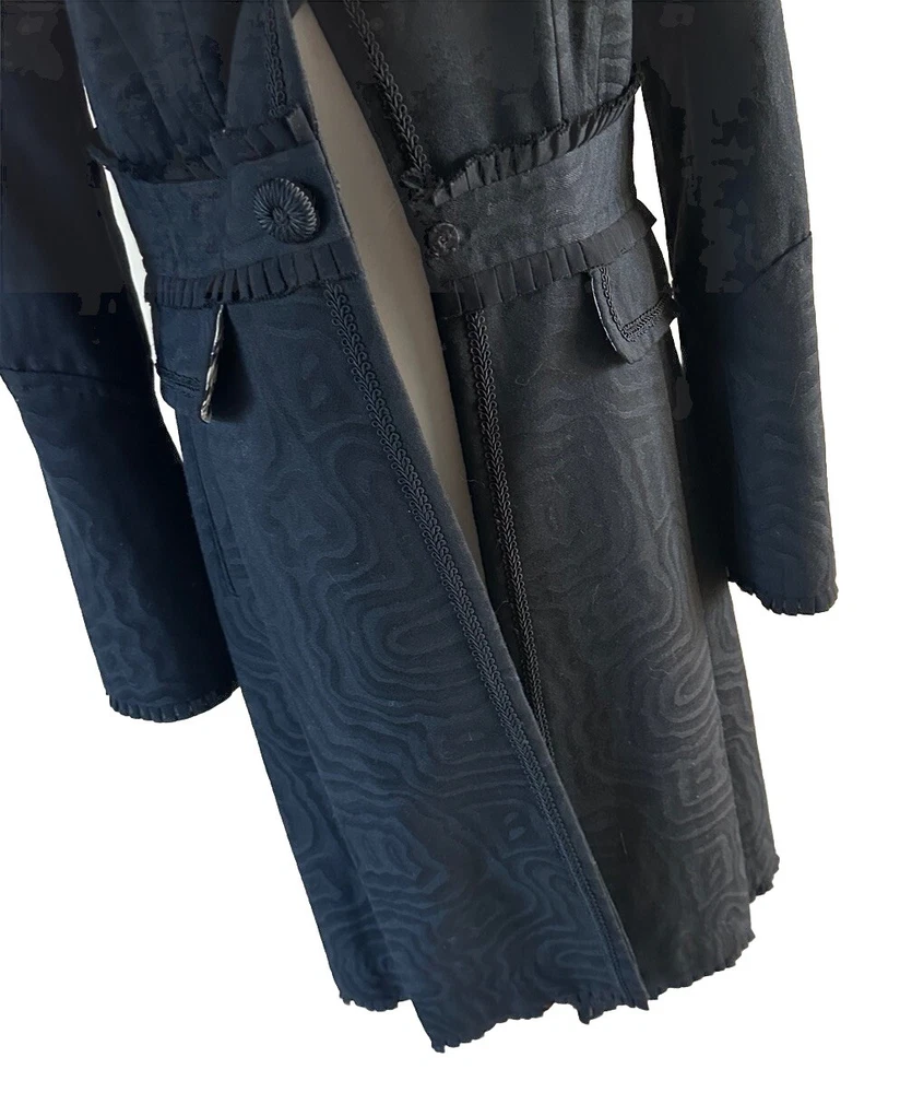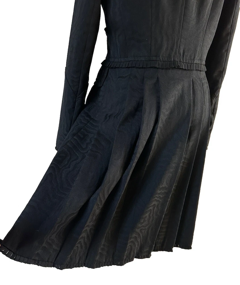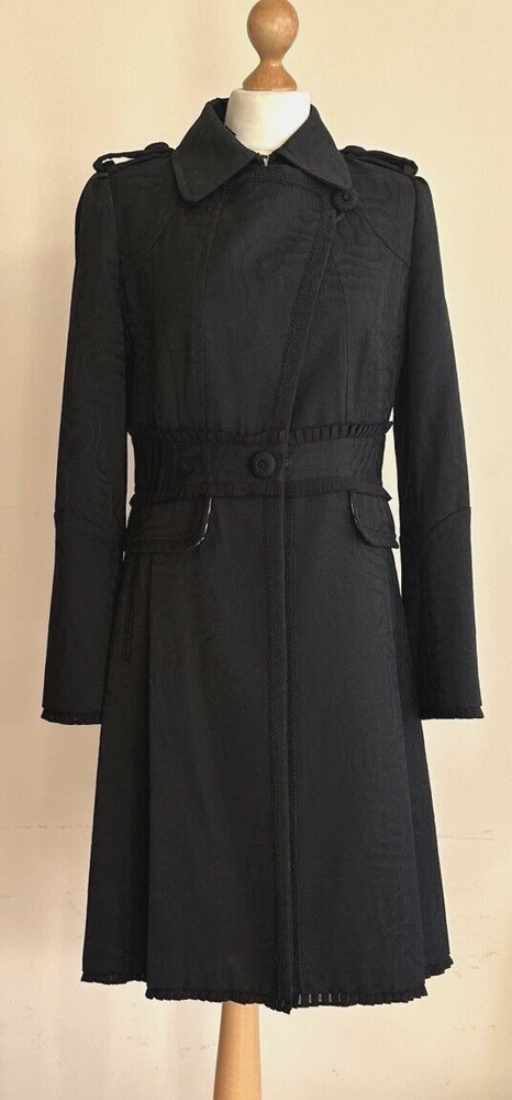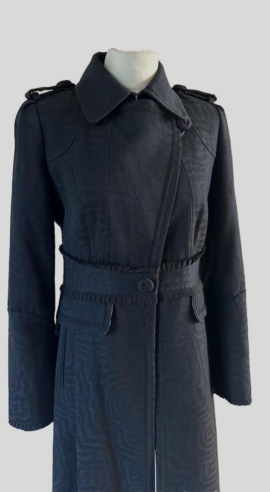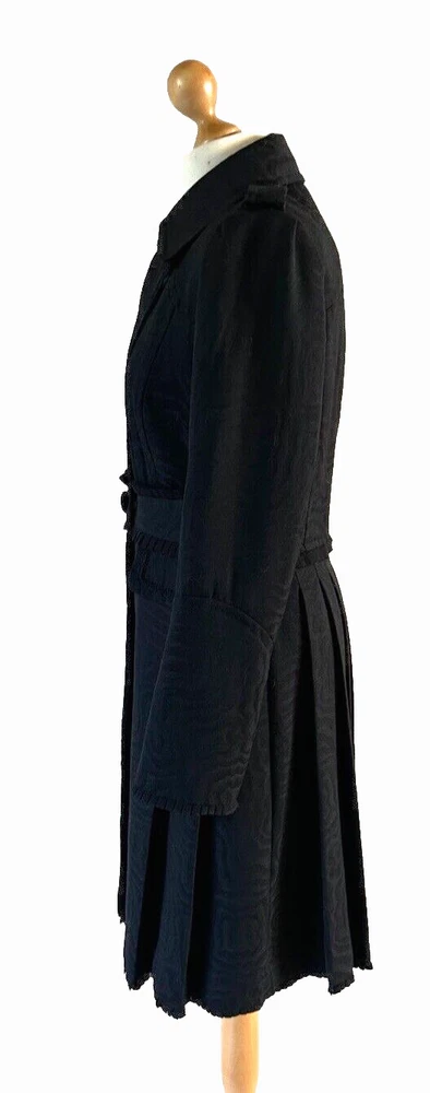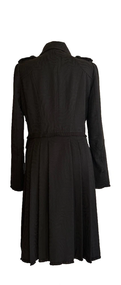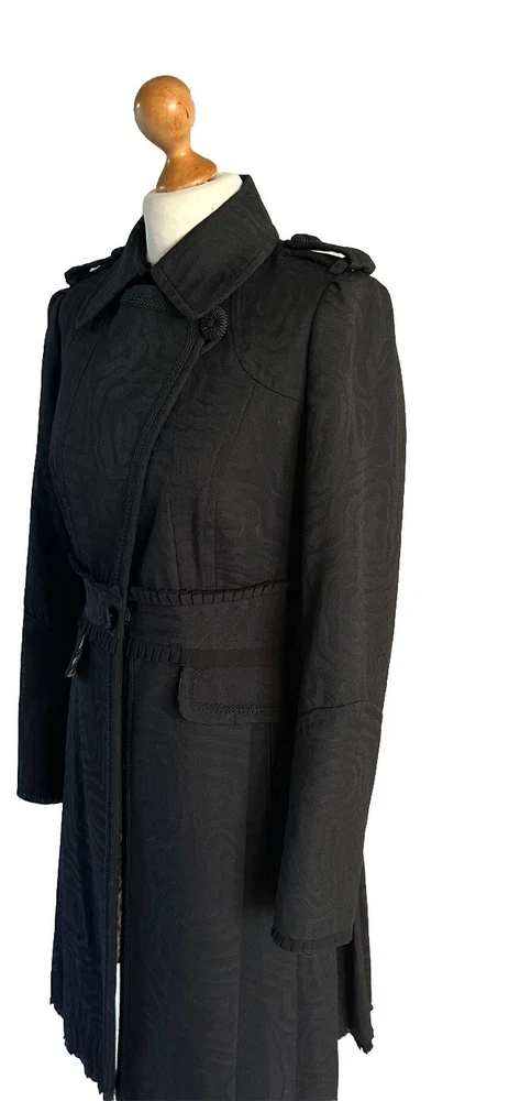 Day Birger et Mikkelsen black brocade embellished pleated coat dress. This is an absolutely gorgeous piece by Danish designer Day Birger et Mikkelsen which is really hard to find. It probably dates from around the early to mid 2000s. There are so many lovely details on it with passementerie braiding trims and buttons, A pleated skirt section. An asymmetric button fastening so coat can be worn buttoned up with a high collar or can be worn open with collars. A pretty waist band seam section with fine pleated ribbon edging finished with an internal concealed press popper fastening and a passementerie style button on the outer. A fine brocade finish patterned fabric believed to be wool mix . Fine pleated ribbon trims at cuffs, hems, waist band section. A swirling print to the satin lining with fine pleated ribbon trim inside.Two mock flap pockets with satin lining on reverse. Two slant side pockets concealed at sides of pleats. Size: To best fit a size small or a UK8 to 10/US4-6 approximately. Quite a fitted waist band seam design. Measurements can be provided. Excellent vintage condition. Day Birger et Mikkelsen brand labels in neckline and at side. No marks stains or damage apparent. It’s in really great shape for its age. It is absolutely beautiful. No returns. Courier shipping.International buyers please check whether customs entry charges will apply in your country at the point of delivery. Please see my other items.