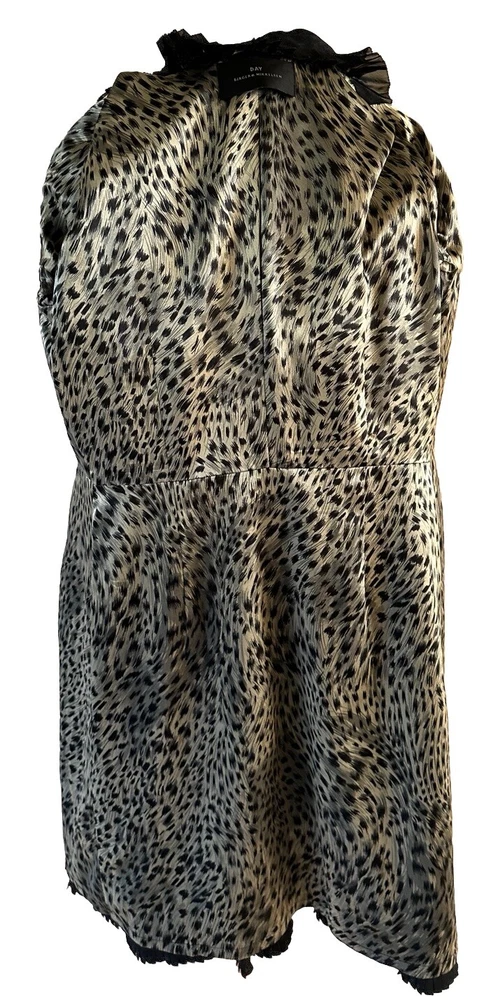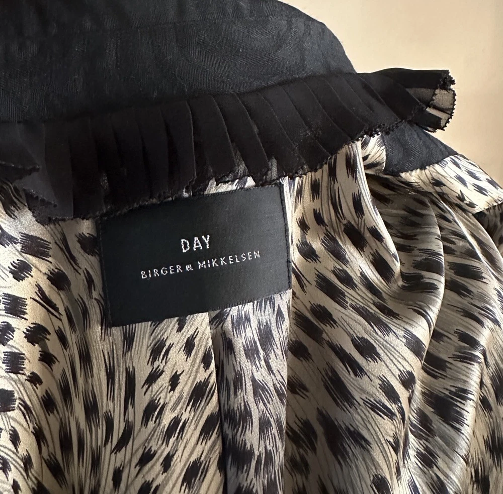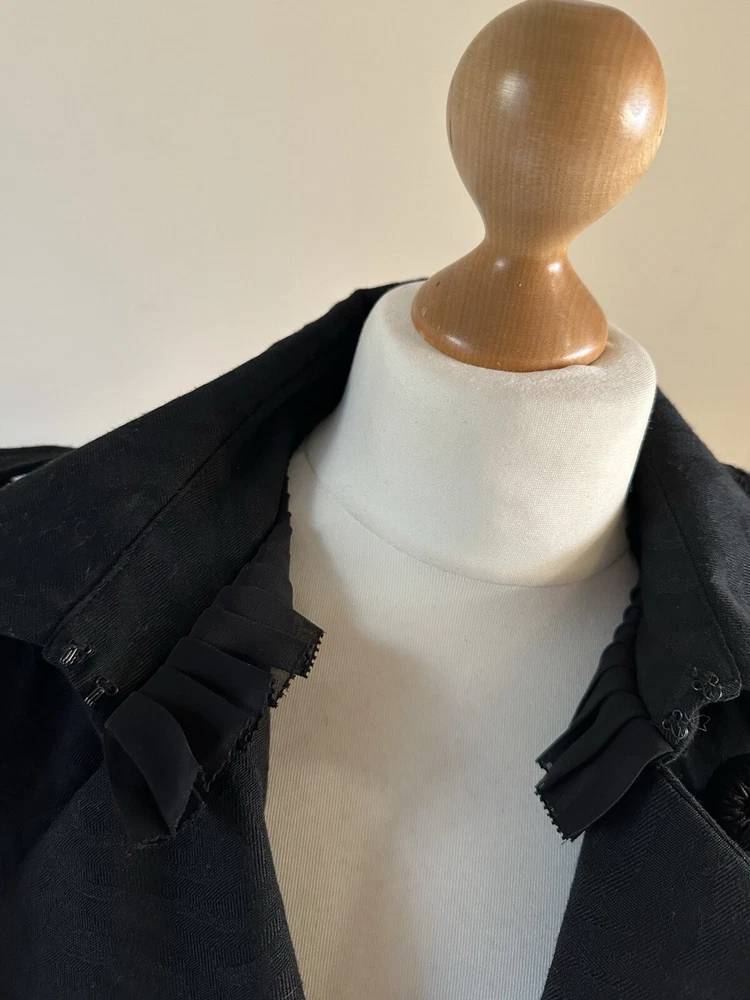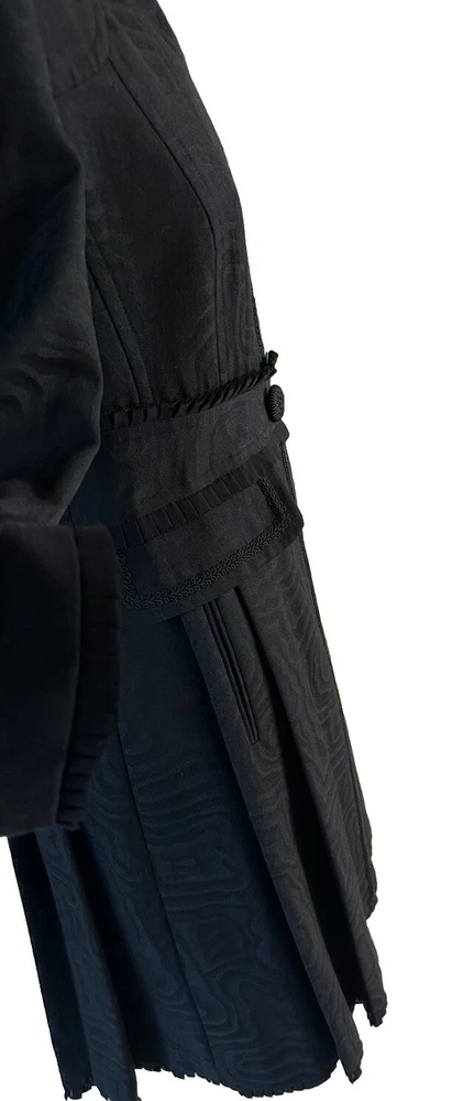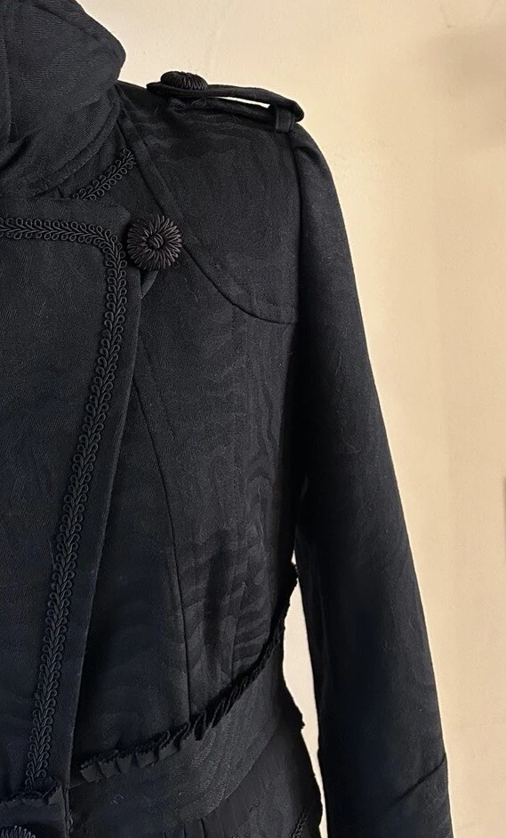 Day Birger et Mikkelsen black brocade embellished pleated coat dress. This is an absolutely gorgeous piece by Danish designer Day Birger et Mikkelsen which is really hard to find. It probably dates from around the early to mid 2000s. There are so many lovely details on it with passementerie braiding trims and buttons, A pleated skirt section. An asymmetric button fastening so coat can be worn buttoned up with a high collar or can be worn open with collars. A pretty waist band seam section with fine pleated ribbon edging finished with an internal concealed press popper fastening and a passementerie style button on the outer. A fine brocade finish patterned fabric believed to be wool mix . Fine pleated ribbon trims at cuffs, hems, waist band section. A swirling print to the satin lining with fine pleated ribbon trim inside.Two mock flap pockets with satin lining on reverse. Two slant side pockets concealed at sides of pleats. Size: To best fit a size small or a UK8 to 10/US4-6 approximately. Quite a fitted waist band seam design. Measurements can be provided. Excellent vintage condition. Day Birger et Mikkelsen brand labels in neckline and at side. No marks stains or damage apparent. It’s in really great shape for its age. It is absolutely beautiful. No returns. Courier shipping.International buyers please check whether customs entry charges will apply in your country at the point of delivery. Please see my other items.