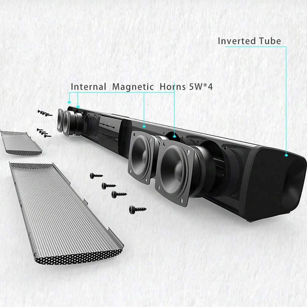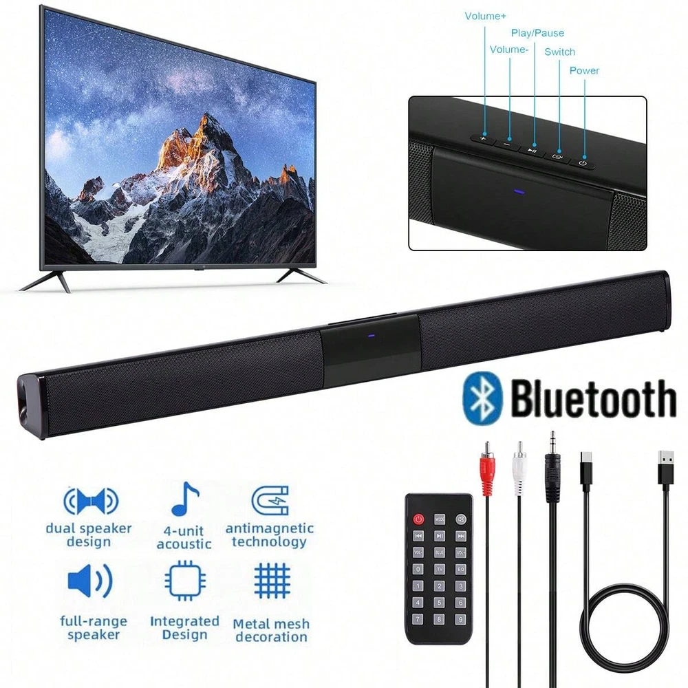 Feature: [4 Full Range Speakers]This Sound bar uses the new generation of acoustic design and living room surround sound solution to provides users with an immersive viewing experience. And sound from 4 full-range speakers will satisfy all your sound quality needs and fill your entire living room! [Portable & Pocket Size] The portable bluetooth speaker has a tiny compact size that you can move it around with you. Portable for the office, study, bedroom, living room, kitchen, at home or away. It is also convenient to put in pocket or backbag for travel and other outdoor activities. [Upgraded Bluetooth 5.0 Signal]Ortizan wireless bluetooth speaker can normally connect the device from 33 unobstructed feets away even under difficult conditions and the signal is not disturbed. The bluetooth 5.0 chip easily reads music play list, and connect any devices such as smartphone, TV and laptop. [Multiple Connection] The TV sound bar also have 3.5mm Audio, SD Card and RCA inputs, which gives you more options when connecting with a variety of home theater devices such as TVs, laptops, desktop computers, projectors. [Button and Remote control] The soundbar supports both button and remote control. Remote control not only provides you with great convenience, but also offers you three EQ modes (Movie, Music, New). Specification: Bluetooth version: V5.0 Battery type: 18650 polymer battery Battery capacity: 2000mA Use time: about 3.5 hours Output power: 4 ohm*5W Frequency response: 20Hz-20KHz Transmission frequency range: 2.402G-2.480G Signal to noise ratio: ±80db Transmission distance: 8-10m Charging type: microUSB 5V/1.5A Size: 550*50*50mm/approx.21.65*1.96*1.96 inch Package included: 1 x Speaker 1 x Remote Control 1 x USB Charging Cable 1 x RCA Audio Cable 1 x English Manual