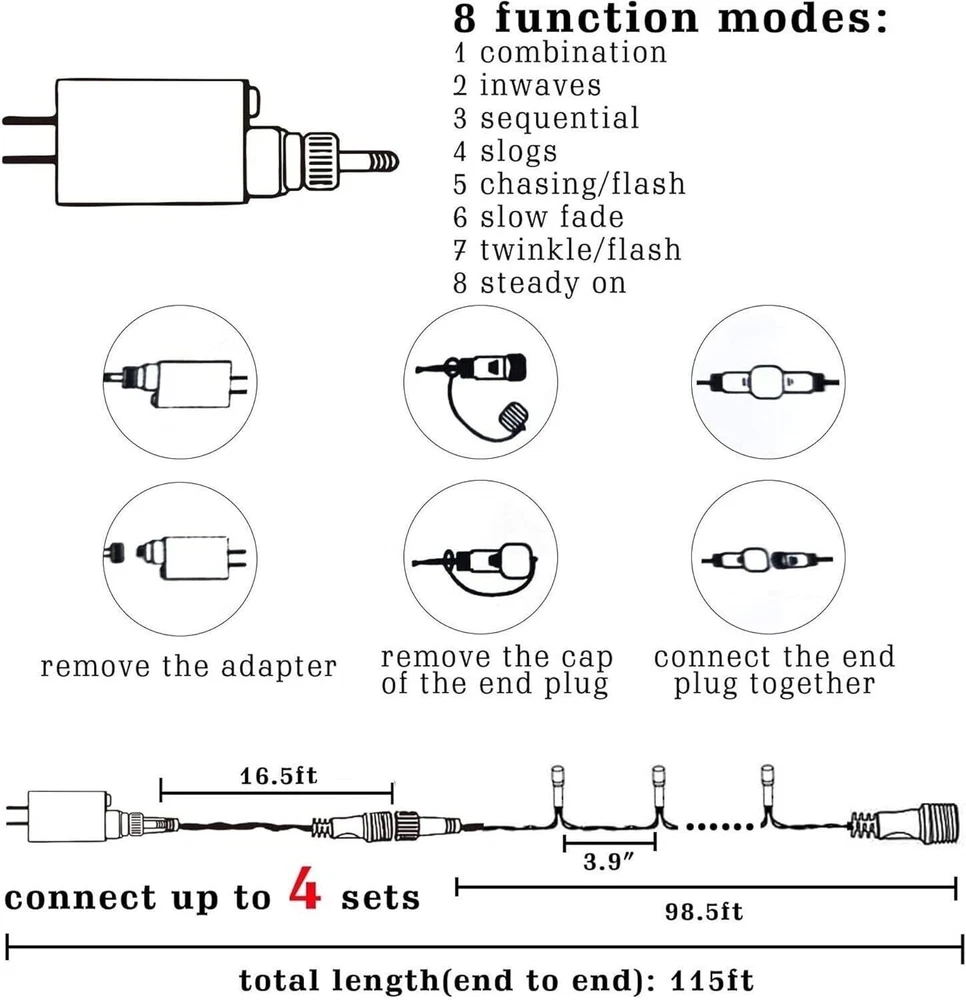 Dazzle Bright 300 LED Christmas String Lights, 100 FT Connectable Waterproof Str Charming Xmas Lights: Christmas 300 LED string lights, use UL-certified 29V low-voltage plugs to ensure the safe use of the product. The outdoor Christmas lights has 16.5 FT leading wire, and the light string is 98.5 FT, total length is 115 FT, the bulb spacing is 3.9 inch. The string light using green wire, which looks more natural and suitable for winter using. 8 Modes: Dazzle Bright 300 LED string lights with 8 light modes: combination, in waves, sequential, slogs, chasing/flash, slow fade, twinkle/flash, by pressing the button on the plug to change the mode, using different pattern to fit different application require. Connectable: Can connect up to 4 light strings (Max 1200 LED), connect according to the size of the scene you need to decorate, to meet the needs of various venue decorations to the greatest extent. Decorating your home with Dazzle Bright fairy string lights, creating a romantic festival vibe, enjoy the pleasure festive holiday with your family. Safety & Waterproof & Low Loss: 29V low voltage guarantees safety, the string lights has IP44 waterproof grade, the switch can be controlled by plugging and unplugging the power supply, and the energy-saving materials used can save a lot of energy. Perfect Christmas Decoration: The multicolored color of Dazzle Bright 300 LED string lights can decorate your room, garden and courtyard well on Christmas, very suitable for Xmas party scenes, holidays, performances, hotels, parks, restaurants. ---Charming Xmas Lights: Christmas 300 LED string lights, use UL-certified 29V low-voltage plugs to ensure the safe use of the product. The outdoor Christmas lights has 16.5 FT leading wire, and the light string is 98.5 FT, total length is 115 FT, the bulb spacing is 3.9 inch. The string light using green wire, which looks more natural and suitable for winter using. ---8 Modes: Dazzle Bright 300 LED string lights with 8 light modes: combination, in waves, sequential, slogs, chasing/flash, slow fade, twinkle/flash, by pressing the button on the plug to change the mode, using different pattern to fit different application require. ---Connectable: Can connect up to 4 light strings (Max 1200 LED), connect according to the size of the scene you need to decorate, to meet the needs of various venue decorations to the greatest extent. Decorating your home with Dazzle Bright fairy string lights, creating a romantic festival vibe, enjoy the pleasure festive holiday with your family. ---Safety & Waterproof & Low Loss: 29V low voltage guarantees safety, the string lights has IP44 waterproof grade, the switch can be controlled by plugging and unplugging the power supply, and the energy-saving materials used can save a lot of energy. ---Perfect Christmas Decoration: The multicolored color of Dazzle Bright 300 LED string lights can decorate your room, garden and courtyard well on Christmas, very suitable for Xmas party scenes, holidays, performances, hotels, parks, restaurants. Dazzle Bright 300 LED Christmas String Lights, 100 FT Connectable Waterproof Str Charming Xmas Lights: Christmas 300 LED string lights, use UL-certified 29V low-voltage plugs to ensure the safe use of the product. The outdoor Christmas lights has 16.5 FT leading wire, and the light string is 98.5 FT, total length is 115 FT, the bulb spacing is 3.9 inch. The string light using green wire, which looks more natural and suitable for winter using. 8 Modes: Dazzle Bright 300 LED string lights with 8 light modes: combination, in waves, sequential, slogs, chasing/flash, slow fade, twinkle/flash, by pressing the button on the plug to change the mode, using different pattern to fit different application require. Connectable: Can connect up to 4 light strings (Max 1200 LED), connect according to the size of the scene you need to decorate, to meet the needs of various venue decorations to the greatest extent. Decorating your home with Dazzle Bright fairy string lights, creating a romantic festival vibe, enjoy the pleasure festive holiday with your family. Safety & Waterproof & Low Loss: 29V low voltage guarantees safety, the string lights has IP44 waterproof grade, the switch can be controlled by plugging and unplugging the power supply, and the energy-saving materials used can save a lot of energy. Perfect Christmas Decoration: The multicolored color of Dazzle Bright 300 LED string lights can decorate your room, garden and courtyard well on Christmas, very suitable for Xmas party scenes, holidays, performances, hotels, parks, restaurants. Charming Xmas Lights: Christmas 300 LED string lights, use UL-certified 29V low-voltage plugs to ensure the safe use of the product. The outdoor Christmas lights has 16.5 FT leading wire, and the light string is 98.5 FT, total length is 115 FT, the bulb spacing is 3.9 inch. The string light using green wire, which looks more natural and suitable for winter using. 8 Modes: Dazzle Bright 300 LED string lights with 8 light modes: combination, in waves, sequential, slogs, chasing/flash, slow fade, twinkle/flash, by pressing the button on the plug to change the mode, using different pattern to fit different application require. Connectable: Can connect up to 4 light strings (Max 1200 LED), connect according to the size of the scene you need to decorate, to meet the needs of various venue decorations to the greatest extent. Decorating your home with Dazzle Bright fairy string lights, creating a romantic festival vibe, enjoy the pleasure festive holiday with your family. Safety & Waterproof & Low Loss: 29V low voltage guarantees safety, the string lights has IP44 waterproof grade, the switch can be controlled by plugging and unplugging the power supply, and the energy-saving materials used can save a lot of energy. Perfect Christmas Decoration: The multicolored color of Dazzle Bright 300 LED string lights can decorate your room, garden and courtyard well on Christmas, very suitable for Xm