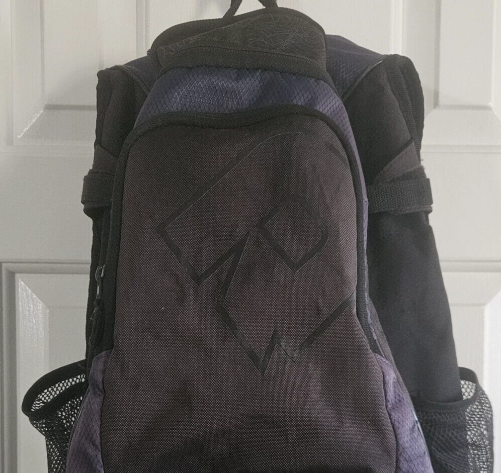 DeMarini Backpack Overall good pre-owned condition, few scratches on bottom and small hole on bottom on exterior mesh water bottle pocket Main compartment has divider. Also another large compartment with zipper, smaller compartment with zipper in front and small zipped pocket for keys and small items on top near handle, mesh pockets on each side with hook and loop strap above it (to hold bats). Color is charcoal/black with blue/purple snakeskin accents, material feels like a vinyl canvas Padded along surface worn against back Measures about 22 inches in length, 13 inches wide, and can expand to 10 inches deep